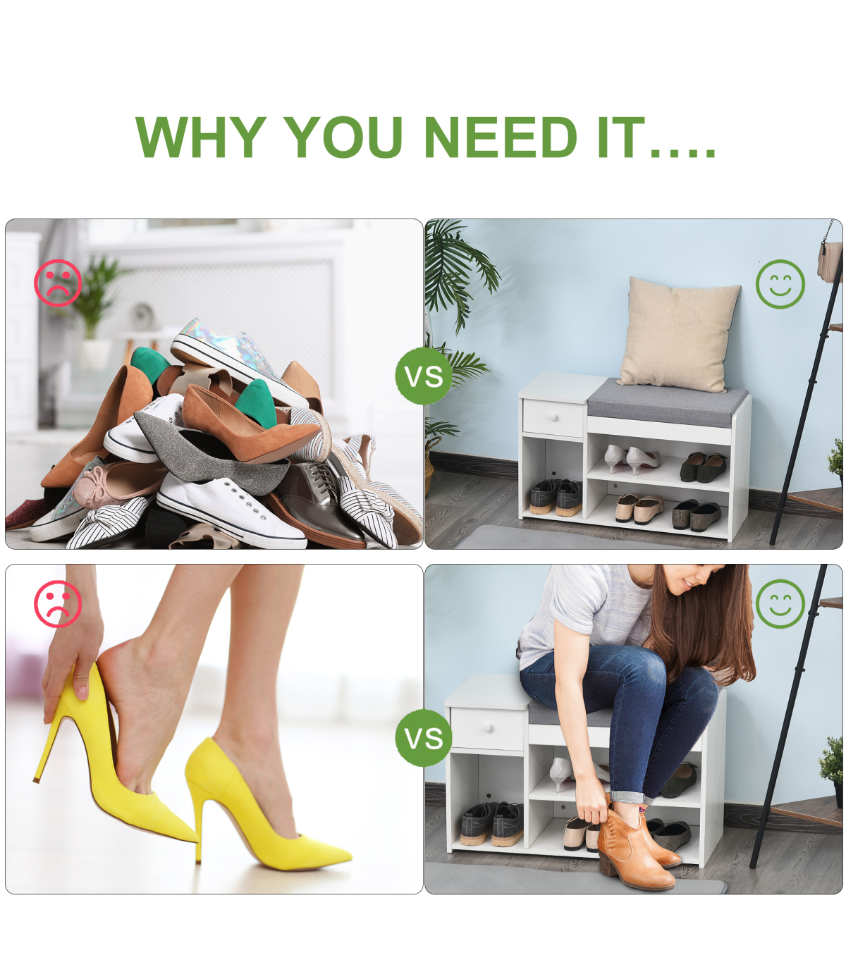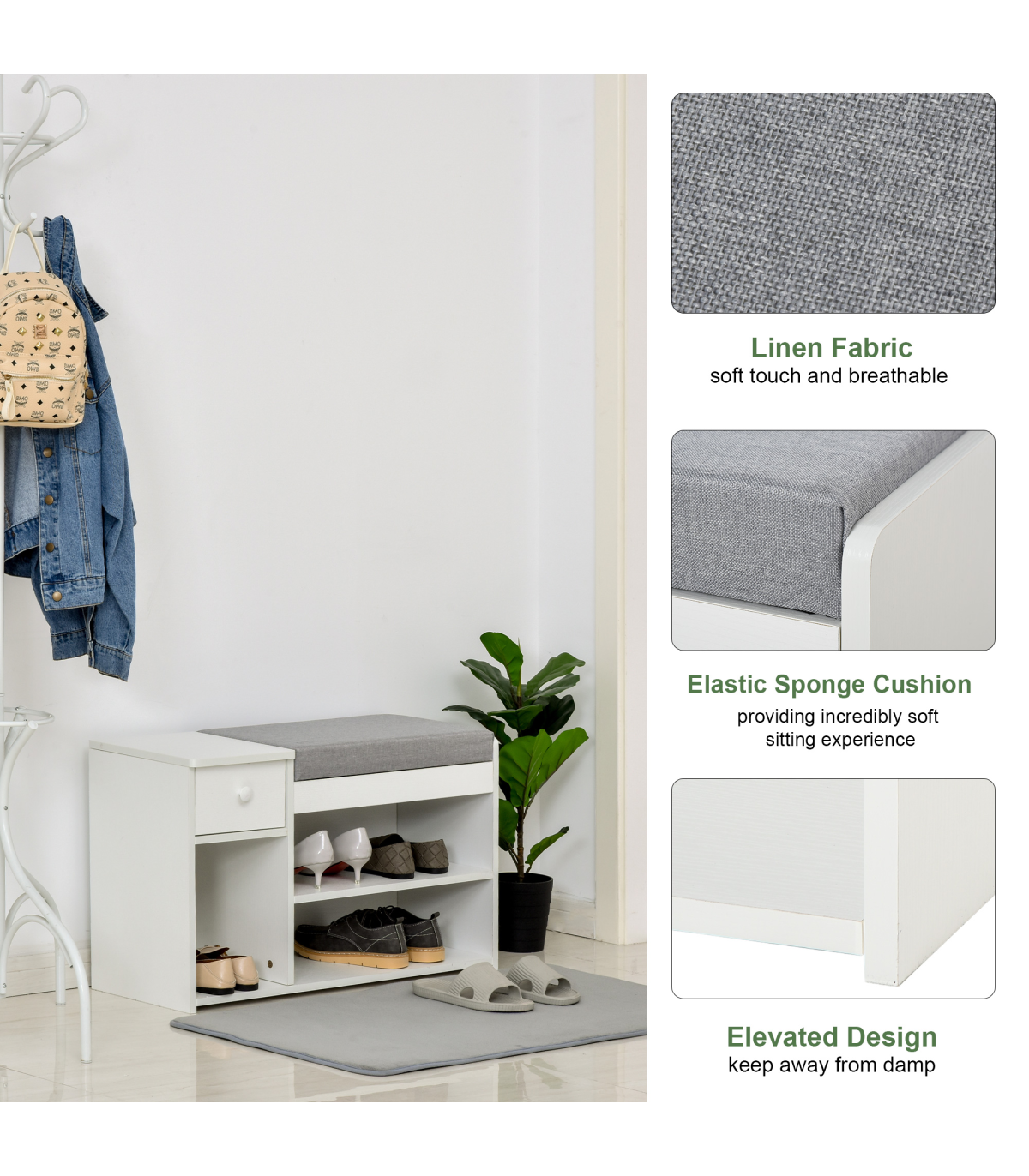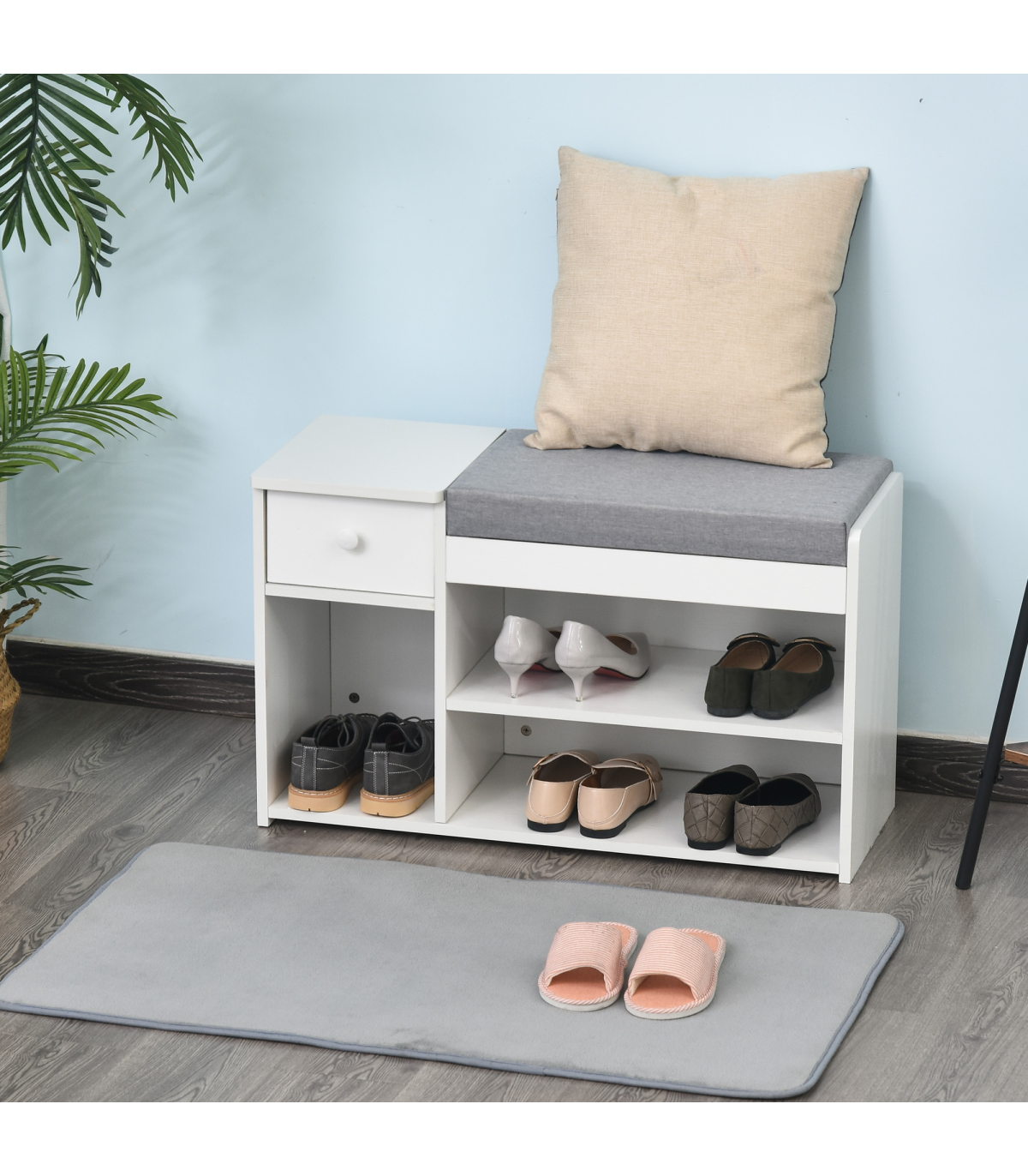 DUO DESIGN: Blends together lots of storage into a bench with a cushioned section. Allows storage of shoes and boots, and provides a place to sit whilst putting them on.STURDY: Made from a blend of particle board and MDF, ensuring the structure is tough and durable for continual everyday use.TOP CUSHION: Filled with sponge and wrapped in linen, it allows you to sit comfortably whilst putting shoes on/taking them off. Linen is smooth, breathable and easy to clean.SPACIOUS: Features three open compartments for shoes and boots and a top drawer for storage of smaller items - keys, cards, shoe polish. Small handle on drawer for easier opening and closing. DIMENSIONS: 49H x 81L x 31.5Wcm. Top cushion: 6H x 53L x 30.8Wcm.MAXIMUM LOAD 150KG. ASSEMBLY REQUIRED.