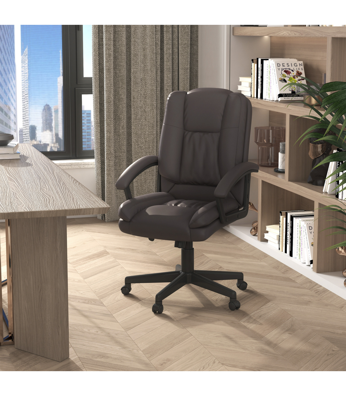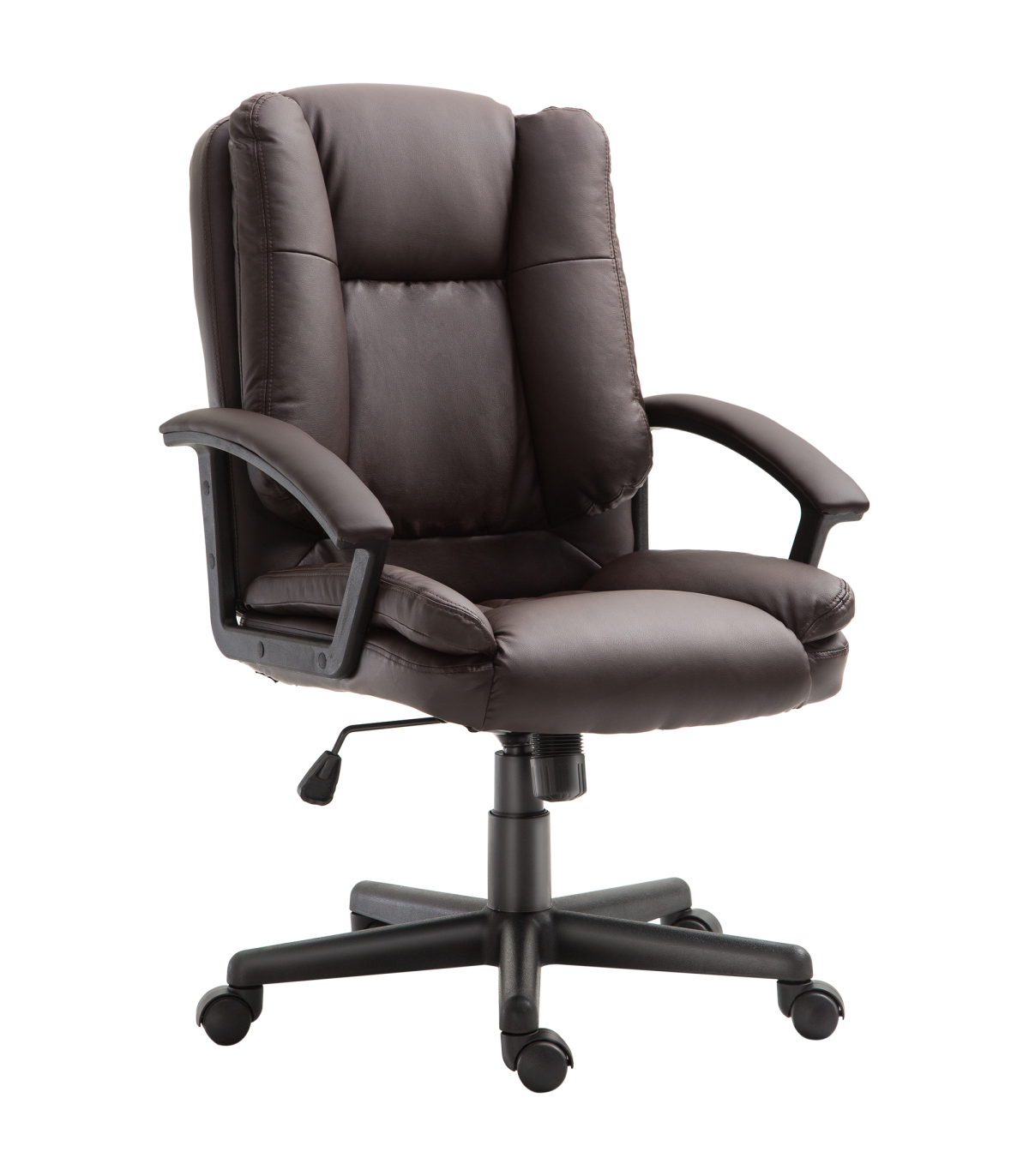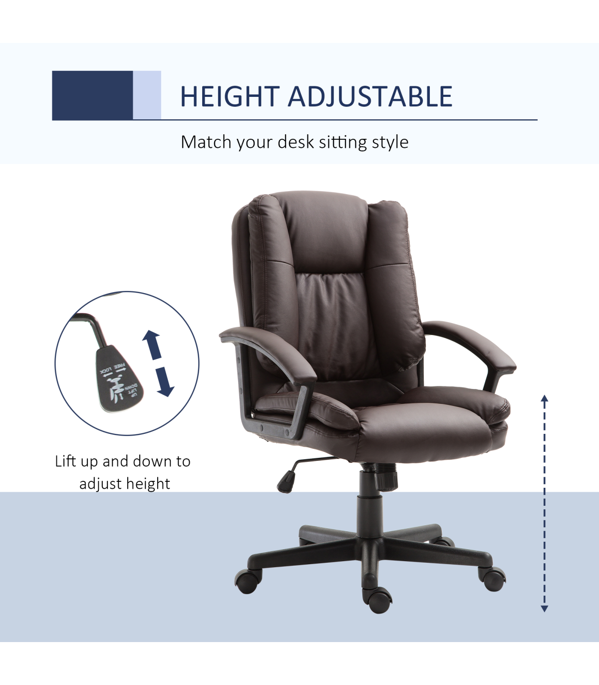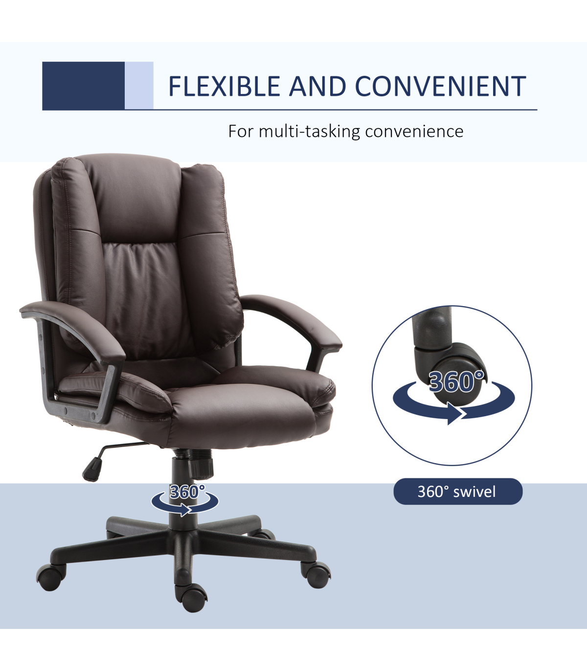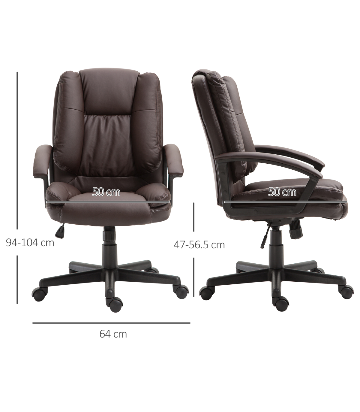- "Swivel Executive Office Chair Mid Back PU Leather Chair with Arm, Brown HOMCOM" - Description: - Ergonomic Design: The PU leather office chair features an ergonomic high-backrest line and a thick sponge padding seat covered in faux leather, providing extra comfort for long periods of work. - Adjustable Comfort: The seat height of the home office chair can be adjusted to match your desk and sitting habits. A high-end gas lift ensures smooth and secure adjustments. - Mobility: The ergonomic office chair has 360-degree swivel wheels and seat, allowing for easy mobility. You can also rock back and forth to stretch your back. - Modern Style: The computer chair is lined with faux leather, creating a luxurious style that is a perfect match for home study or home office. - Dimensions: Overall Dimensions: 67W x 62D x 94-104H (cm), Max Load: 120kg. Assembly is required.