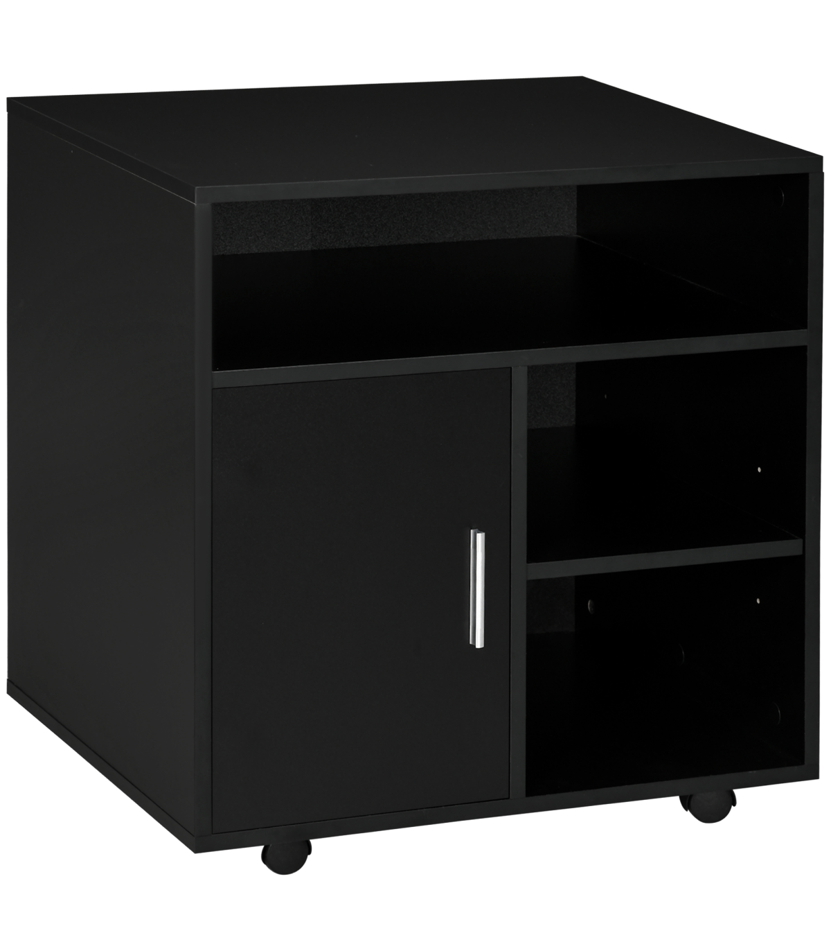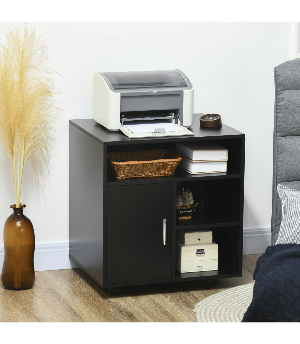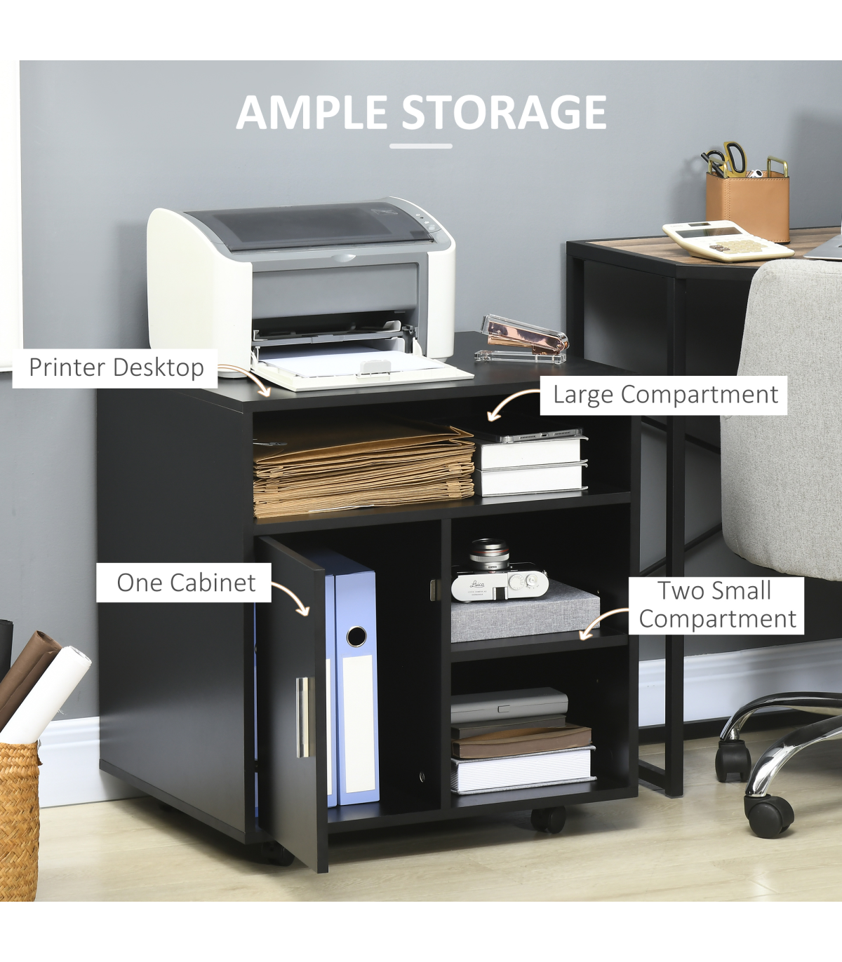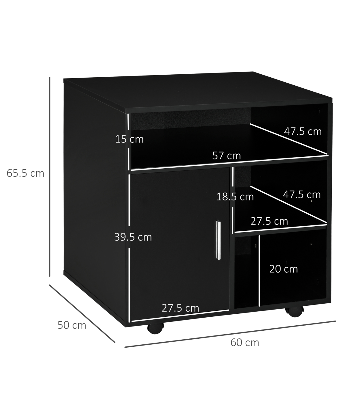 - "Multi-Storage Printer Unit Office Organisation w/ 5 Compartments Black HOMCOM" - Description: - Spacious: Features a large flat tabletop, a wide open compartment, two open shelves, and a bottom cupboard with an adjustable shelf. - Keeps your printer, paper, and other shared office essentials together in the same place. - Sturdy: Made from particle board, the frame is solid and durable for reliable everyday use. - Modern look will look great in all office spaces. - Four Wheels: Castor design for easy movement when needed. Two are lockable to keep the unit in place. - Dimensions: 65.5H x 60W x 50D cm. - Wheels: 4 cm. - MAXIMUM LOAD 60KG. - ASSEMBLY REQUIRED.