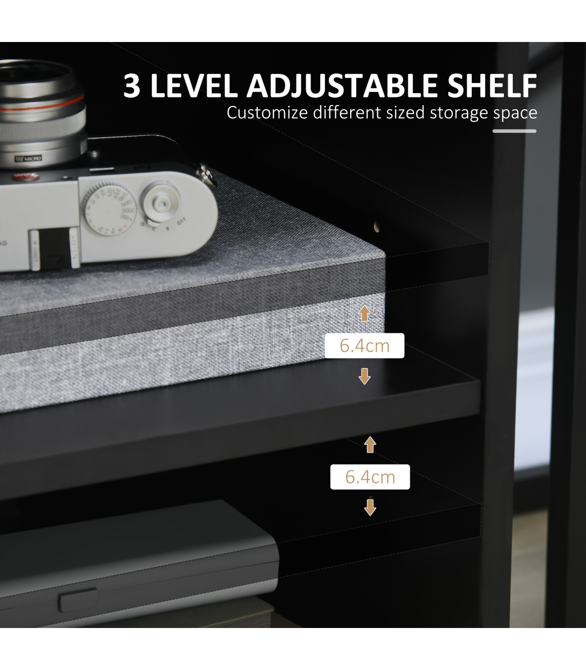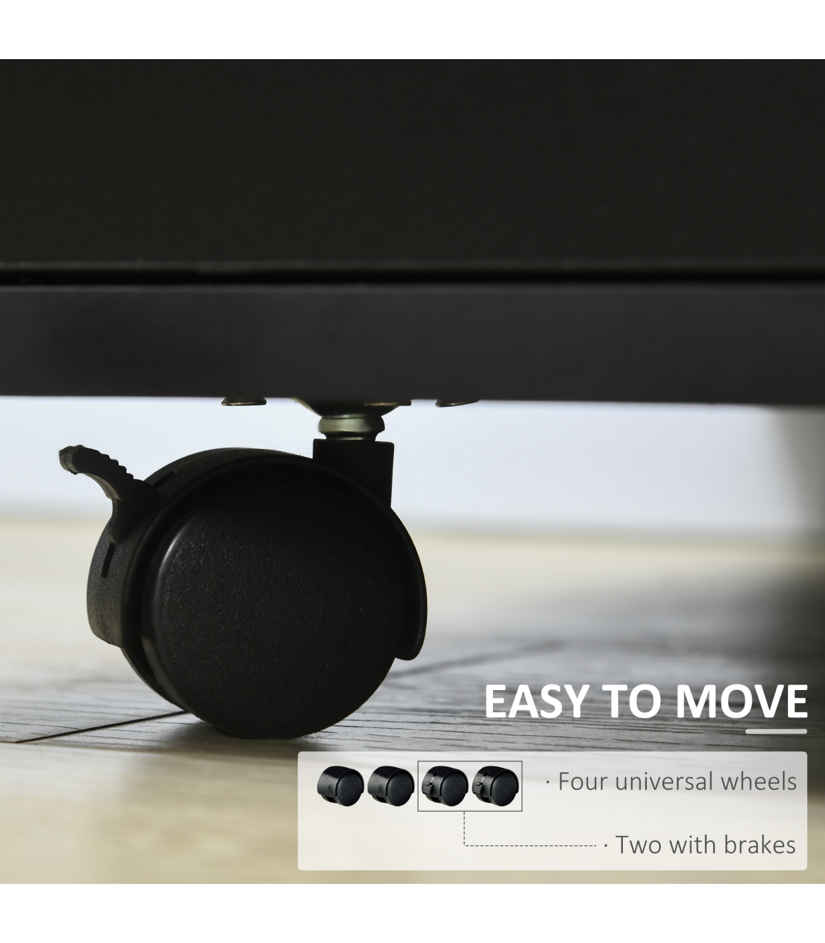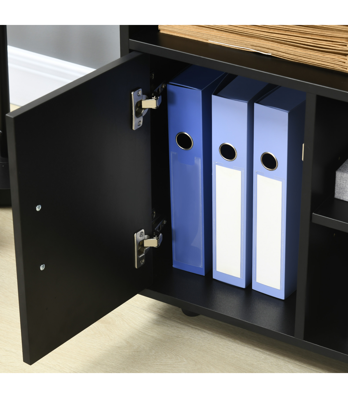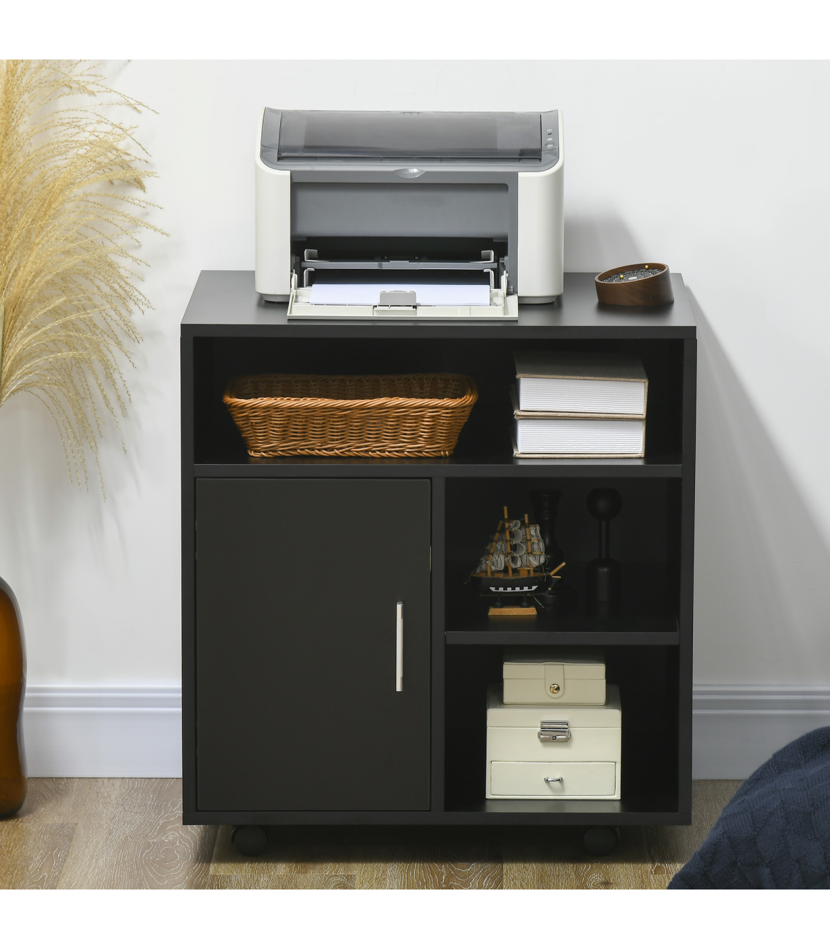 - "Multi-Storage Printer Unit Office Organisation w/ 5 Compartments Black HOMCOM" - Description: - Spacious: Features a large flat tabletop, a wide open compartment, two open shelves, and a bottom cupboard with an adjustable shelf. - Keeps your printer, paper, and other shared office essentials together in the same place. - Sturdy: Made from particle board, the frame is solid and durable for reliable everyday use. - Modern look will look great in all office spaces. - Four Wheels: Castor design for easy movement when needed. Two are lockable to keep the unit in place. - Dimensions: 65.5H x 60W x 50D cm. - Wheels: 4 cm. - MAXIMUM LOAD 60KG. - ASSEMBLY REQUIRED.