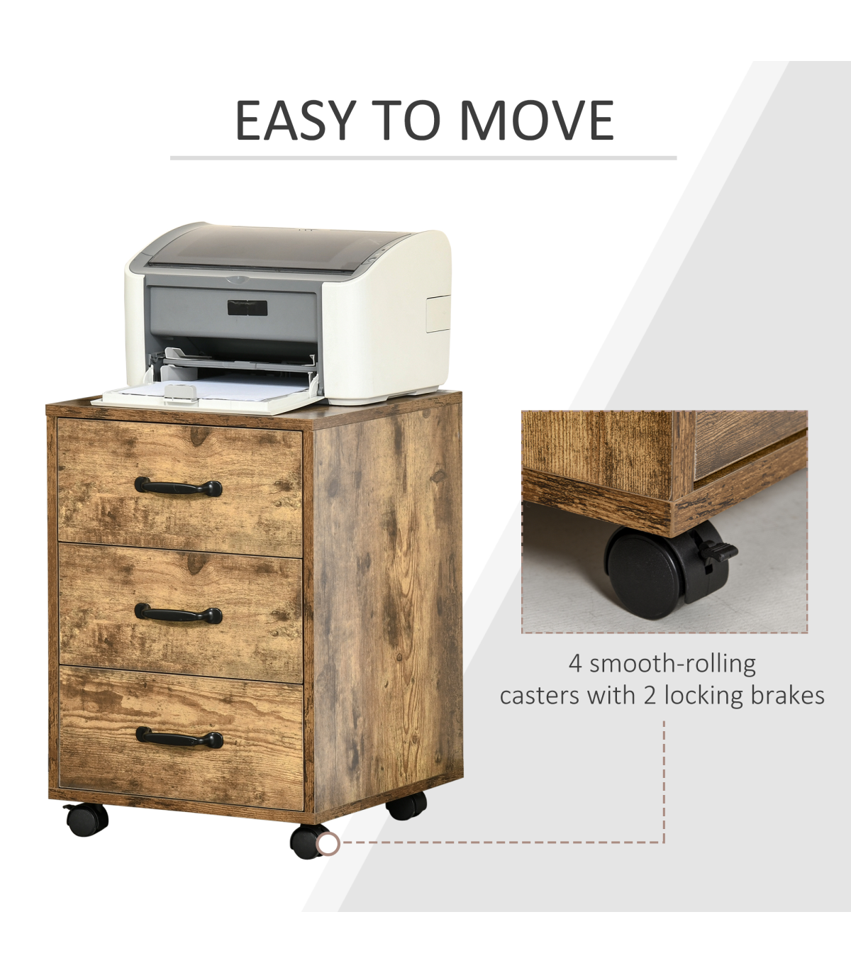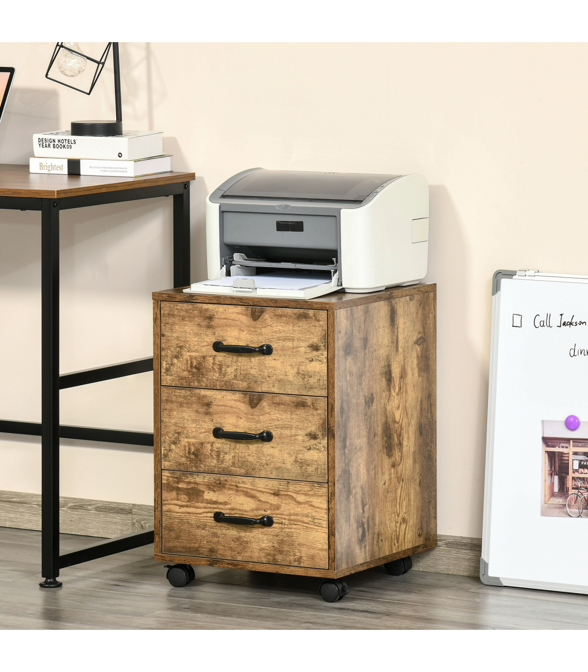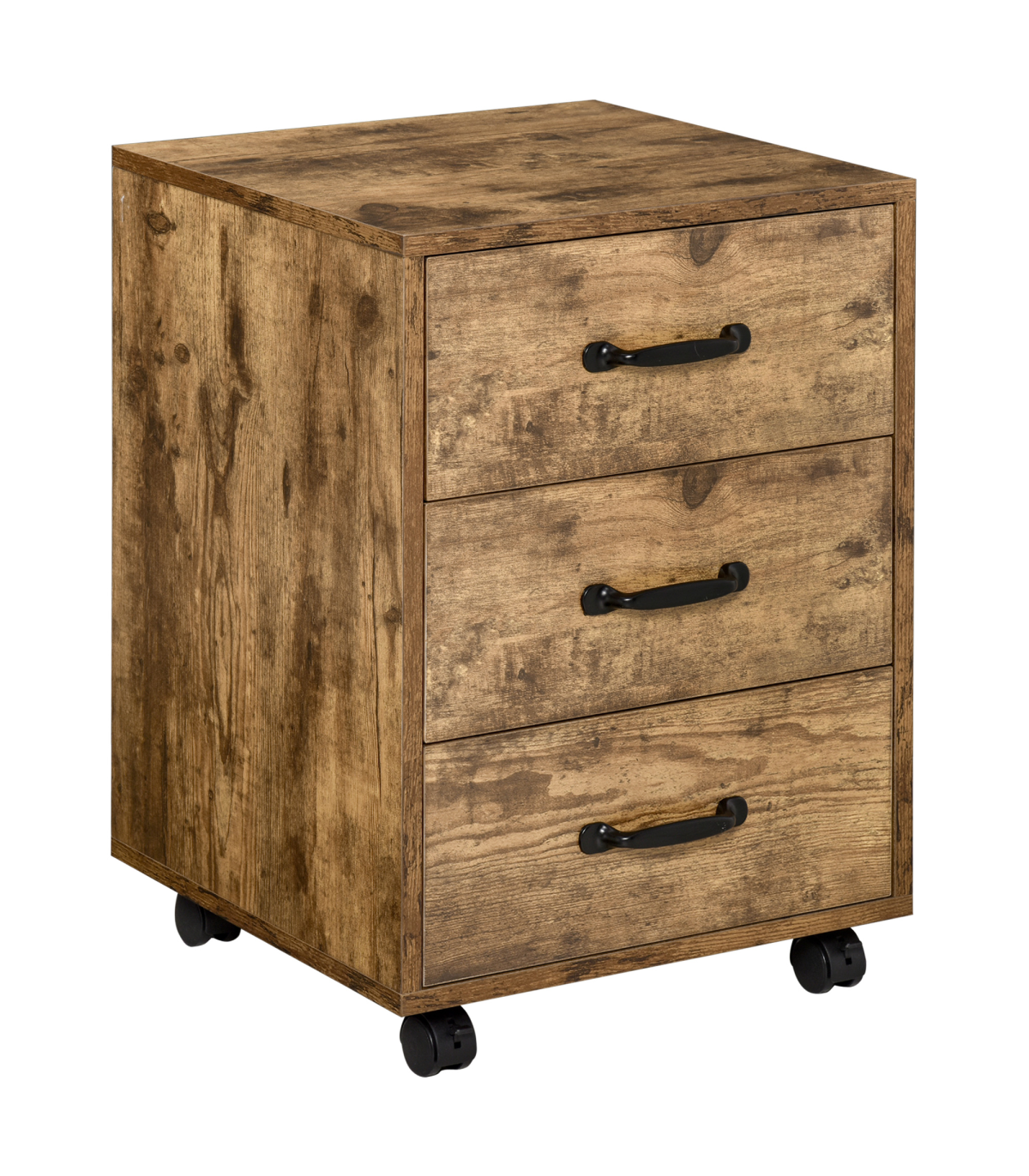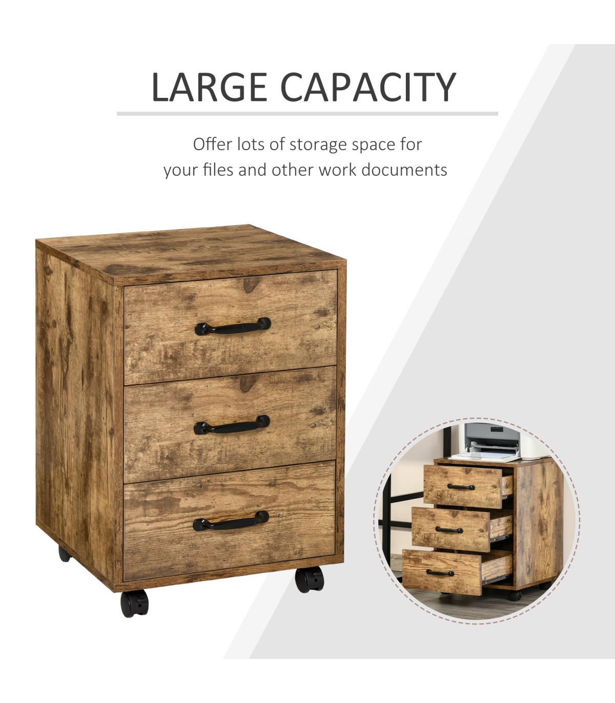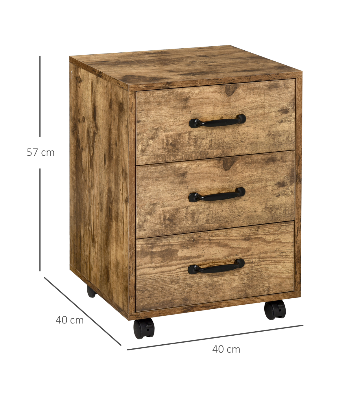 LARGE CAPACITY: This office storage cabinet with 3 drawers is an ideal way to store documents, notebooks, pens, magazines, and other office suppliesFITS UNDER DESKS: This cabinet with compact size, fits under most desks, and with industrial rustic wood grain goes well with home or office decorsEASY MOBILITY: 4 smooth-rolling casters with 2 locking brakes make this file cabinet organizer super simple to move and relocate throughout the office or houseSTEEL SLIDING RAILS: Made of MDF board and steel drawer sliding rails for sturdiness. Let drawers open/close smoothly and quietlyDIMENSIONS: 40L x 40W x 57Hcm. MAXIMUM LOAD 20KG. ASSEMBLY REQUIRED. Please notice that this cabinet is not designed for hanging files, but you can lay them flat