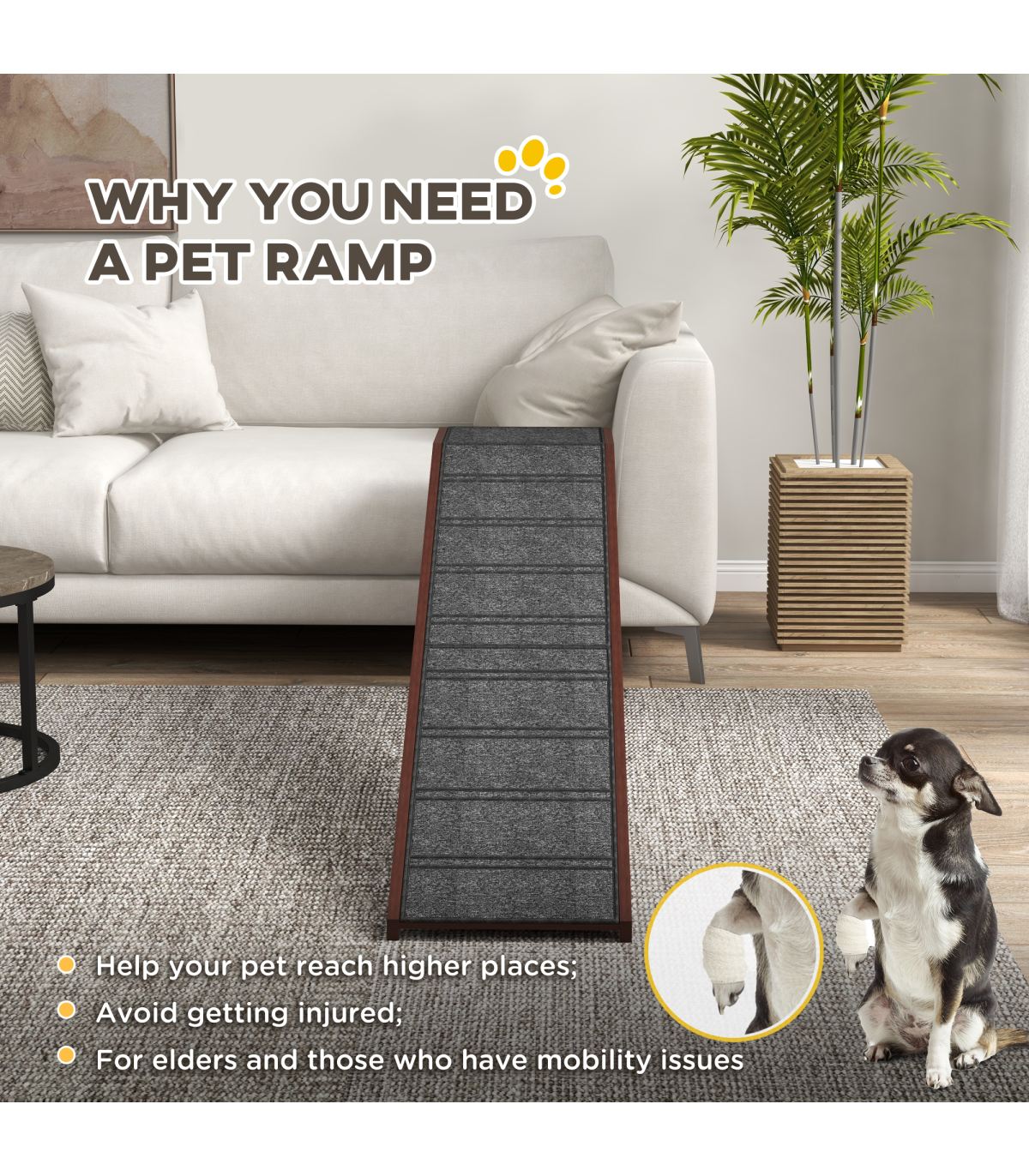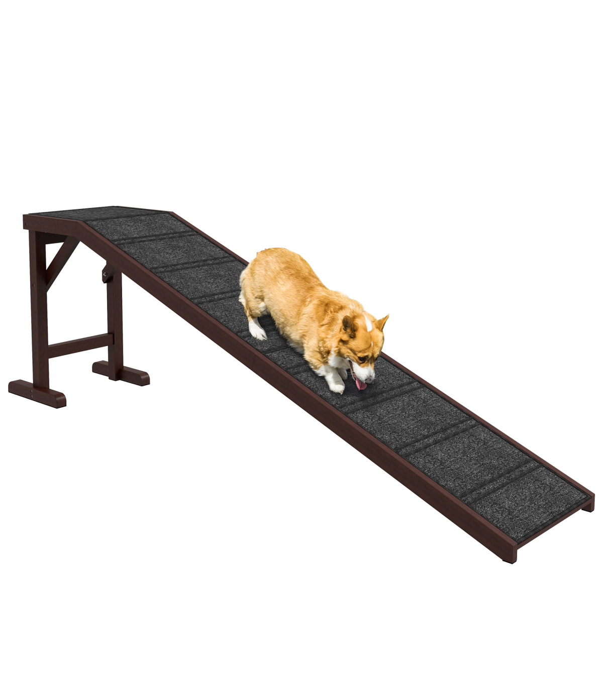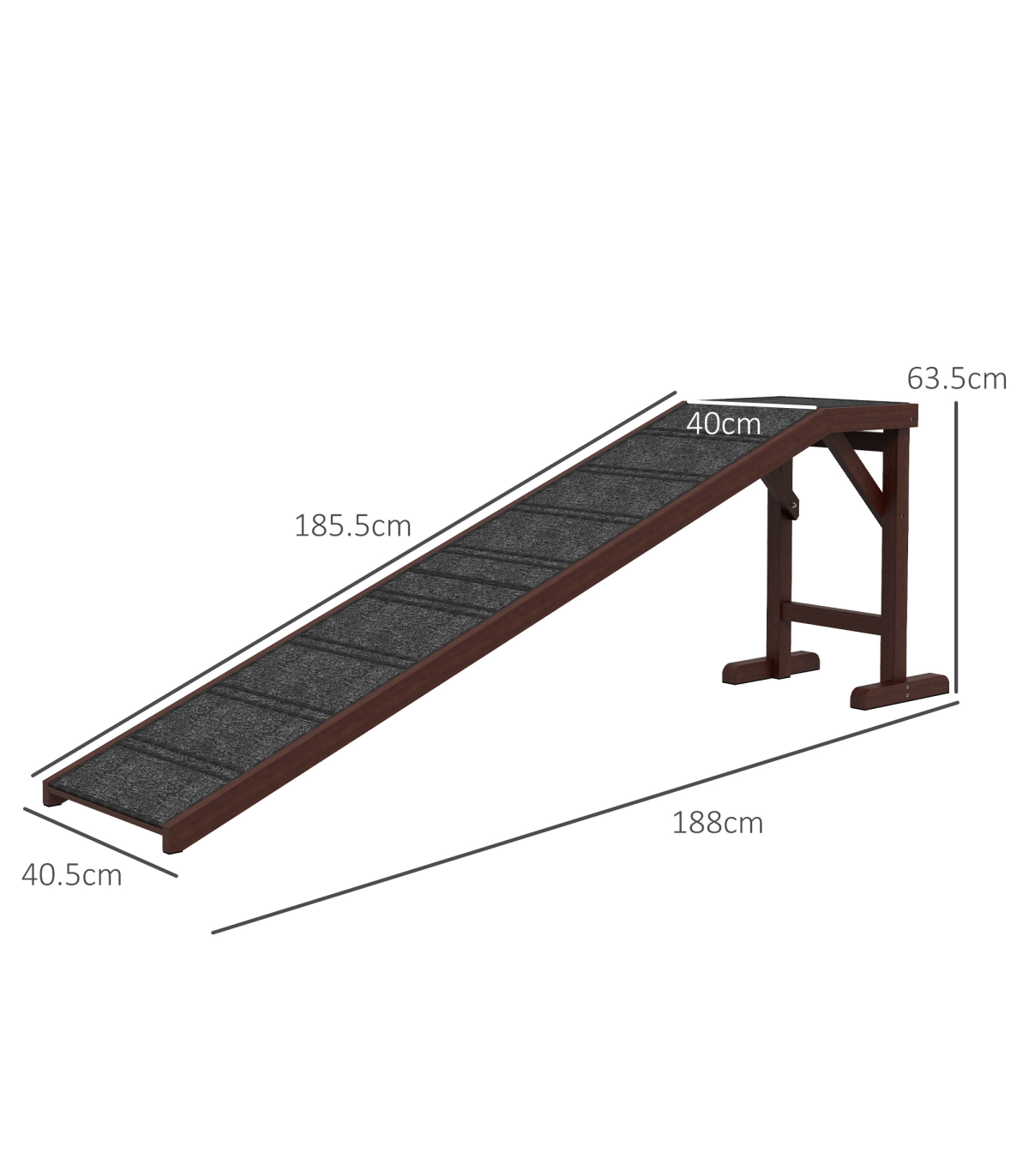 - Pet Ramp for Dogs Cats W/ Non-Slip Carpet for Bed Sofa, 188x40.5x63.5cm Pawhut - Description: - Ideal for Elderly Pets: This ramp helps them reach the sofa and other areas without help - the right accessory for animals with mobility issues. - Safe and Secure: Anti-slip surface prevents pets from having accidents. The platform at the top provides balance - they can also use it to rest. - Solid Material: Made of pine wood, it's a sturdy structure that can be used daily. - Dimensions: - Ramp: 185.5L x 40Wcm - Platform: 40L x 30Wcm - Maximum Load: 35KG - Assembly Required.
