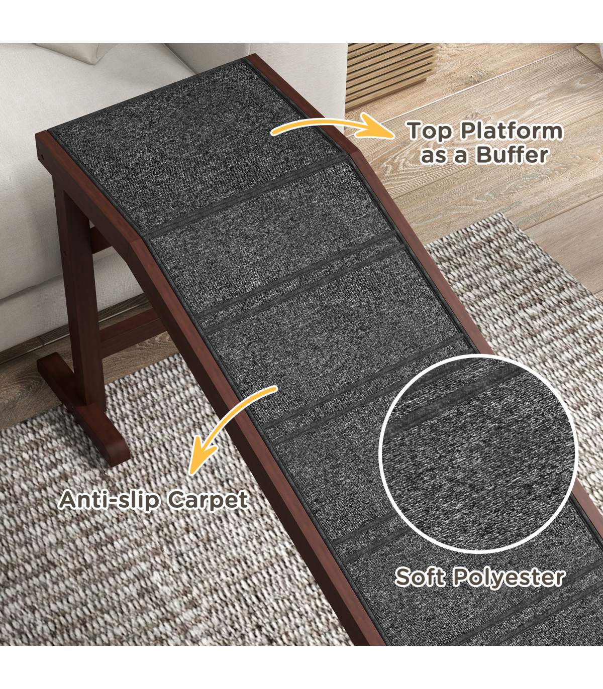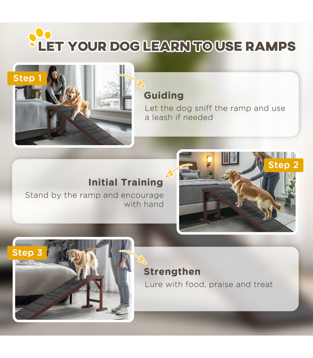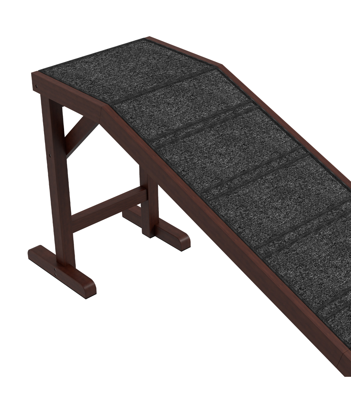 - Pet Ramp for Dogs Cats W/ Non-Slip Carpet for Bed Sofa, 188x40.5x63.5cm Pawhut - Description: - Ideal for Elderly Pets: This ramp helps them reach the sofa and other areas without help - the right accessory for animals with mobility issues. - Safe and Secure: Anti-slip surface prevents pets from having accidents. The platform at the top provides balance - they can also use it to rest. - Solid Material: Made of pine wood, it's a sturdy structure that can be used daily. - Dimensions: - Ramp: 185.5L x 40Wcm - Platform: 40L x 30Wcm - Maximum Load: 35KG - Assembly Required.