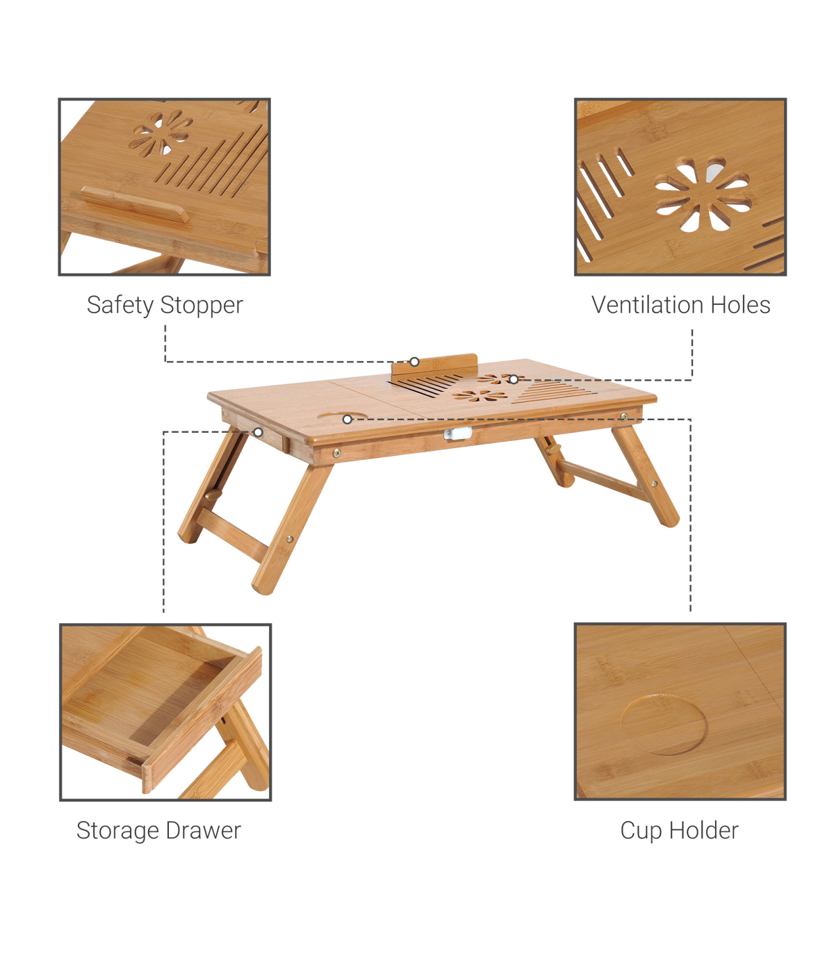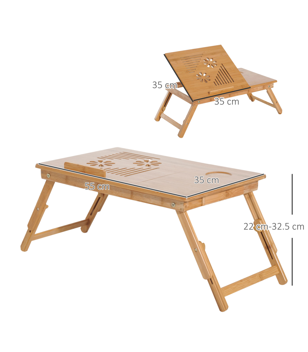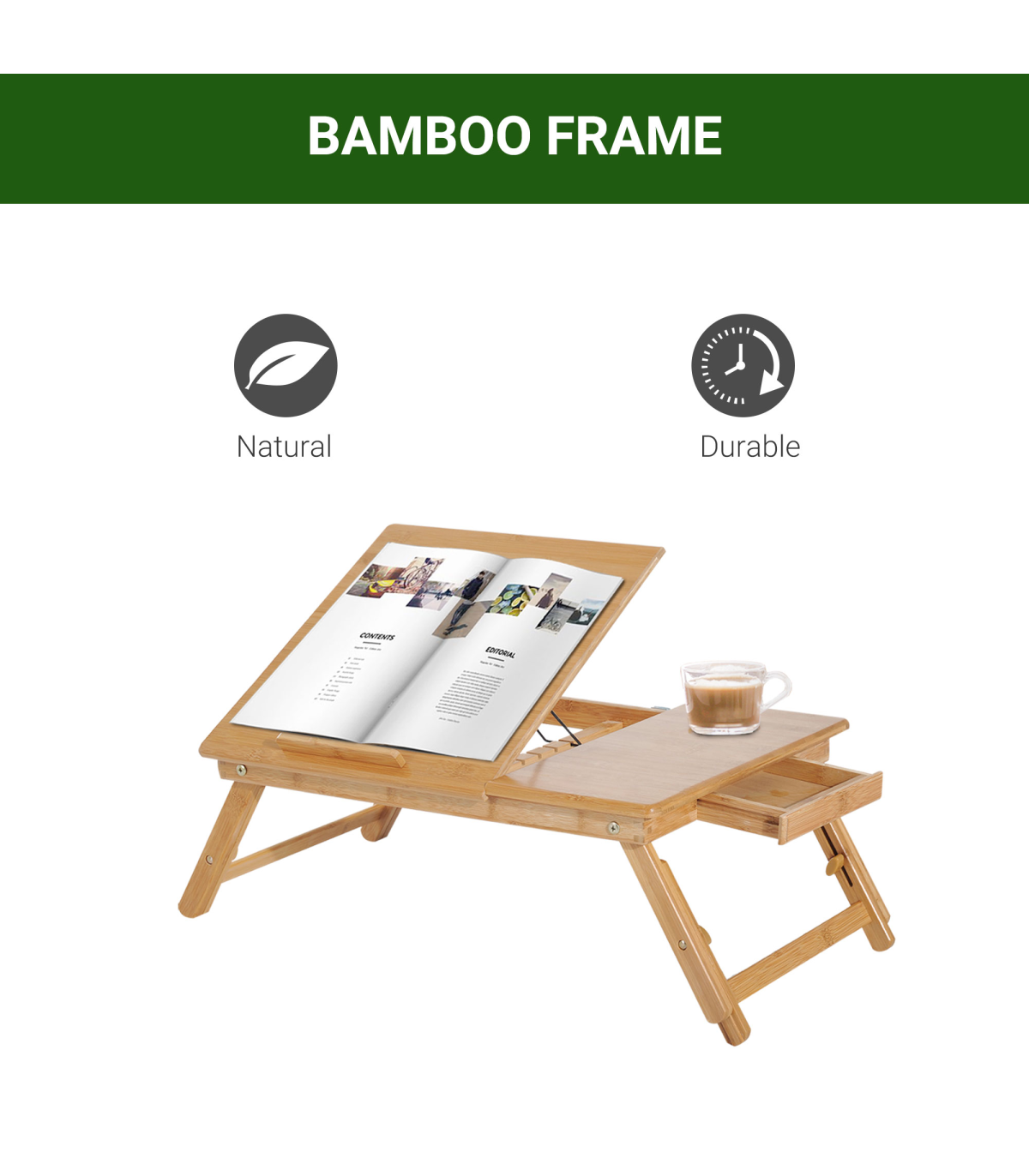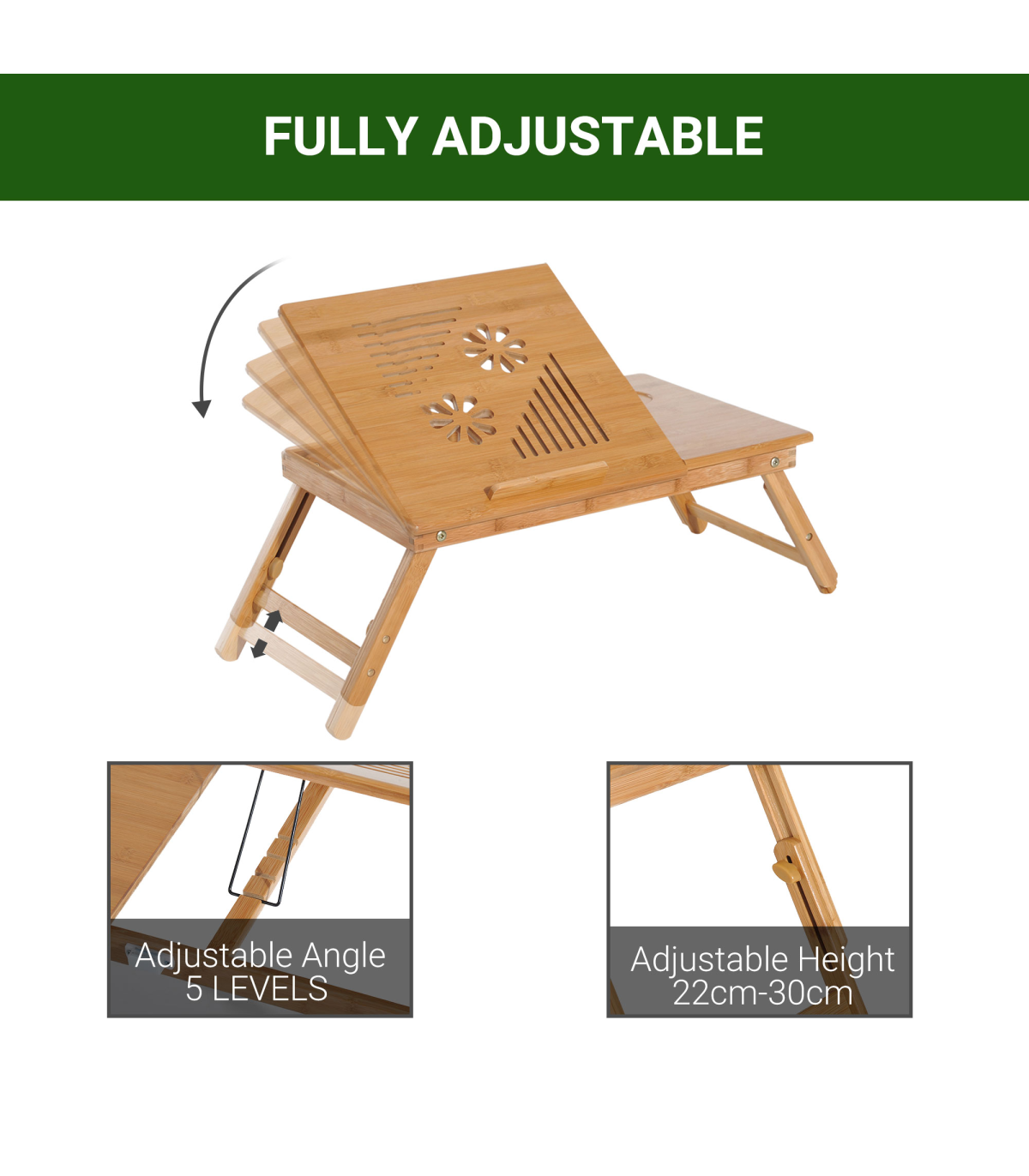 FULLY ADJUSTABLE: The serving bed tray height and tablet holder angle can be adjusted to meet your different requirements.QUALITY MATERIAL: Made of natural bamboo with varnish coating, this lap desk is durable and does no harm to human body.CONSIDERATE DESIGN: Features 1 storage drawer for your small items like pens, wallets and more. You can also put your drinks on the cup slot. Besides, there are ventilation holes on surface for timely heat emission.FOLDABLE DESIGN & MULTIFUNCTIONAL: Foldable and lightweight for easy storage and transport. Can be used as a laptop table or eating food, drawing, reading, doing homework on the bed, sofa, floor, car, etc.DIMENSION: Overall Dimension: 55L x 35W x 22-30H cm, Weight Capacity: 50kg.