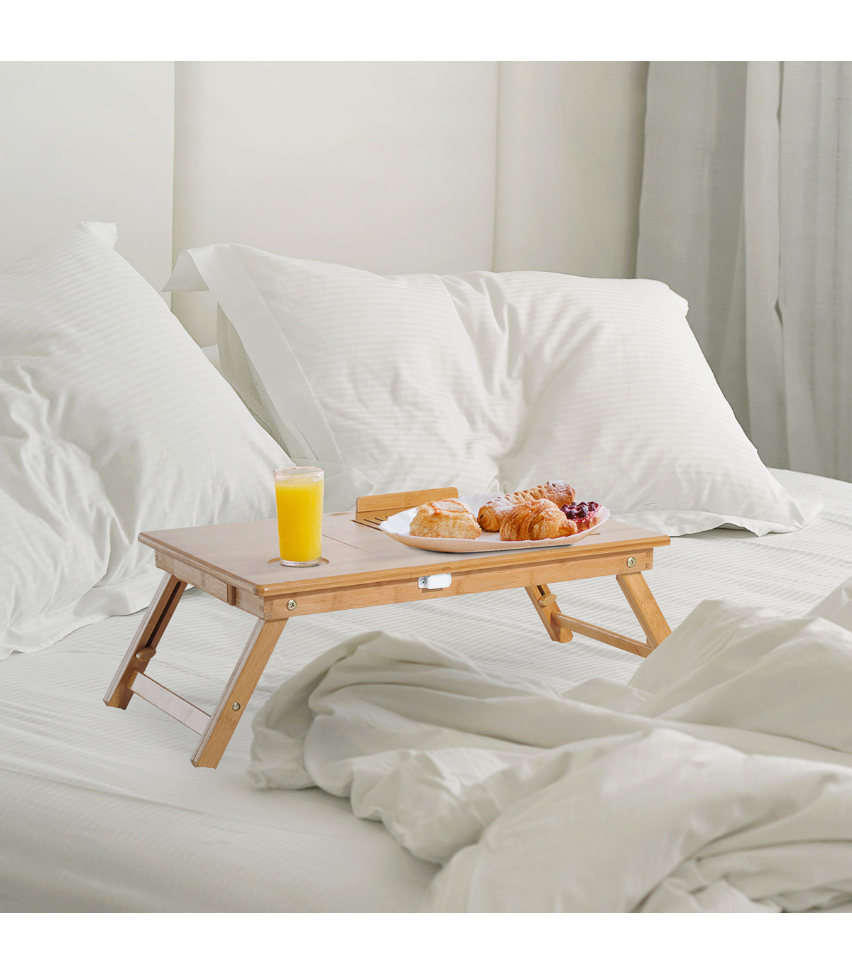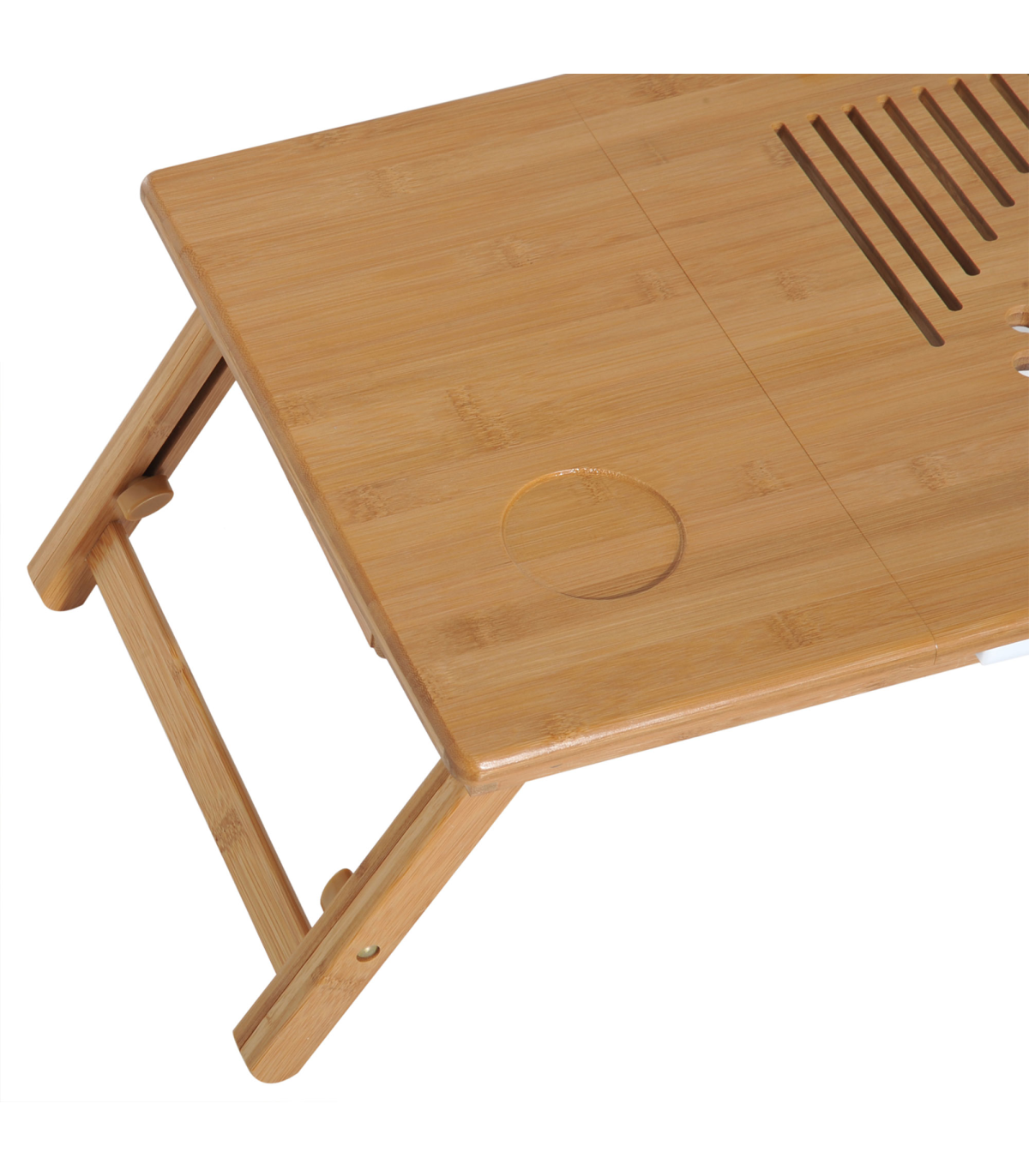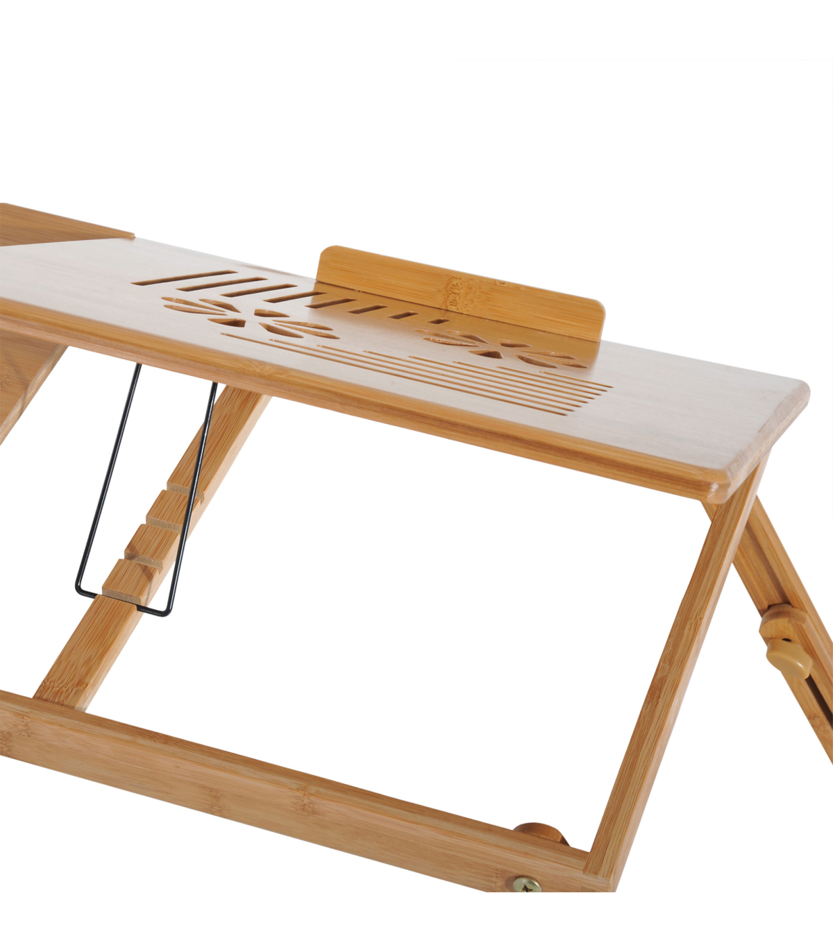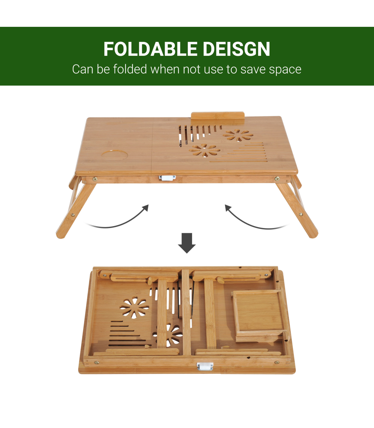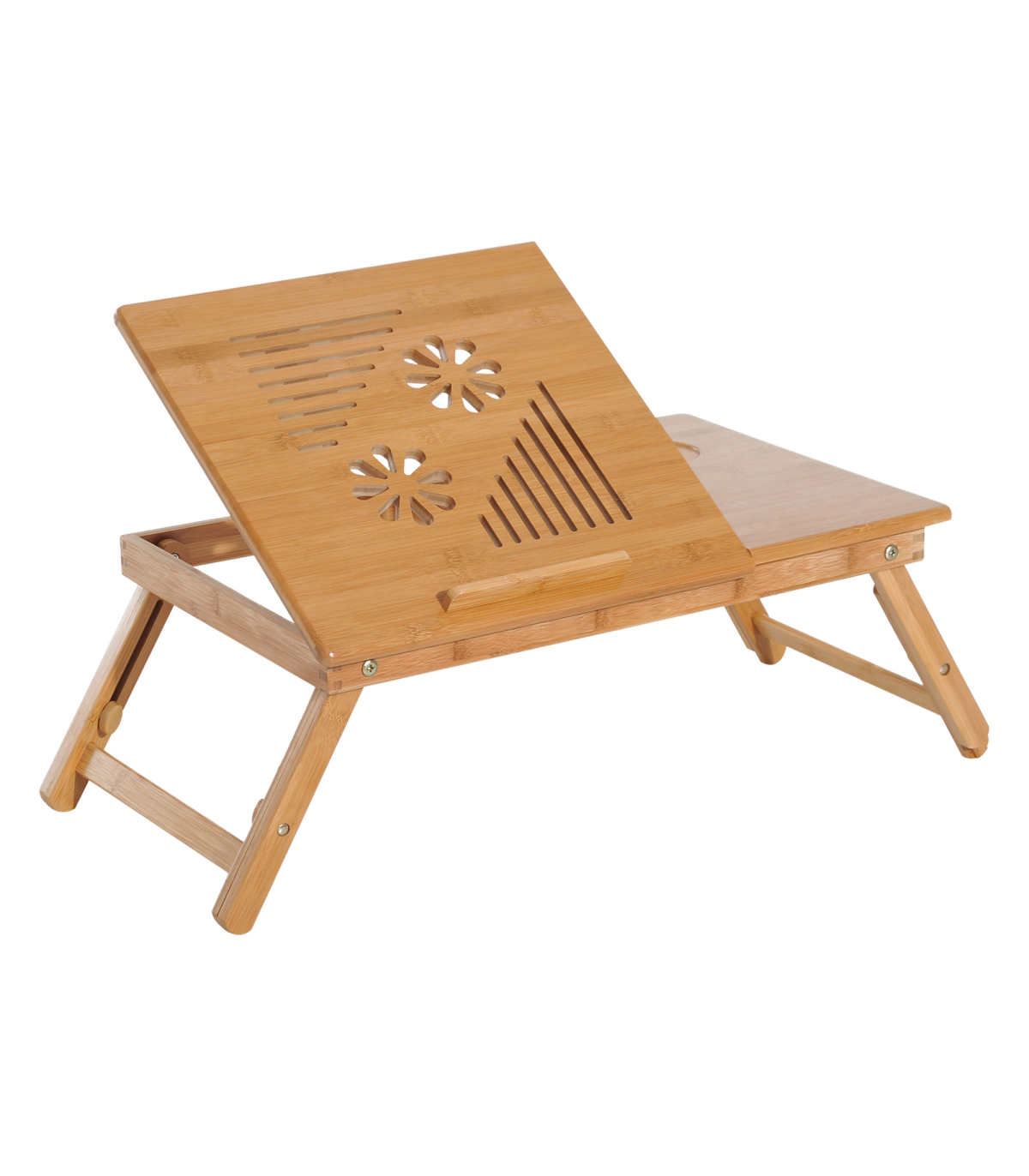 FULLY ADJUSTABLE: The serving bed tray height and tablet holder angle can be adjusted to meet your different requirements.QUALITY MATERIAL: Made of natural bamboo with varnish coating, this lap desk is durable and does no harm to human body.CONSIDERATE DESIGN: Features 1 storage drawer for your small items like pens, wallets and more. You can also put your drinks on the cup slot. Besides, there are ventilation holes on surface for timely heat emission.FOLDABLE DESIGN & MULTIFUNCTIONAL: Foldable and lightweight for easy storage and transport. Can be used as a laptop table or eating food, drawing, reading, doing homework on the bed, sofa, floor, car, etc.DIMENSION: Overall Dimension: 55L x 35W x 22-30H cm, Weight Capacity: 50kg.