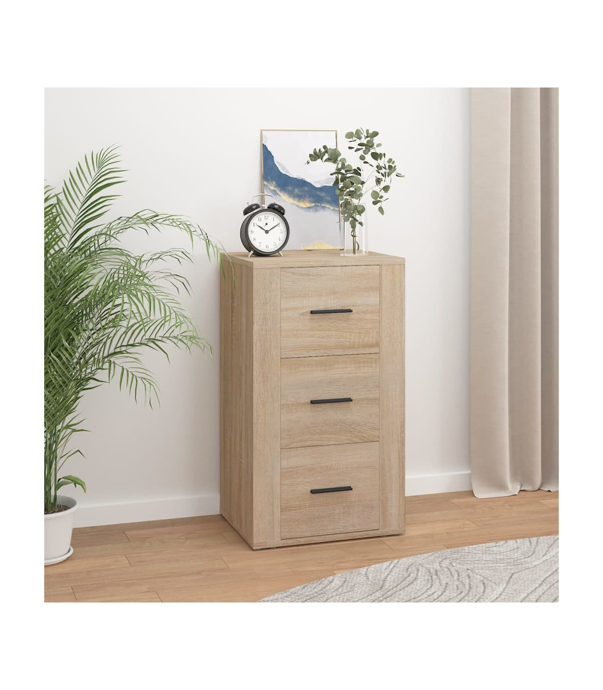 This practical sideboard is meant to satisfy your various requirements and is an ideal addition to your room. Durable material: This cabinet is made of engineered wood. The engineered wood is of exceptional quality with smooth surface and also features strength, stability and resistance to moisture.Sufficient storage space: Equipped with 3 drawers, the sideboard cabinet offers ample storage space for keeping various daily essentials well organised and within easy reach.Sturdy top: You can also place your favourite photos, decorations or flowers on top of this cupboard to enrich your life. Warning:In order to prevent overturning, this product must be used with the wall attachment device provided. Note:Each product comes with an assembly manual in the box for easy assembly.