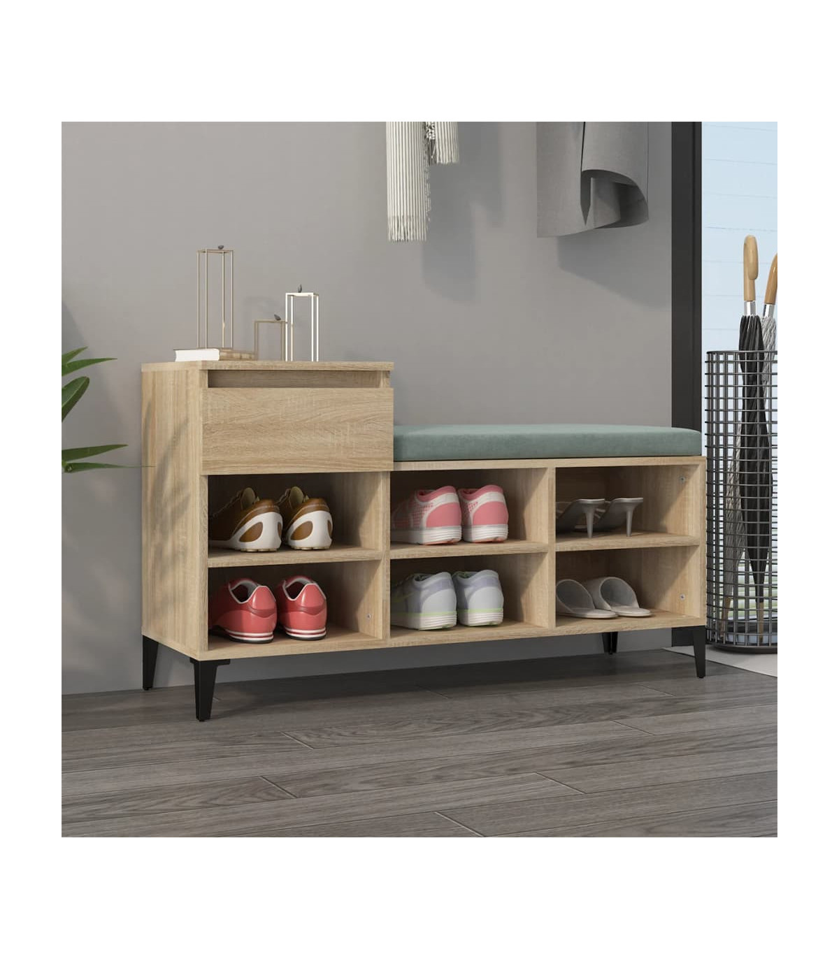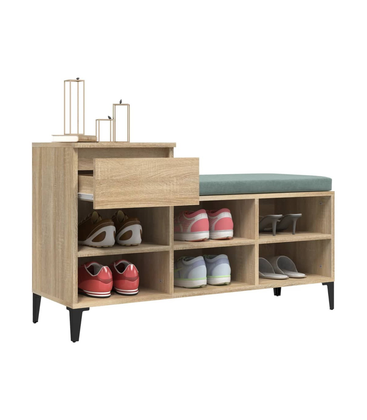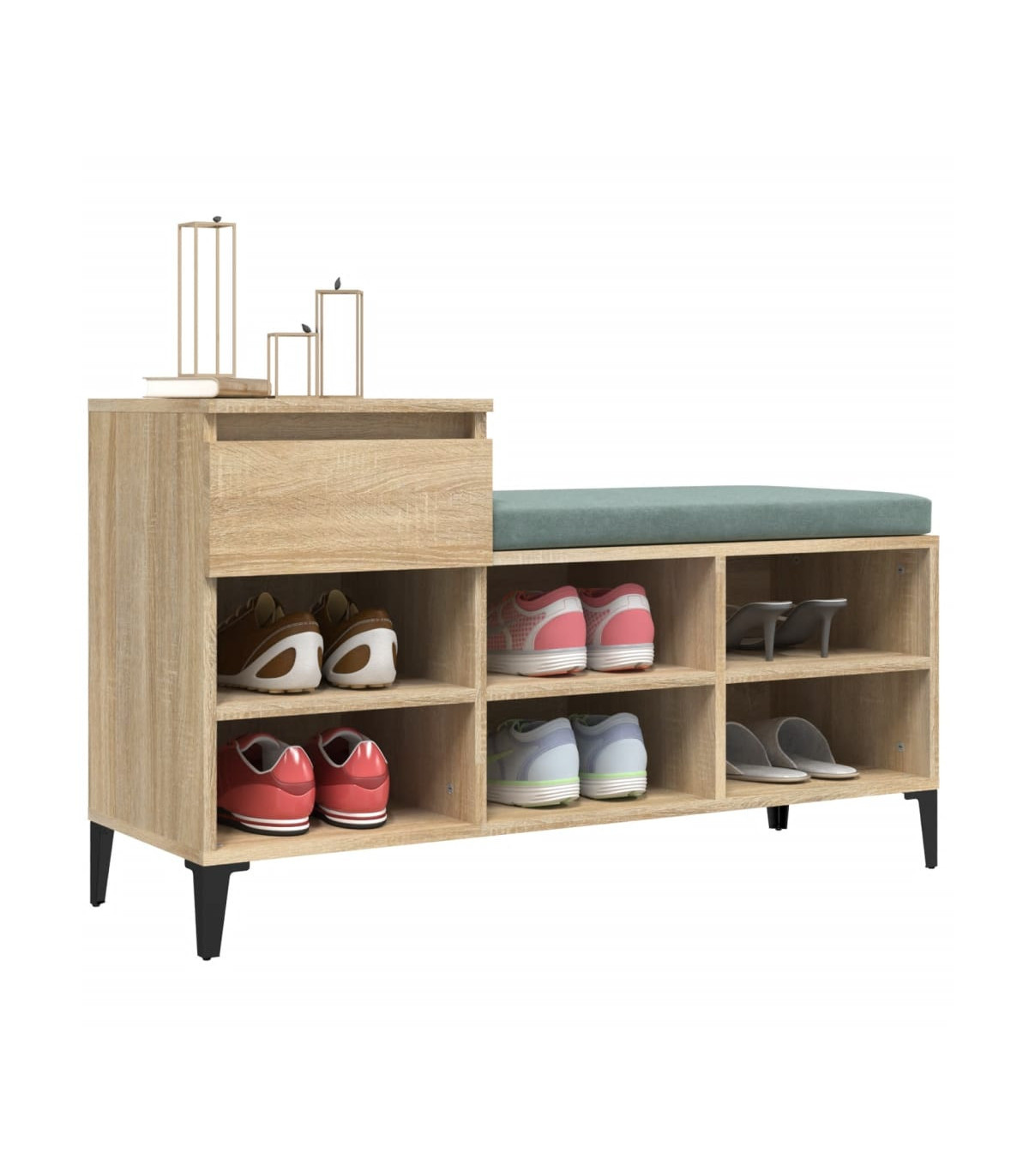 Keep your shoes away from dust and cluttering to create a tidy environment with this elegant shoe cabinet! Durable material: The engineered wood is of exceptional quality with smooth surface and also features strength, stability and resistance to moisture. Made of engineered wood, the shoe rack is easy to clean.Metal legs: The metal legs add a modern and calm style to your interior while ensuring stability.Ample storage space: The shoe storage has 1 drawer and 6 compartments, providing ample storage space for keeping your shoes and other items well organised.Sturdy top: The top of the shoe cupboard can also be used to display your favourite decorative objects.Flexible installation: The drawer can be installed on the left or right flexibly. WARNING:In order to prevent overturning, this product must be used with the wall attachment device provided. Note:Each product comes with an assembly manual in the box for easy assembly.