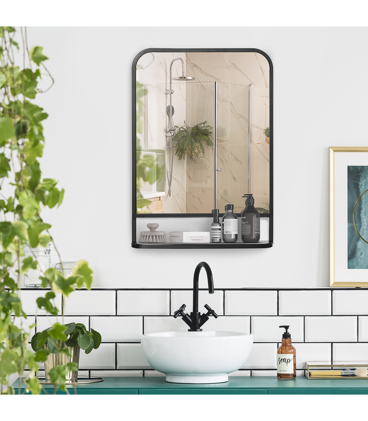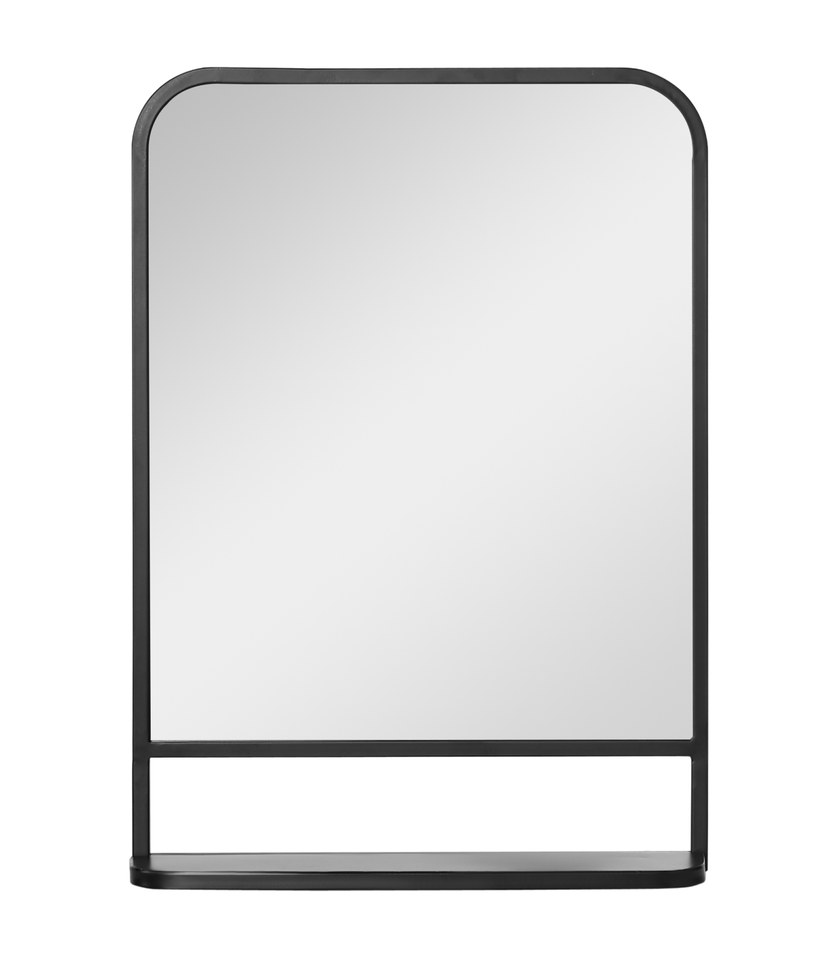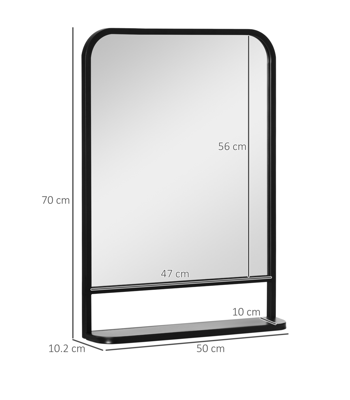 70x50cm size: A medium-sized square mirror which is great for all over the home: use as a bathroom mirror, dressing table mirror, bathroom makeup mirror and so much more.Bottom shelf: Wall mirror gives you more than just a place to see yourself and get ready - it also has a handy holding spot for keeping what you require near, close.Pre-moulded hooks: Easy to attach this mirror to the surface you want. Screws included - you've got everything you need in the box.Durable: Black mirror frame is made from sturdy metal. Resistant to wear, it's suitable for everyday use.Dimensions: Mirror: 70H x 50W x 10.2Dcm. Shelf: 10H x 50Lcm.