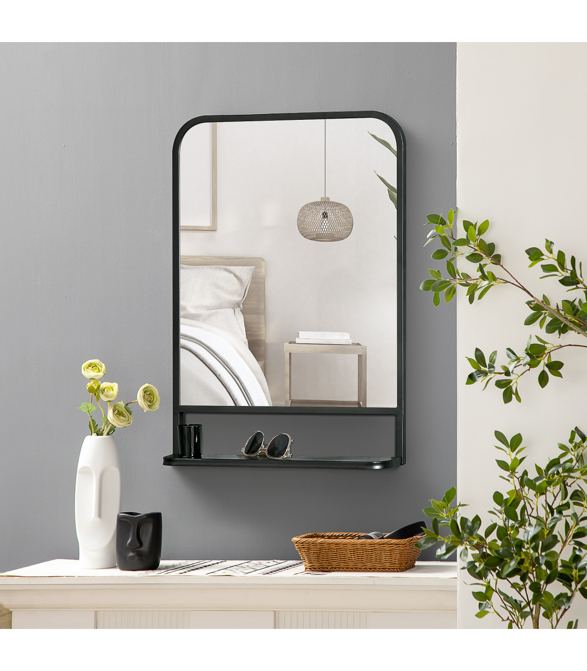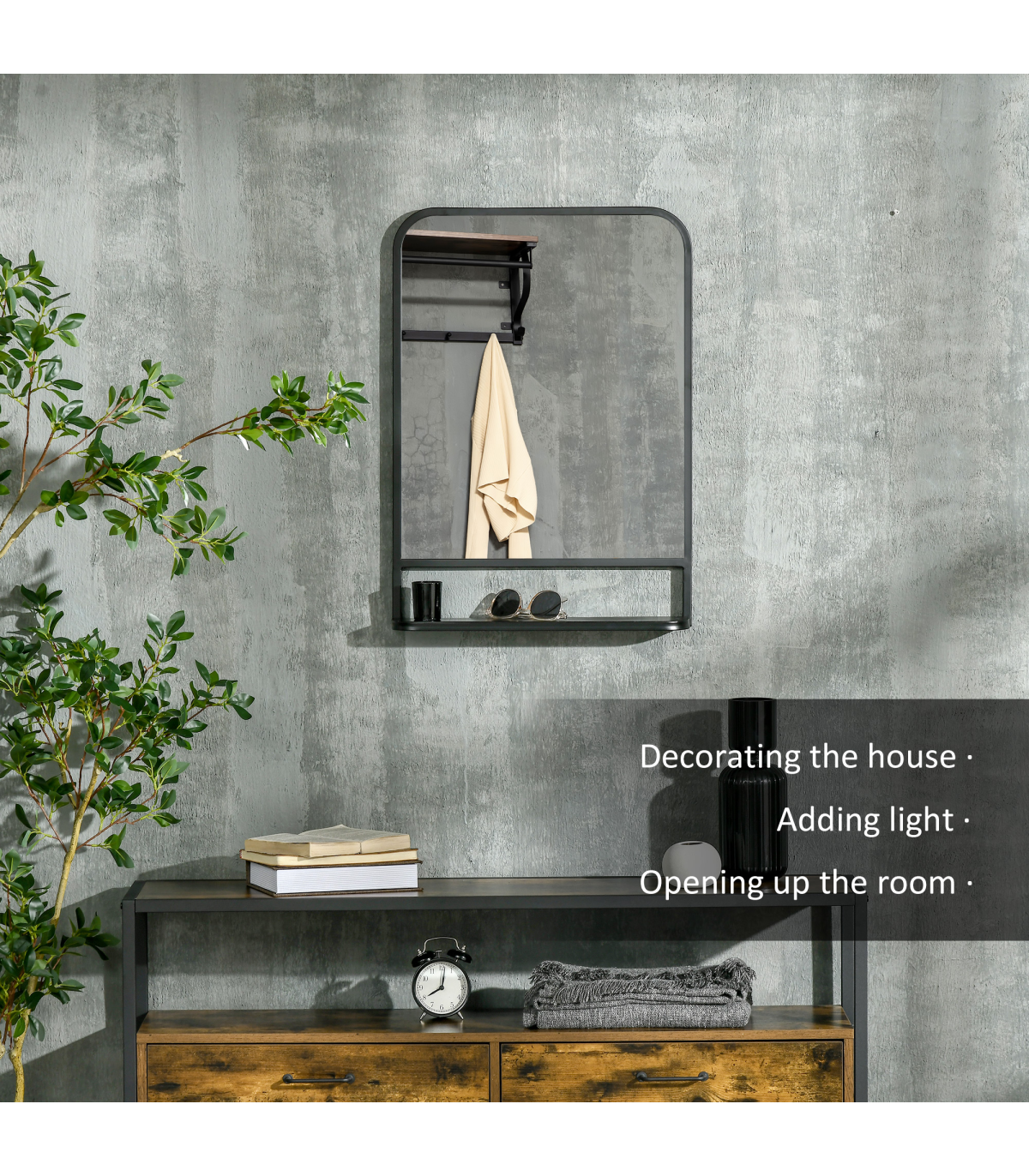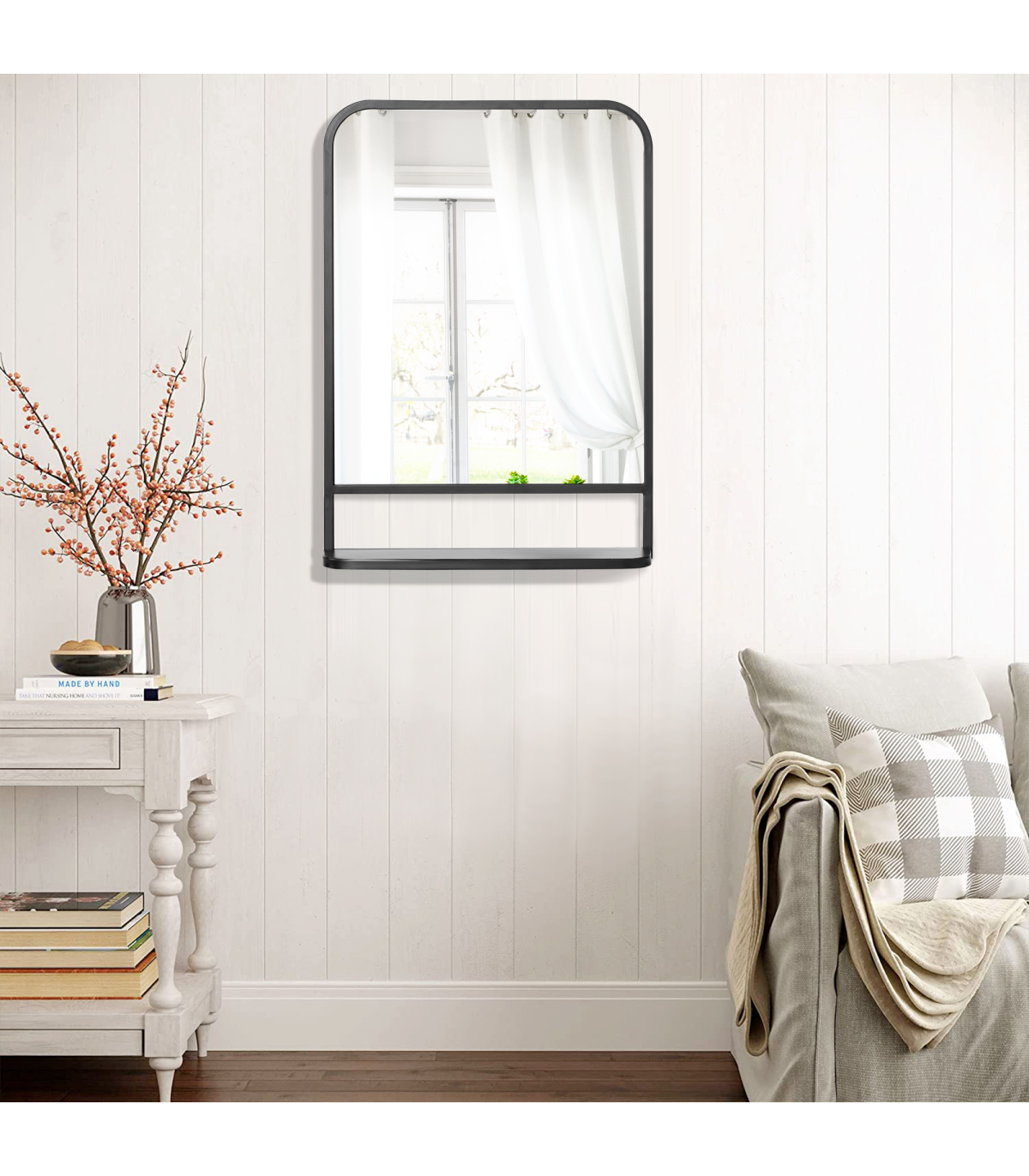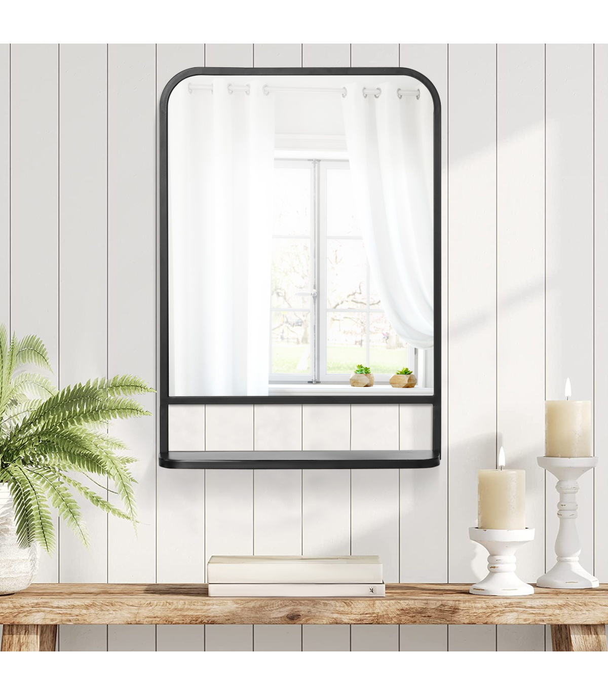 70x50cm size: A medium-sized square mirror which is great for all over the home: use as a bathroom mirror, dressing table mirror, bathroom makeup mirror and so much more.Bottom shelf: Wall mirror gives you more than just a place to see yourself and get ready - it also has a handy holding spot for keeping what you require near, close.Pre-moulded hooks: Easy to attach this mirror to the surface you want. Screws included - you've got everything you need in the box.Durable: Black mirror frame is made from sturdy metal. Resistant to wear, it's suitable for everyday use.Dimensions: Mirror: 70H x 50W x 10.2Dcm. Shelf: 10H x 50Lcm.