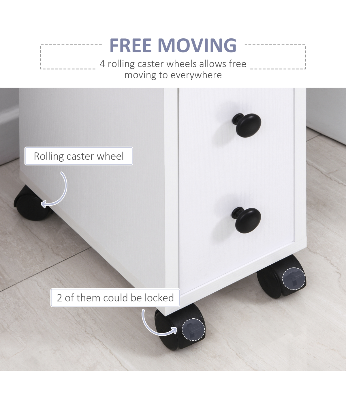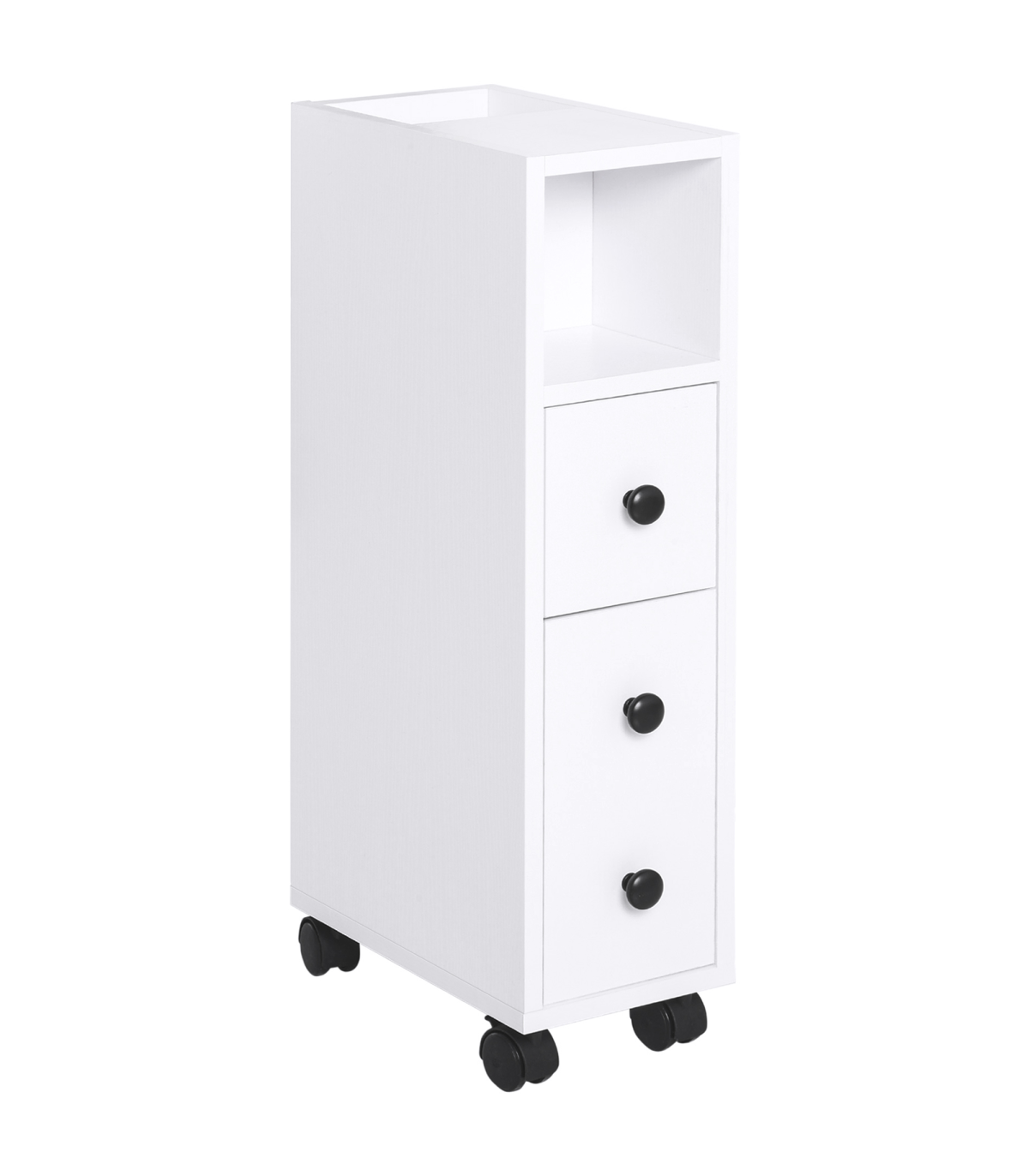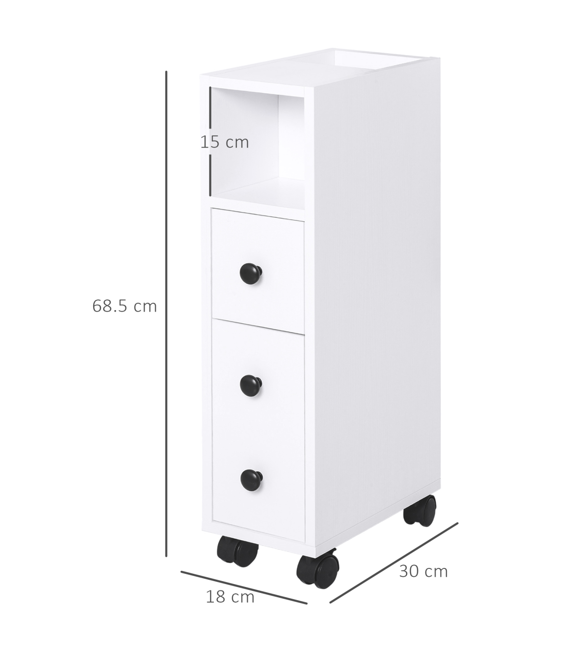 Slimline Bathroom Storage Unit w/ 2 Drawers 2 Open Compartments Wheels White