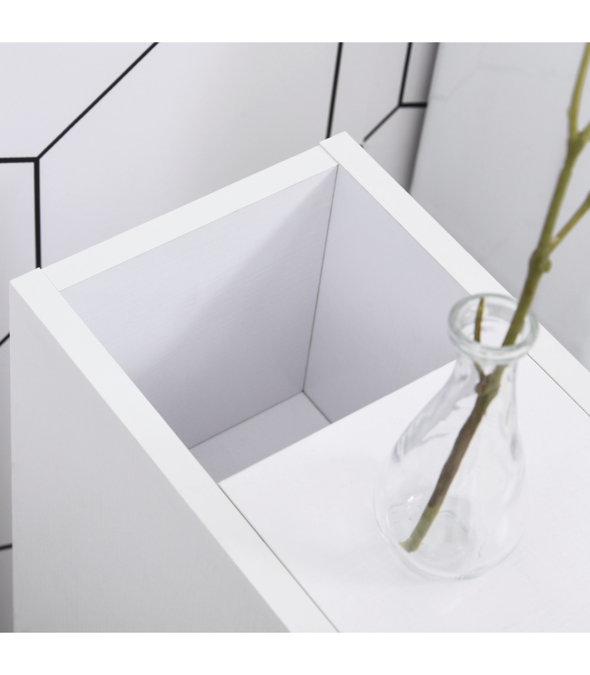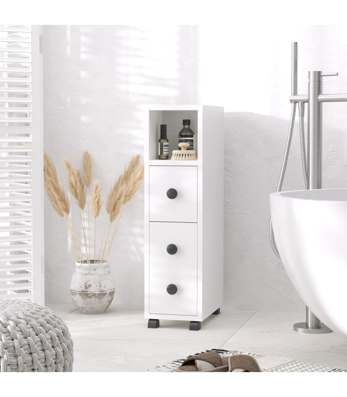 COMPACT DESIGN: Slimline in size to fit into narrow spots easily, whilst efficiently bringing out more space into the bathroom.TWO DRAWERS: One large and one small, provides room for keeping all your toiletries, cleaning products and other bathroom essentials together and organised. Also features front and top open compartment for extra holding room.PARTICLE BOARD BODY: A solid and durable construction, it is able to withstand light daily use. FOUR WHEELS: Easy to move around, two can be locked so it keeps in place.BLACK HANDLES: A beautiful contrasting look to the fresh white frame: DIMENSIONS: 68.5H x 18W x 30Dcm. Bottom cabinet inner: 28H x 14.5W x 28Dcm.MAXIMUM LOAD 15KG. ASSEMBLY REQUIRED.