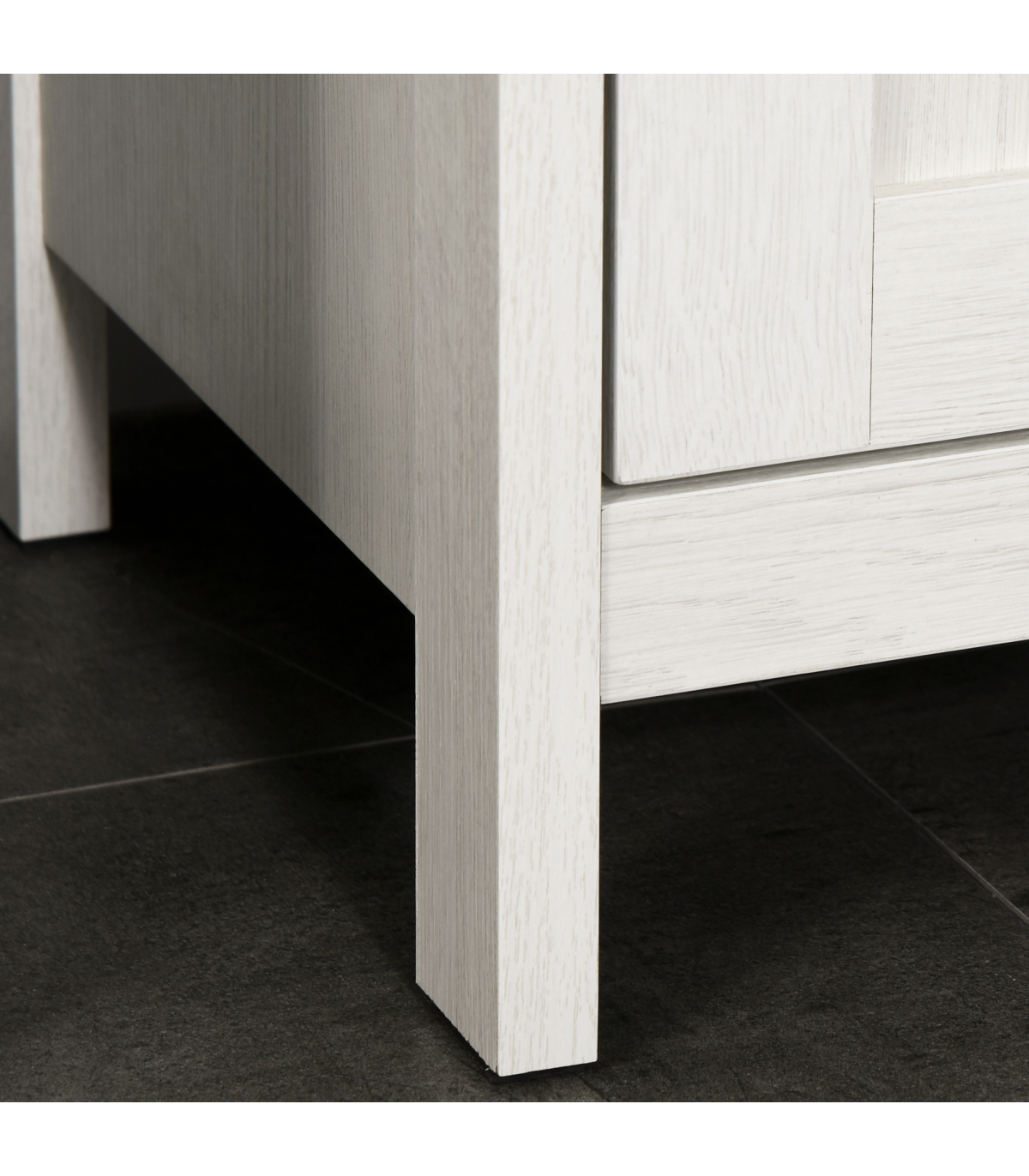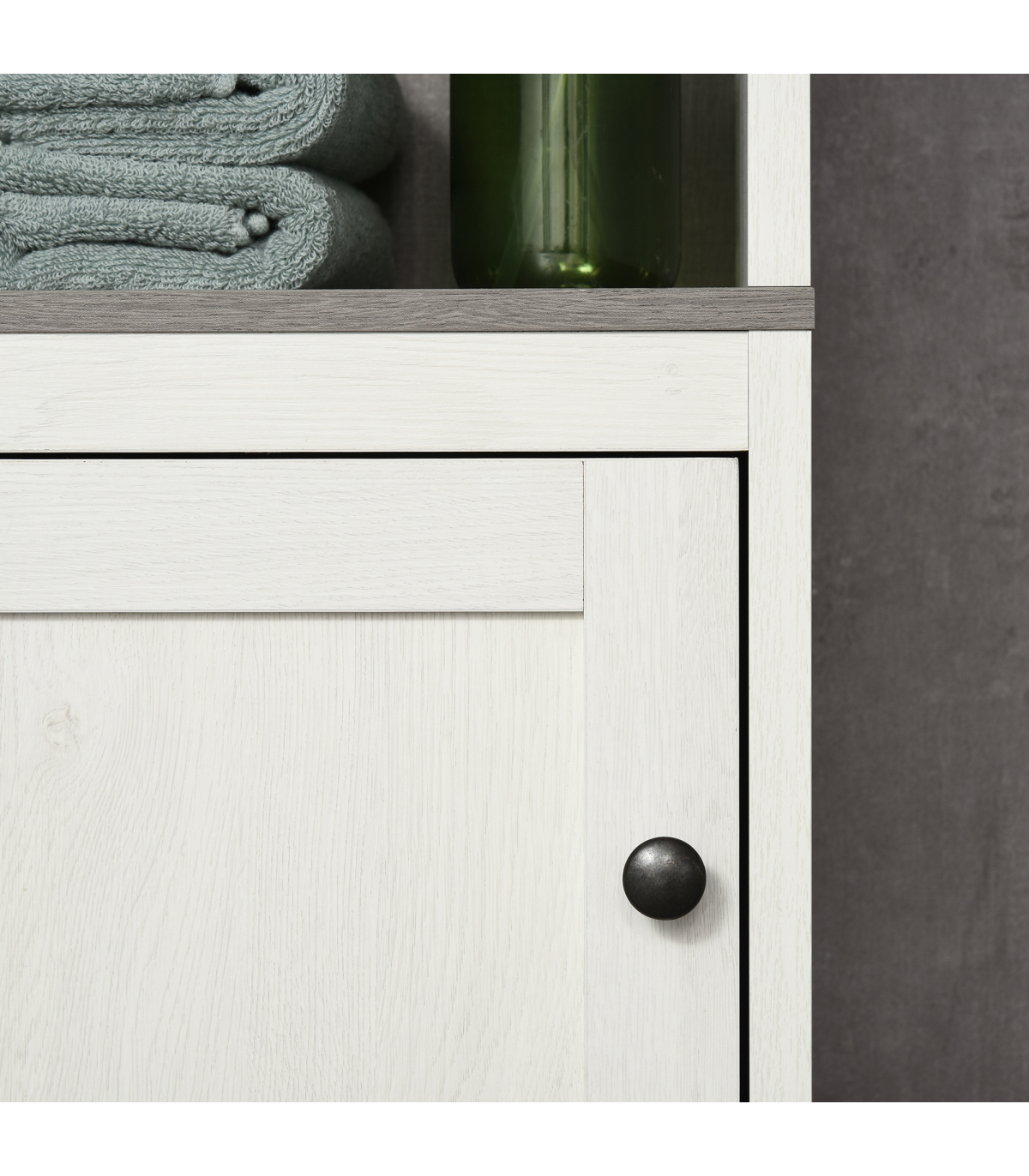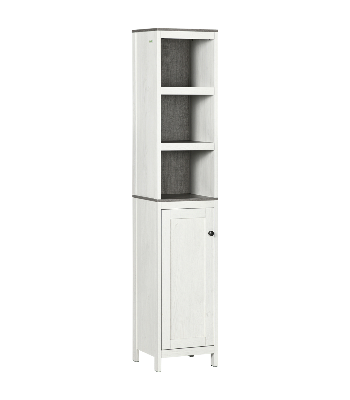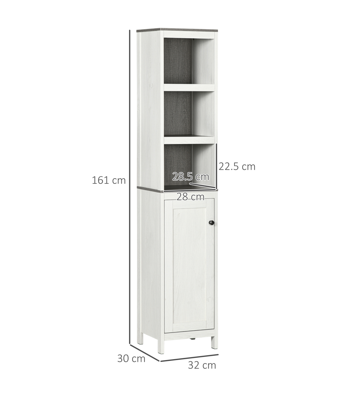 Storage: This tall bathroom cabinet features three top shelves and bottom shelf cupboard. Room for keeping your bathroom essentials and toiletries stored.Adjustable shelf: Look inside the cupboard of this bathroom linen cabinet and you'll find the shelf - set to a level which works for you.Slim and narrow bathroom cabinet: This is a tall piece which is great for places which are short on space. A slim bathroom storage cabinet which fits in plenty of places.Durable build: Corner cabinet with doors is made from particle board, so it's sturdy. Melamine coating for gentle protection. Anti-tipping straps to attach this tall narrow storage cabinet to your wall.Dimensions: 161H x 32W x 30Dcm. Maximum load 15kg. Assembly required.