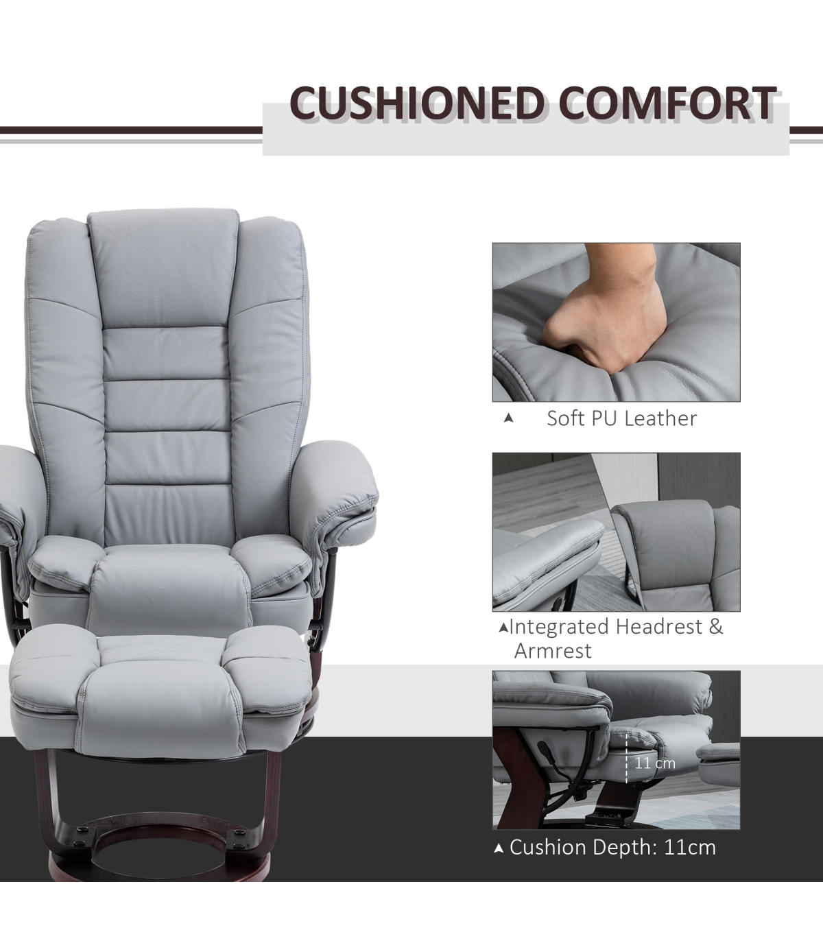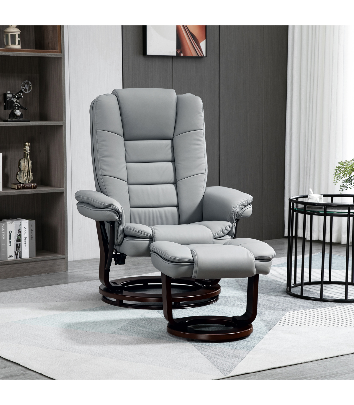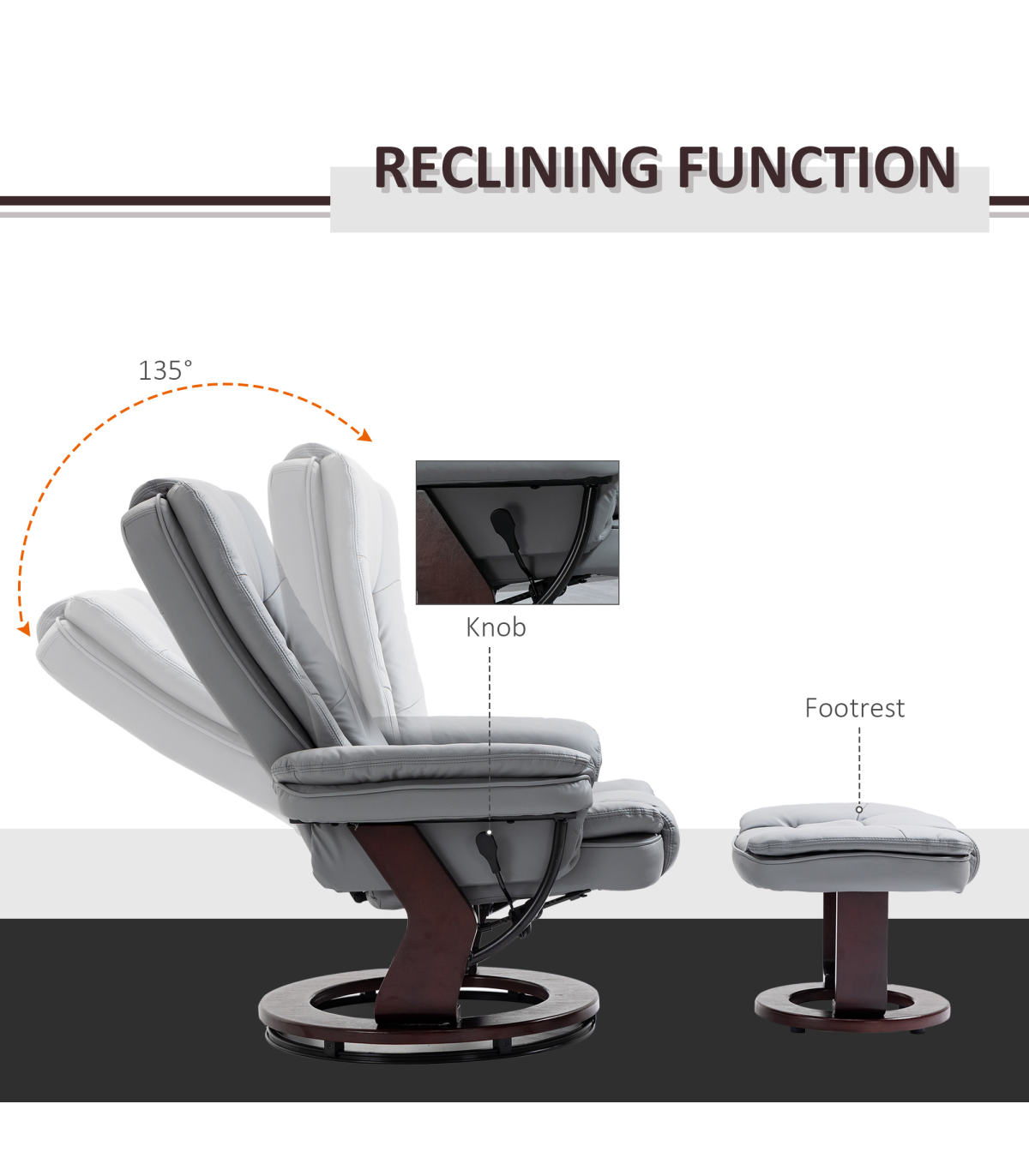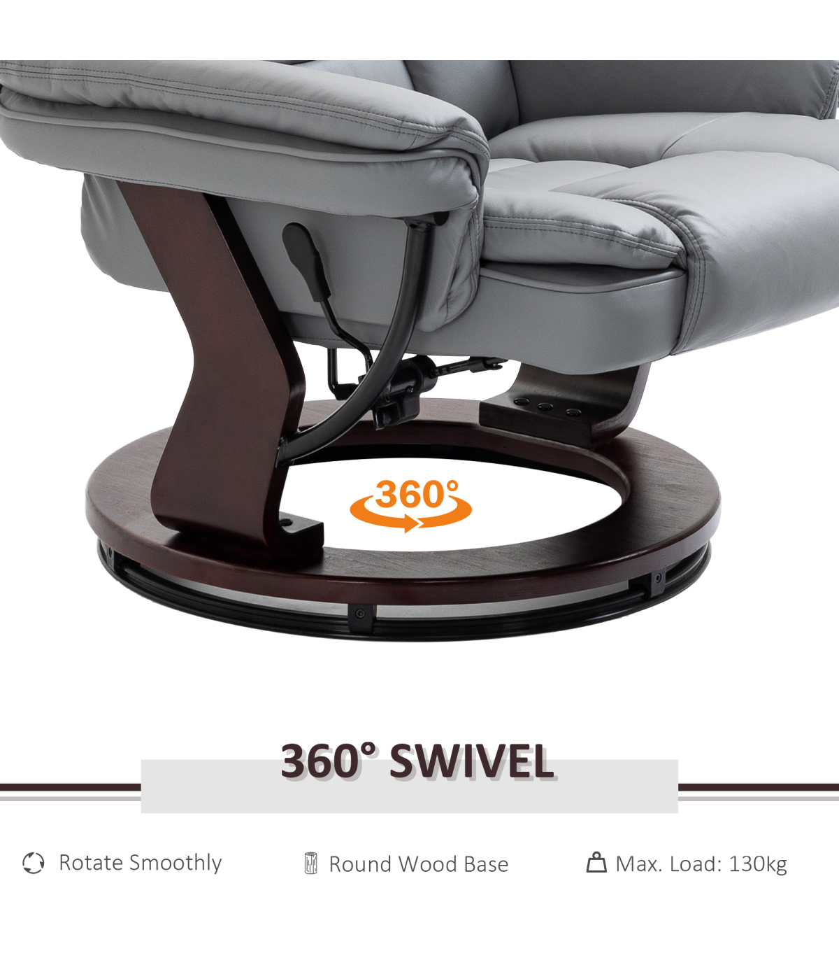 - "Swivel Manual Recliner and Footrest Set PU Lounge Chair Wood Base, Grey" - Description: "135° manual recliner: Simply press the button on this living room chair and lean back - great recliner armchair for whenever you want to switch off - use with the included footrest for added relaxation. Comfortable: The single chair and stool are filled with thick sponge all over - simply sink in, legs up and relax. Armrests and a tall back to support body. Faux leather armchair and footstool duo: A seating set which is super stylish and smooth to touch - brings an upmarket and executive feel into your home/office space. Wooden bases: Strong and supportive, polished finish is beautiful. Dimensions: - Chair upright: 102H x 79W x 80Dcm. - Chair reclined: 94H x 79W x 106Dcm. - Stool: 40H x 50W x 47Dcm. Maximum load 130kg. Assembly required.
