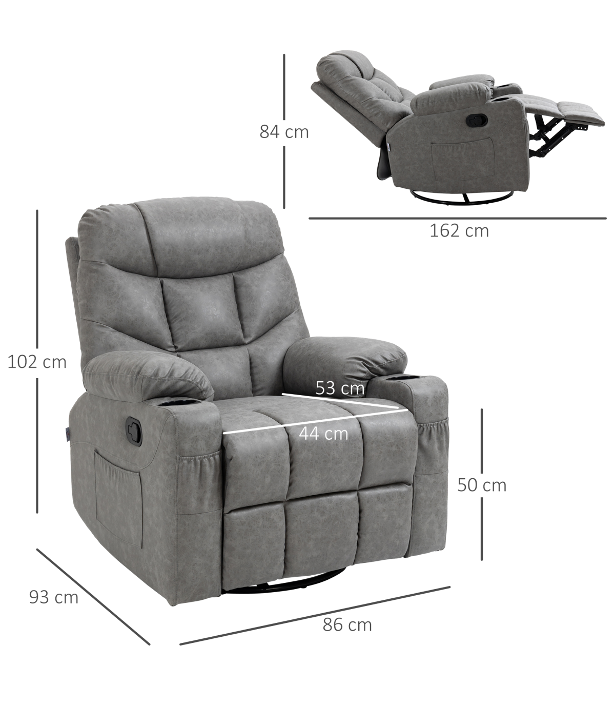 Manual reclining chair: Back goes to a maximum 135 angle, with separate lifting footrest. You can relax and lift your body to a comfortable angle, anytime.Thick, all-over padding: A recliner chair which ups the comfort - sink in, and relax. The pocket spring system, high back and armrests for support.Faux leather recliner chair: A cool, stylish design. The upholstery feels great against the skin and wipes clean easily.Two cup holders and two pocks: Extra handy features on this living room chair - won't have to move once seated.Dimensions: Upright: 102H x 86W x 93Dcm. Reclined: 84H x 86W x 162Dcm. Seat: 50H x 44W x 53Dcm. Maximum load 150kg. Assembly required.