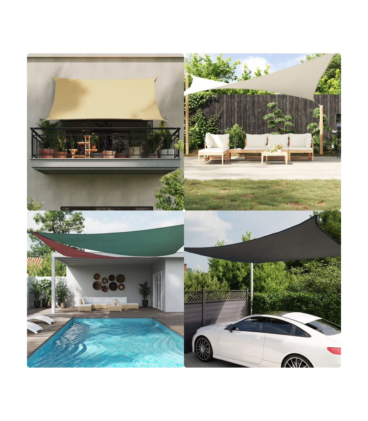 Protect yourself from sun and rain anywhere you want with our high-quality sunshade. It's the ideal sunshade that can be used in a variety of outdoor spaces like your garden, terrace, playground or balcony. Made from PU coated oxford, the sun sail will protect you from direct sunlight and rain. The fabric is specially treated, so it is mould and UV proof. The sunshade is easy to assemble thanks to the stainless steel fasteners at every corner and the included ropes. Please note that we recommend treating the sunshade with a waterproofing spray if it is subjected to heavy rainfall. Good to know: Install 2 corners of the sails higher than the others to allow the water to run off.