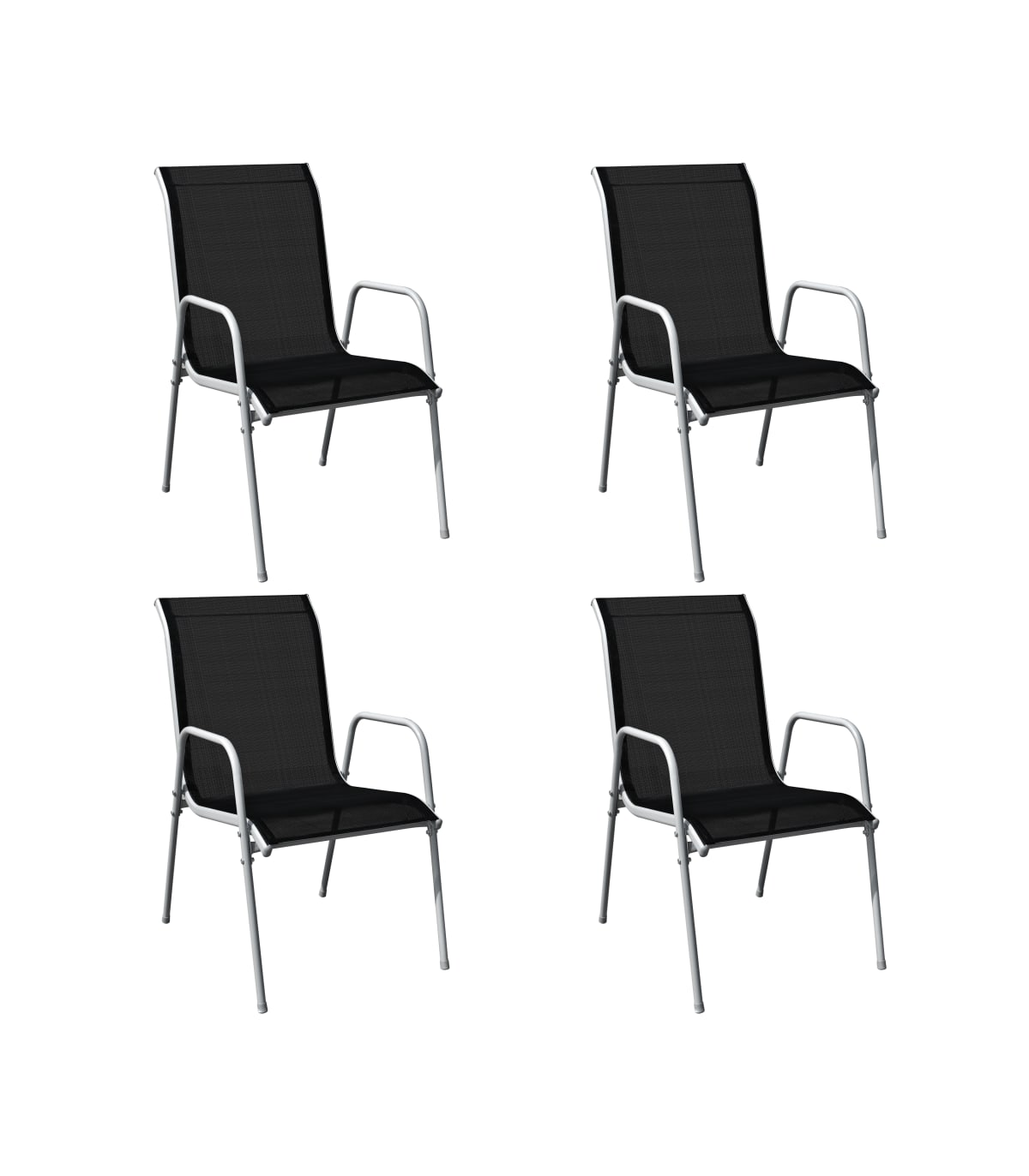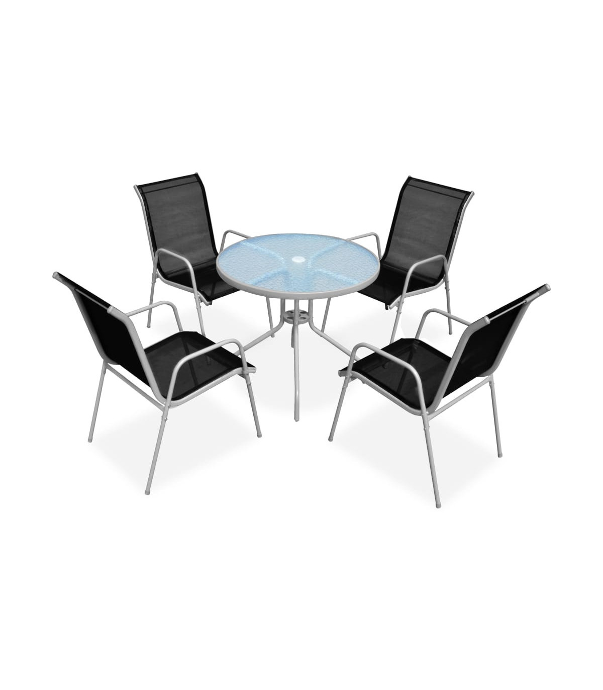 This sophisticated garden furniture set will become the focal point of your garden, patio, or dining room. The comfortable chairs are constructed from high-quality powder-coated steel. Thanks to the strong textilene fabric, our chairs are weather-resistant and easy to clean. The chairs are stackable to save space. The table has a 5 mm thick tabletop made of tempered ripple glass, on which you can place drinks, snacks or decorative items. It also has a sturdy powder-coated steel frame that is durable and easy to maintain. With central parasol holes both on the tabletop and at below, you can easily install a large canopy to create some sunshade during hot summers. Assembly is easy. Delivery includes 1 table and 4 textilene chairs. Note: We recommend covering the set in the rain, snow and frost.