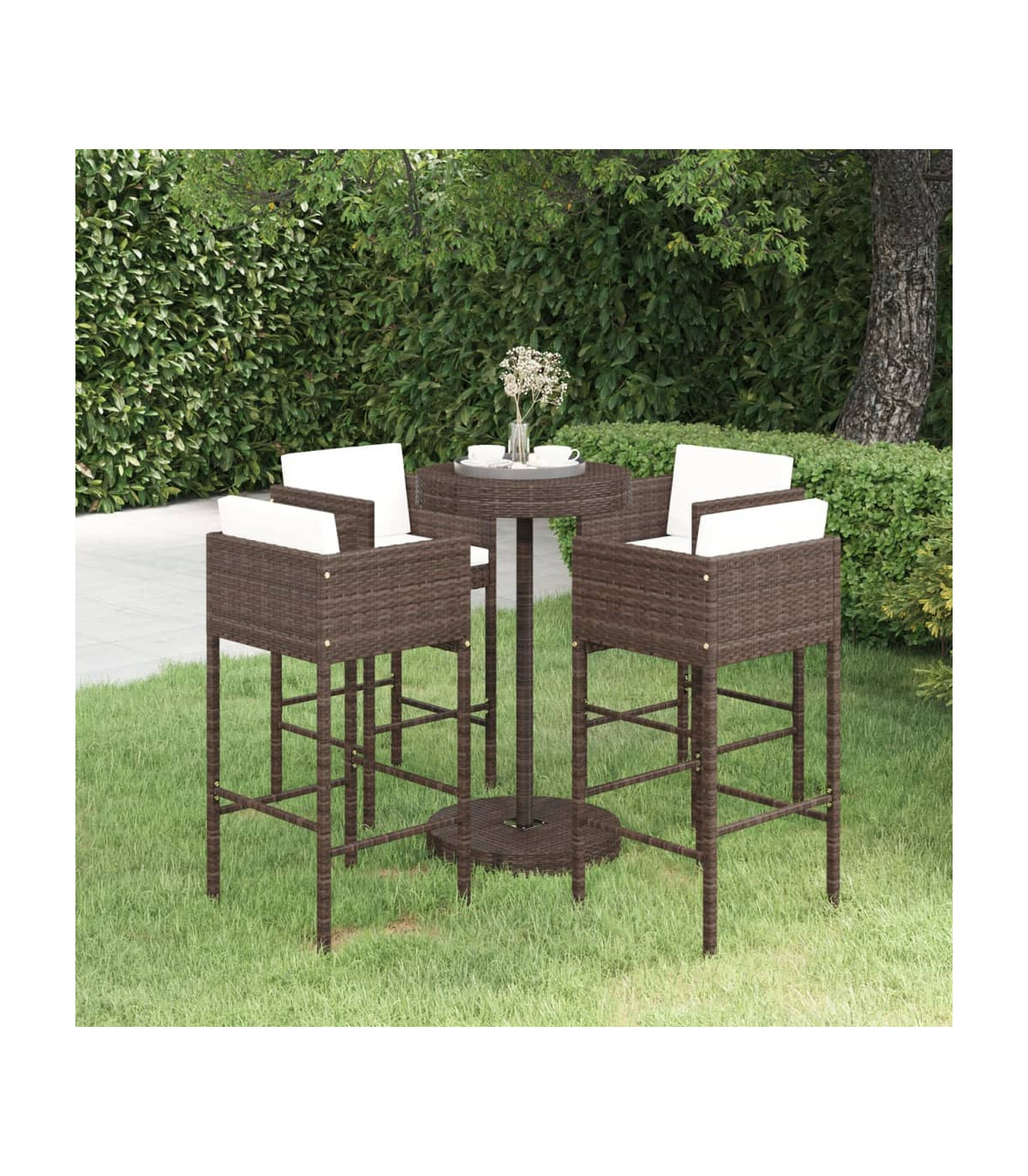 This stylish garden bar set provides you with a leisurely and comfortable time with your family and friends. Made of weather-resistant and waterproof PE rattan, this outdoor bar set is easy to clean, hard-wearing and suitable for daily use. The powder-coated steel frame makes the table and stools sturdy and durable. The round tabletop is ideal for placing drinks, food, or some decorative items. The footrest and cushions also add additional seating comfort for the stool. Thanks to the lightweight construction, all items are easy to move. Note: In order to extend the life of your outdoor furniture, we recommend you to clean it regularly and do not leave it outdoors without protection unnecessarily.Clean: Use a mild soap solution.Storing: If possible, store in a cool, dry place indoors. If the product is stored outdoors, protect it with a waterproof cover. Wipe and dry the excess water or snow from flat surfaces after a rain or snowfall. Allow sufficient air circulation to avoid moisture-related damage.