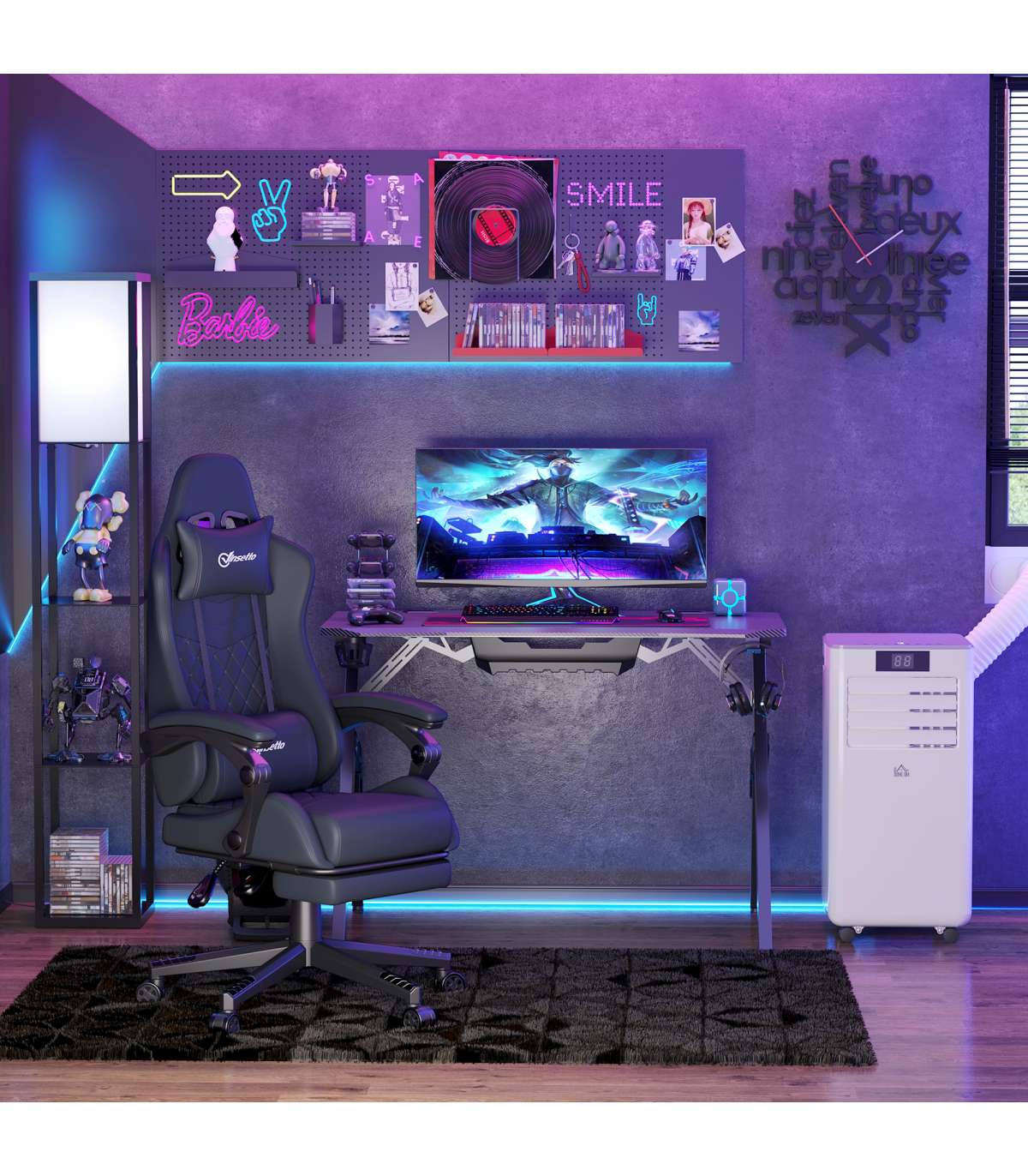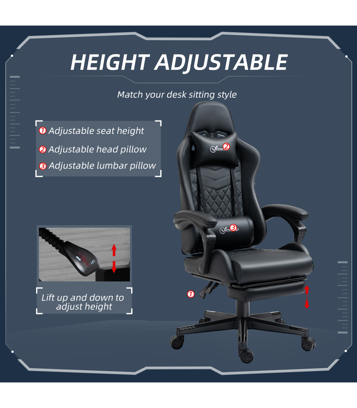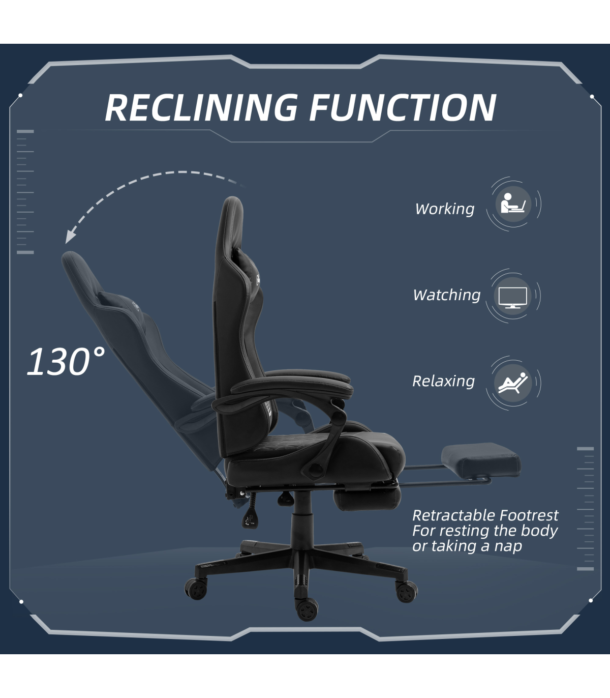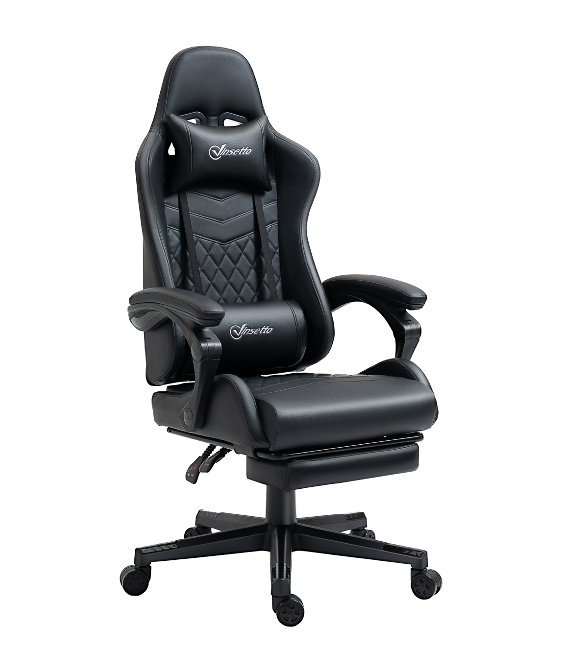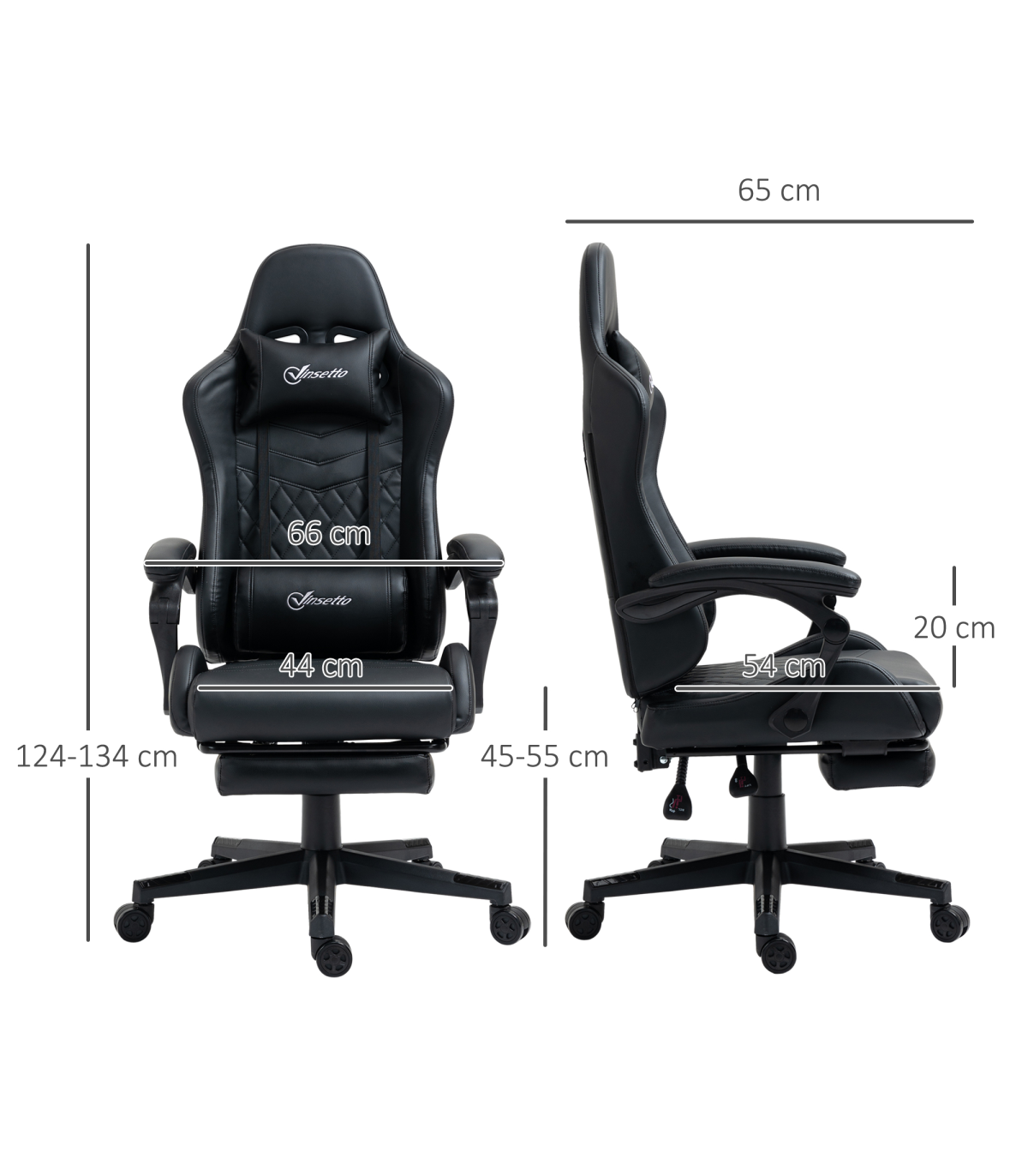 - Racing Gaming Chair PU Leather Gamer Recliner Home Office, Black - Description: - COOL CONTRAST DESIGN: PU Leather upholstery with contrasting stitching all over - makes this computer chair stand out and impress. The perfect way to complete your well thought-out games room setup. - RECLINES WITH FOOTREST: Back goes back to a maximum 130° angle, and footrest is retractable so you can pull it out and use whenever you want. - COMFORTABLE AND SUPPORTIVE: Extra thickly padded, with lumbar and neck pillow for added comfort. Armrests are also padded. Seat swivels freely from left to right. - GAME CHAIR DIMENSIONS: 112-122H x 66W x 65Dcm. Reclined dimensions: 105-115H x 64W x 107.5Dcm. Seat dimensions: 48-58H x 44W x 54Dcm. - GAMER CHAIR MAXIMUM LOAD: 120KG. Assembly required.