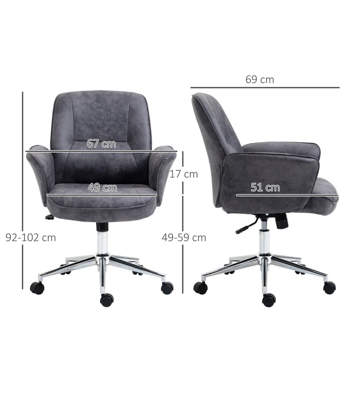 Retro Executive Design: A comfy chair you'll love to be seen in, sit in - and have in the home office. Slightly boxed shape with curved armrests for a cool and stylish look.Ergonomic: The home office chair features a large seat which swivels from side-to-side, high back and armrests. Height is also adjustable.Microfibre Leather Upholstery: Looks like leather, but is softer to the touch. Make the computer chair more luxurious to look at.Dimensions: 92-102H x 67W x 69Dcm. Seat: 49-59H x 49W x 51Dcm.Maximum Load 120kg. Assembly Required.