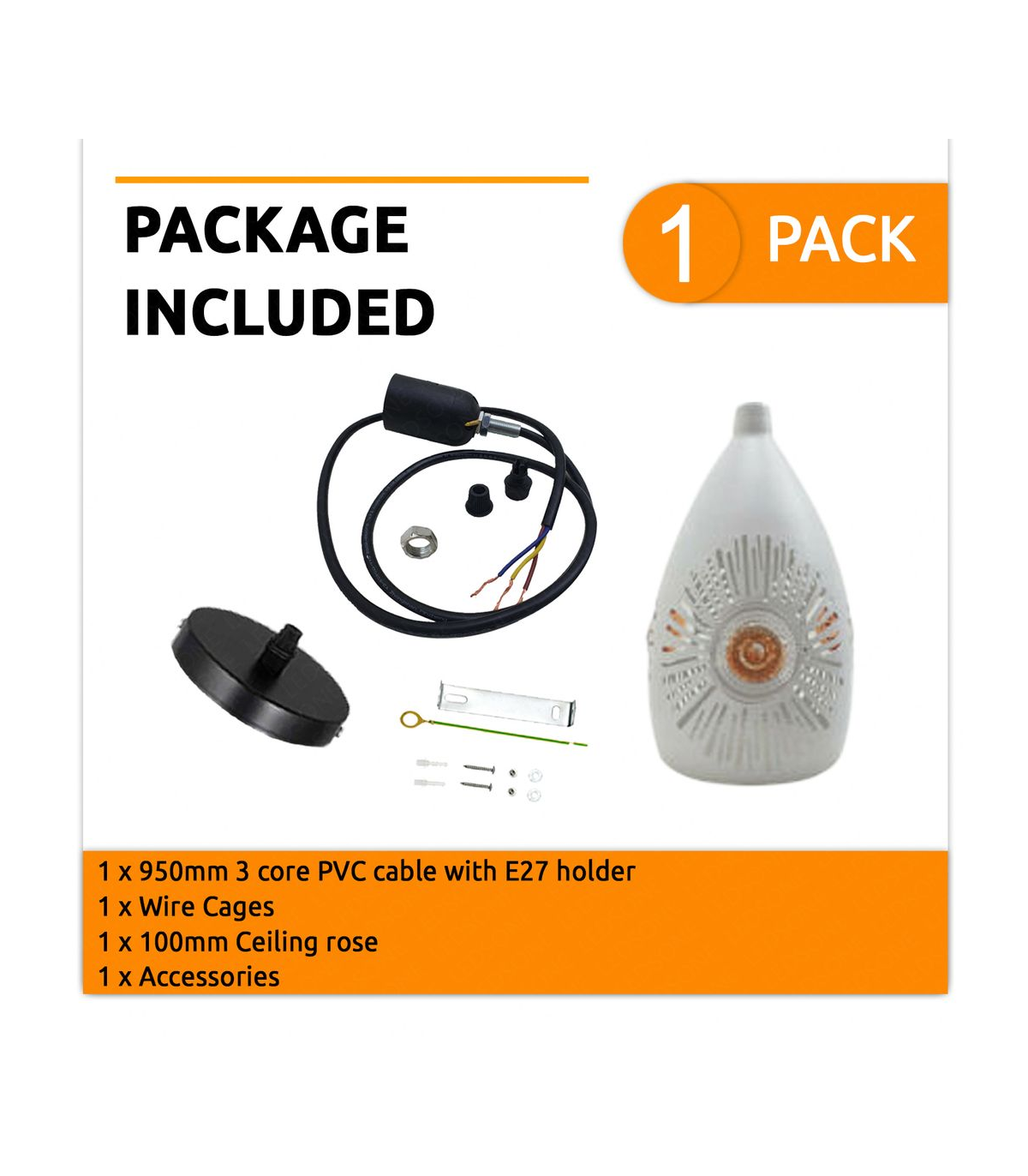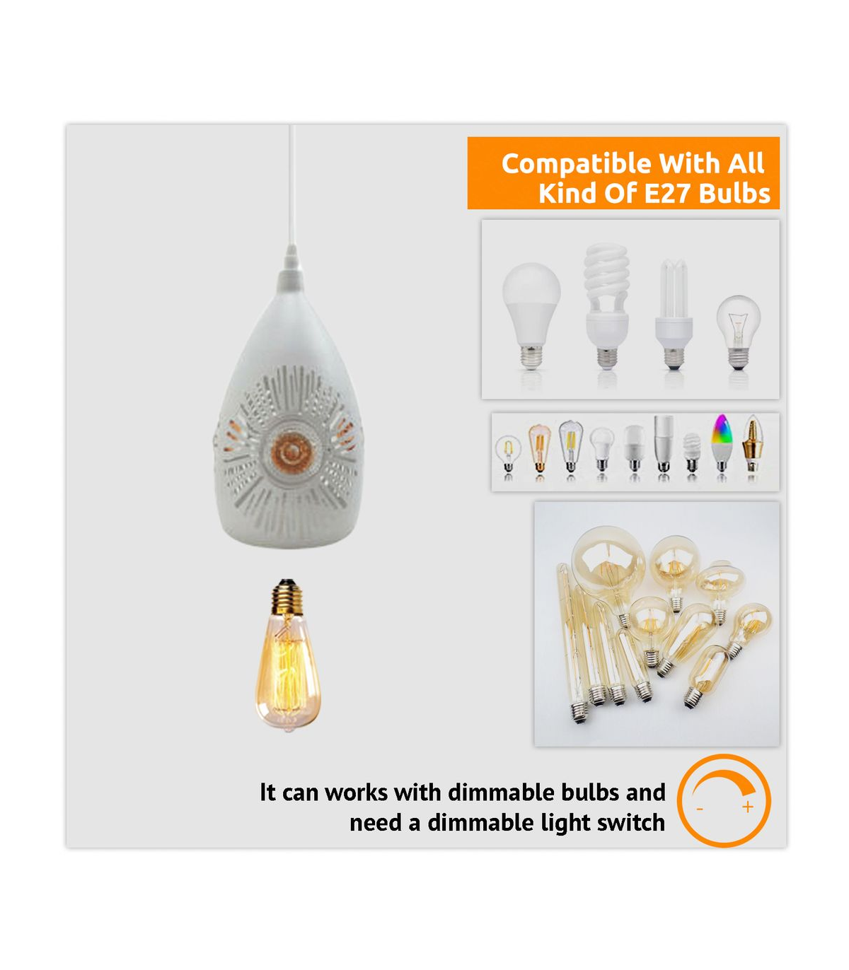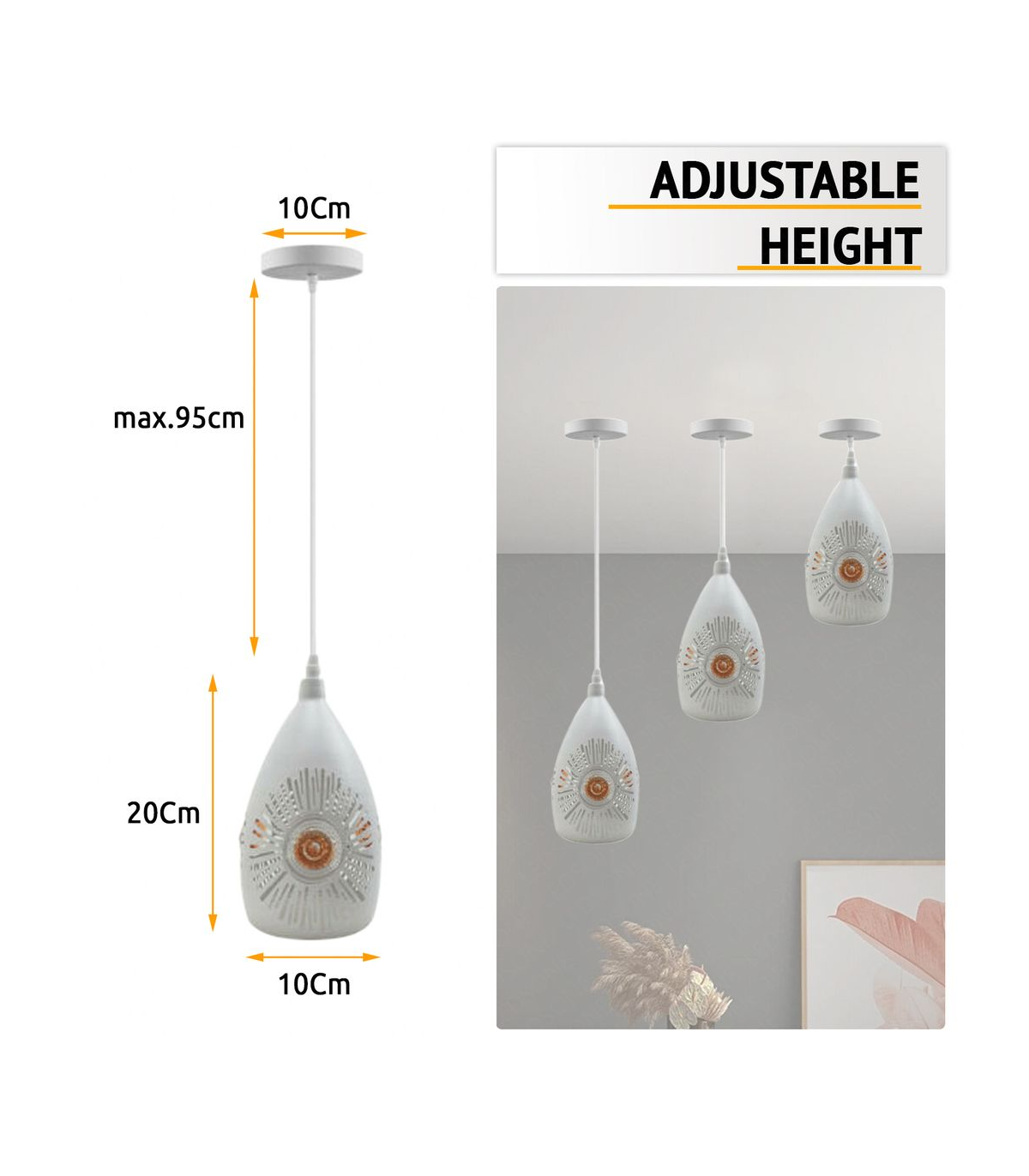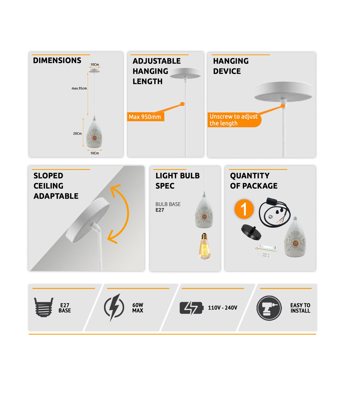 Features: This white pendant light will look great in any living space and is a great way to add a new look to any indoor interior. Has a white finished interior to best catch the light. And it can be hung on sloped ceilings. When used with a matching dimmer switch and dimmable bulb, it can be dimmable. All the wire and hanging cords comply with the British standard. It is designed with the 3 core wire, in other words, it is fully earthed. Item Specifications / Technical Details: Item Type: Pendant lamp kit Style: Vintage/Retro Voltage: AC110V-240V Lamp holder quantity:1 Material: Metal Dimension of the lampshade: Height 20cm, Width 10cm Bulb Requirements: Requires E27 max 60W Bulb Type: Compatible with all kinds of E27 Bulbs Installation Area: Indoor Power Source: Hardwired Dimmable: Yes (required a dimmable bulb and dimmer switch) Wire length: 95cm Adjustable Cable Energy consumption: A+ with LED bulb Sloped ceiling adaptable.