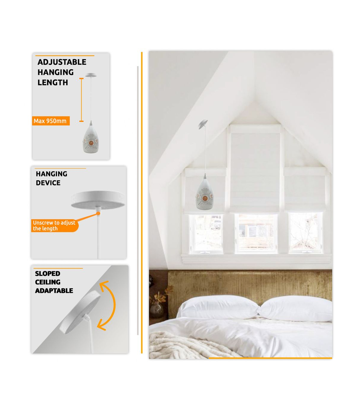 Features: This white pendant light will look great in any living space and is a great way to add a new look to any indoor interior. Has a white finished interior to best catch the light. And it can be hung on sloped ceilings. When used with a matching dimmer switch and dimmable bulb, it can be dimmable. All the wire and hanging cords comply with the British standard. It is designed with the 3 core wire, in other words, it is fully earthed. Item Specifications / Technical Details: Item Type: Pendant lamp kit Style: Vintage/Retro Voltage: AC110V-240V Lamp holder quantity:1 Material: Metal Dimension of the lampshade: Height 20cm, Width 10cm Bulb Requirements: Requires E27 max 60W Bulb Type: Compatible with all kinds of E27 Bulbs Installation Area: Indoor Power Source: Hardwired Dimmable: Yes (required a dimmable bulb and dimmer switch) Wire length: 95cm Adjustable Cable Energy consumption: A+ with LED bulb Sloped ceiling adaptable.