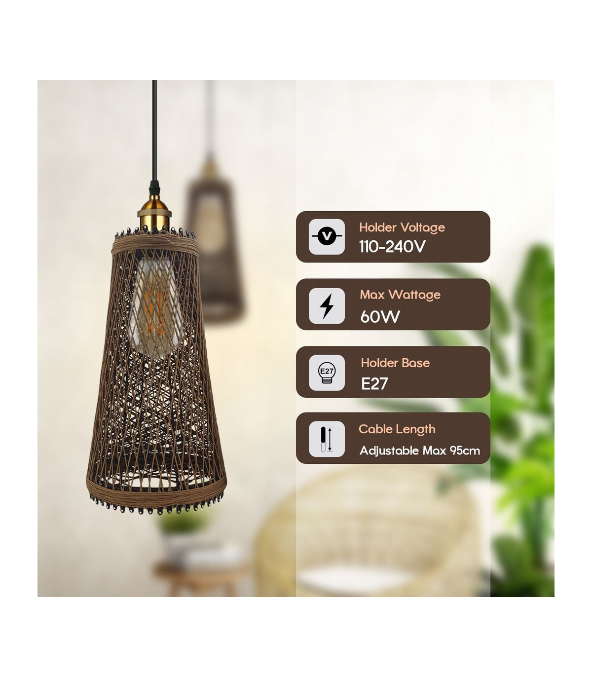 Features: This single pendant ceiling lamp has a classic, Vintage inspired style that works well with a variety of home decor themes. This pendant ceiling lampshade is large enough to provide ample lighting while also being compact enough to fit in most spaces. This type of hanging lights can be used with a variety of lighting fixtures such as table lamps, Floor lamps or pendant lights. The light fitting should be compatible with the E27 base, Which is a common and standard size for light bulbs, Allowing users to easily find and replace bulbs. Item Specifications: Item Type: Pendant light Style: Vintage/Retro Voltage: AC110V-240V Lamp holder quantity:1 Material: Rattan ,PVC, metal Bulb Requirements: Requires E27 max 60W Bulb Type: Compatible with all kinds of E27 Bulbs Shade dimension : Height 30cm ,width 17cm Installation Area: Indoor Power Source: Hardwired Dimmable: Yes (required a dimmable bulb and dimmer switch) Wire length:95cm Adjustable Cable Energy consumption: A+ with LED bulb