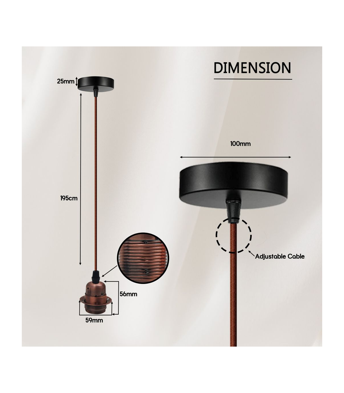 Features: The pendant light kits are designed with contemporary style. Ideally, the filament retro bulbs will be a good choice to bring out the character of this fitting. All the parts comply with the british standard. Perfect for adding lampshades. It can be dimmable when used with a matching dimmer switch and dimmable bulb. Item Specifications / Technical Details: Item Type: Pendant light holder Style: Vintage/Retro Voltage: AC110V-240V Material: Metal/PVC Bulb Requirements: Requires E27 max 60W Bulb Type: Compatible with all kinds of E27 bulbs Installation Area: Indoor Power Source: Hardwired Cable length: 195cm adjustable cable Dimmable: Yes(required a dimmable bulb and dimmer switch) Energy consumption: A+ with LED bulb.