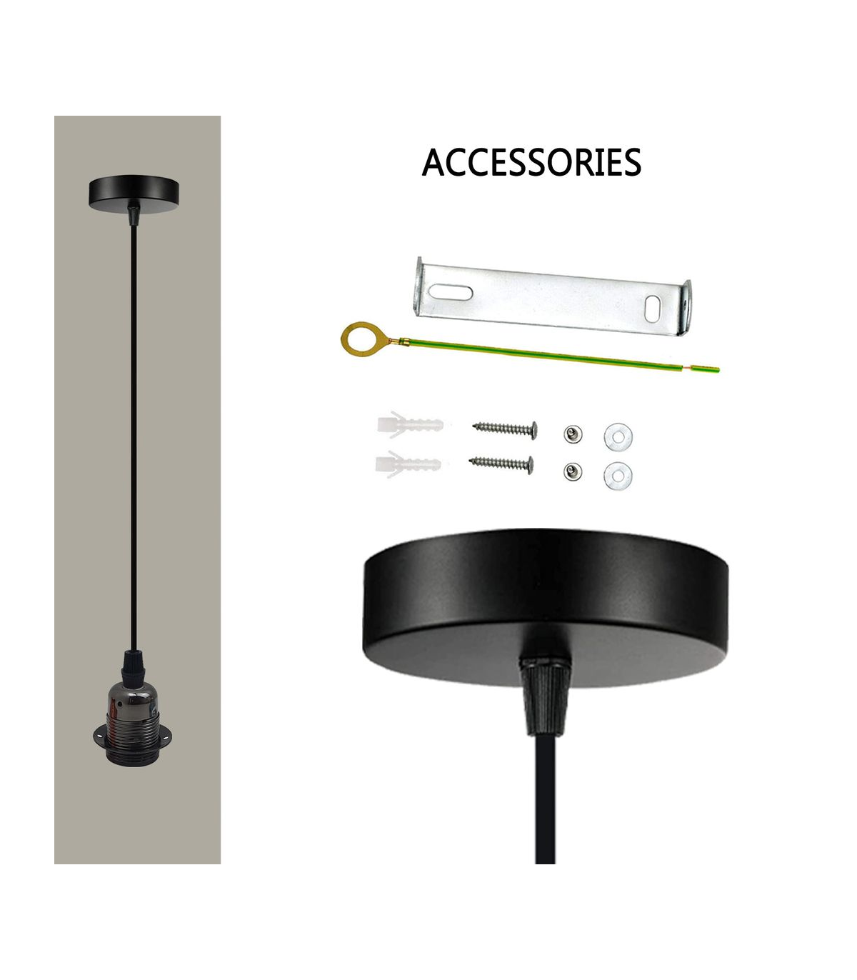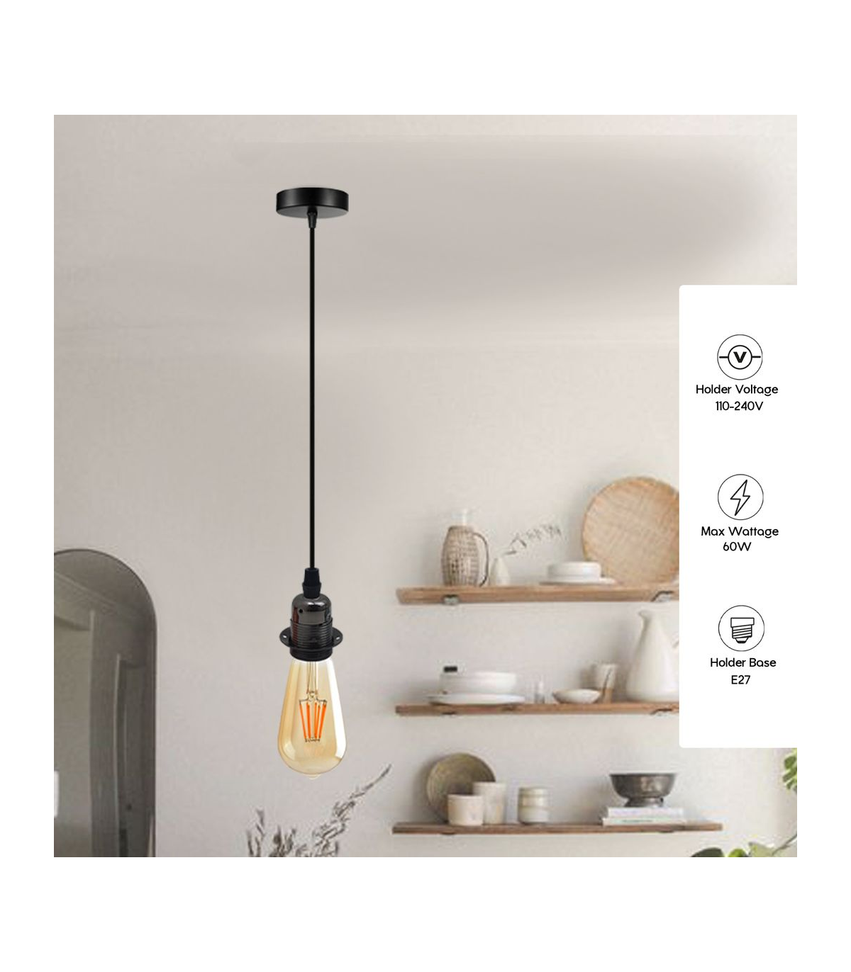 Features: The pendant light kits are designed with contemporary style. Ideally, the filament retro bulbs will be a good choice to bring out the character of this fitting. All the parts comply with the british standard. Perfect for adding lampshades. It can be dimmable when used with a matching dimmer switch and dimmable bulb. Item Specifications / Technical Details: Item Type: Pendant light holder Style: Vintage/Retro Voltage: AC110V-240V Material: Metal/PVC Bulb Requirements: Requires E27 max 60W Bulb Type: Compatible with all kinds of E27 bulbs Installation Area: Indoor Power Source: Hardwired Cable length: 195cm adjustable cable Dimmable: Yes(required a dimmable bulb and dimmer switch) Energy consumption: A+ with LED bulb.