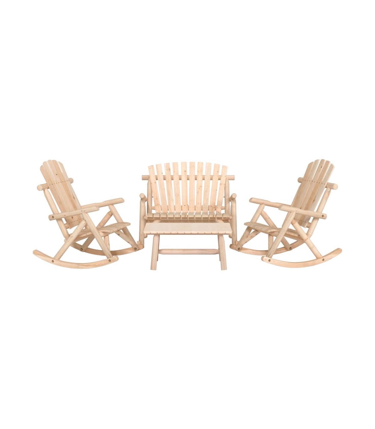 Enjoy a cosy leisure time with your family in your outdoor space on this wooden garden lounge set! Solid spruce wood: Made of solid spruce wood, the lounge set is durable and stable.Rocking design: Relax by sitting comfortably on the garden rocking chairs and garden rocking benches while enjoying a calming, gentle rocking motion.Comfortable seat experience: With curved form-fitting seats, armrests, and Adirondack-style backrests, the lounge chairs and wooden rocking benches allow you to sit back comfortably after a long day.Sturdy tabletop: The sturdy tabletop of the coffee table is ideal for placing dishes, drinks and snacks. Good to know:To make sure your outdoor furniture stays beautiful, we recommend protecting it with a waterproof cover.It is recommended to treat the wood with an outdoor paint, in order to extend the lifetime of the product.
