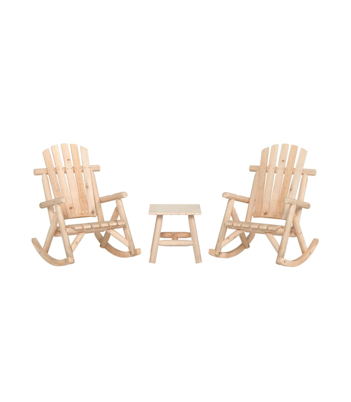 Enjoy a cosy leisure time with your family in your outdoor space on this wooden garden lounge set! Solid spruce wood: Made of solid spruce wood, the lounge set is durable and stable.Rocking design: Relax by sitting comfortably on the garden rocking chairs and garden rocking benches while enjoying a calming, gentle rocking motion.Comfortable seat experience: With curved form-fitting seats, armrests, and Adirondack-style backrests, the lounge chairs and wooden rocking benches allow you to sit back comfortably after a long day.Sturdy tabletop: The sturdy tabletop of the coffee table is ideal for placing dishes, drinks and snacks. Good to know:To make sure your outdoor furniture stays beautiful, we recommend protecting it with a waterproof cover.It is recommended to treat the wood with an outdoor paint, in order to extend the lifetime of the product.