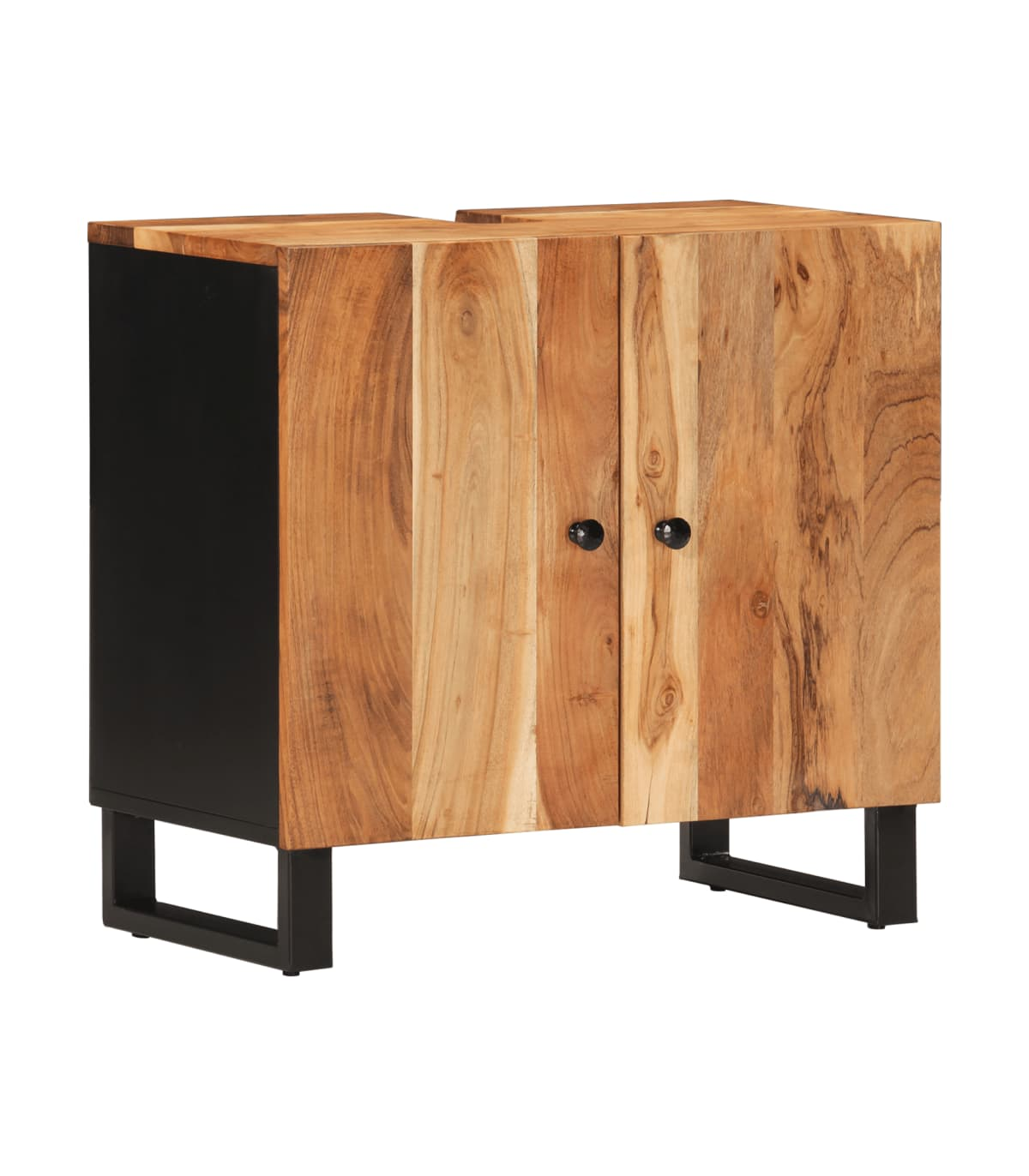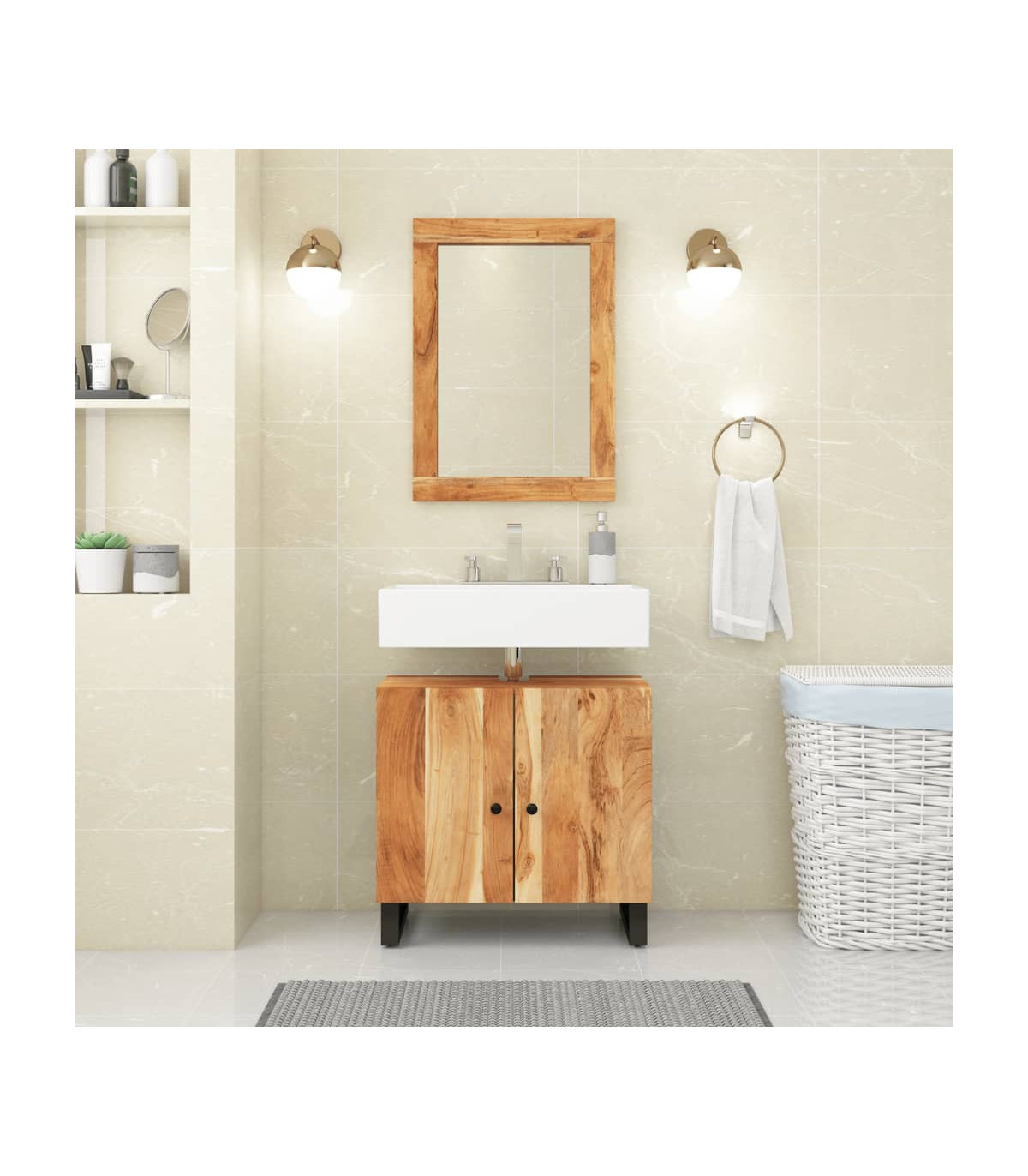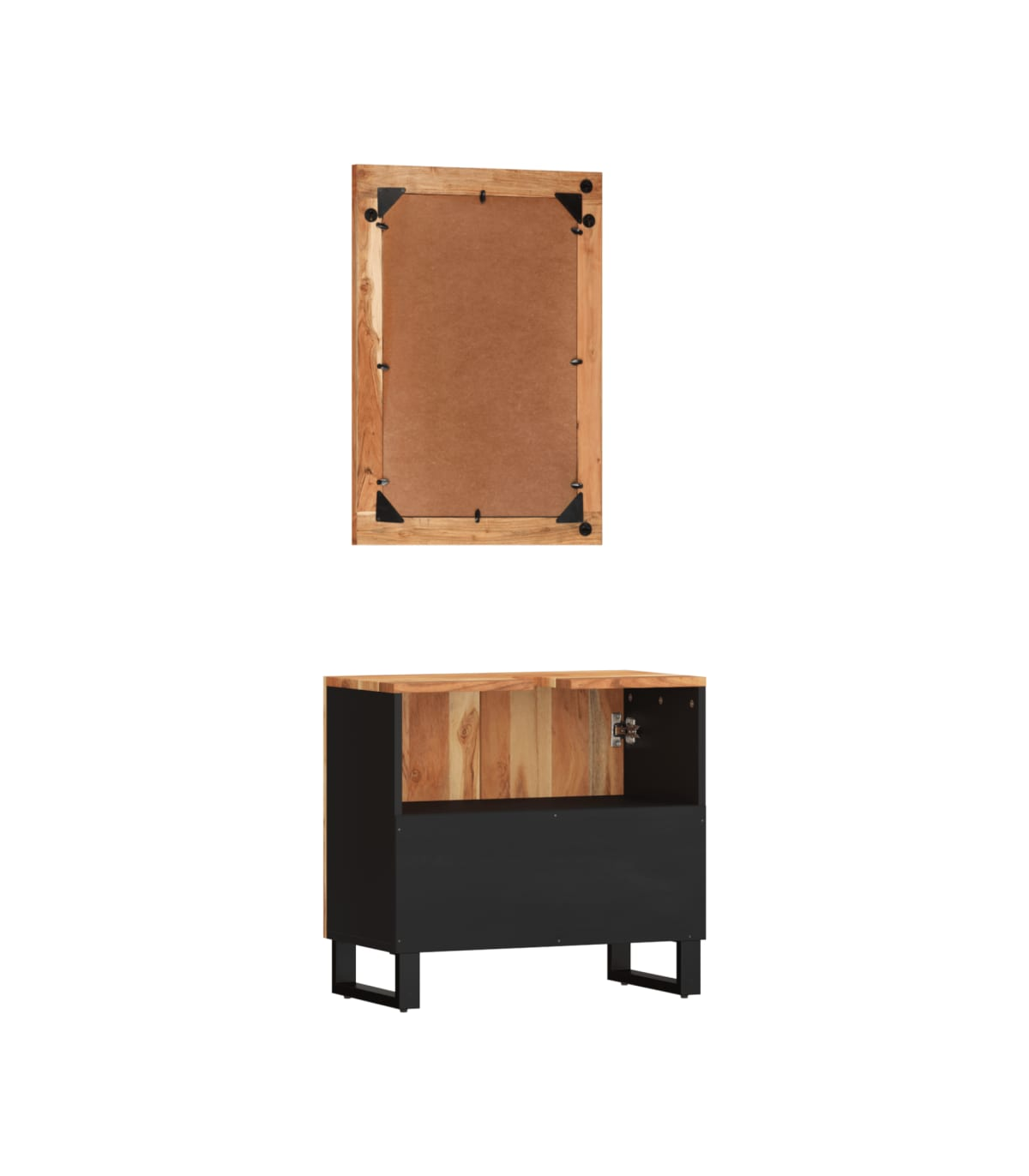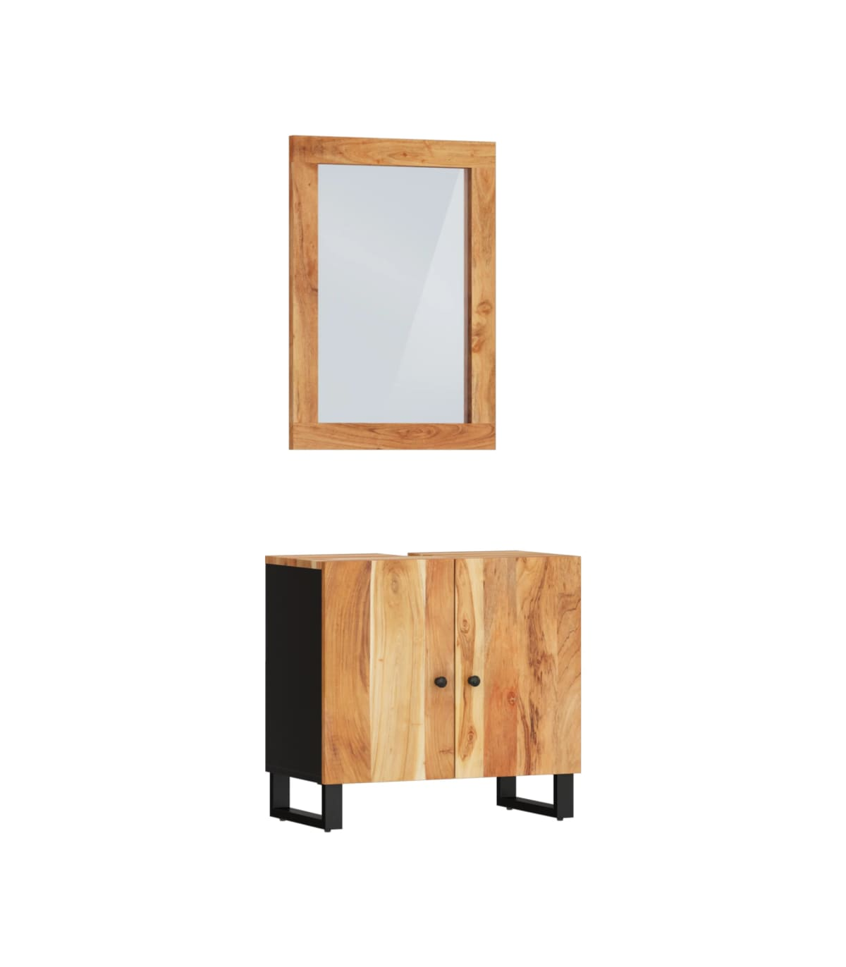 This handy bathroom furniture set is an excellent addition to your bathroom, giving it a tidy and striking appearance! Solid acacia wood: The cabinet is made of solid acacia wood combined with engineered wood. Solid acacia wood is a beautiful natural material. Acacia wood is a tropical hardwood, which is dense, sturdy, and durable.Ample storage space: The bathroom storage cabinet provides ample storage space for you to store items in your bathroom.Stable feet: The iron feet of the bathroom cabinet ensure sturdiness and stability.Practical design: The top of the bathroom sink cabinet is ideal for placing the sink.Clear image: The glass mirror face provides a clear image. So, you can enjoy a beautiful and natural reflection when standing in front of it. Warning:To prevent it being overturned, this product must be used with the provided wall attachment device.Good to know:The sink is not included in the delivery.Screws and plugs for inside the wall are not included. We advise to find and use screws and plugs suitable specifically for your walls. If you're not sure, you can consult with a professional. Please read and follow each step of the instructions.Each item is unique with variations in colours and grains. The delivery is random, ensuring the exclusivity and individuality of your product.