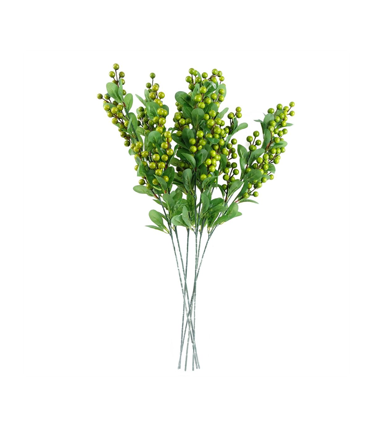Pack of 6 x Green berry stem with plastic leaves. Can be used to make arrangements with our other artificial flowers or as decorations on their own. Each stem measures 70cm overall height x 10cm x 10cm. These are easy to cut down shorter using a pair of wire cutters if required. Some of our photos show vases to give an idea of size and possibilities for arrangement but no vases or planters are included with these berries.