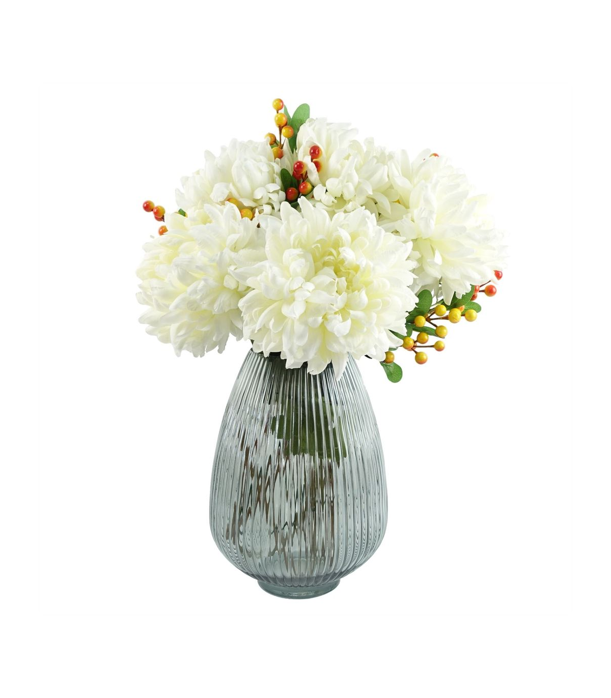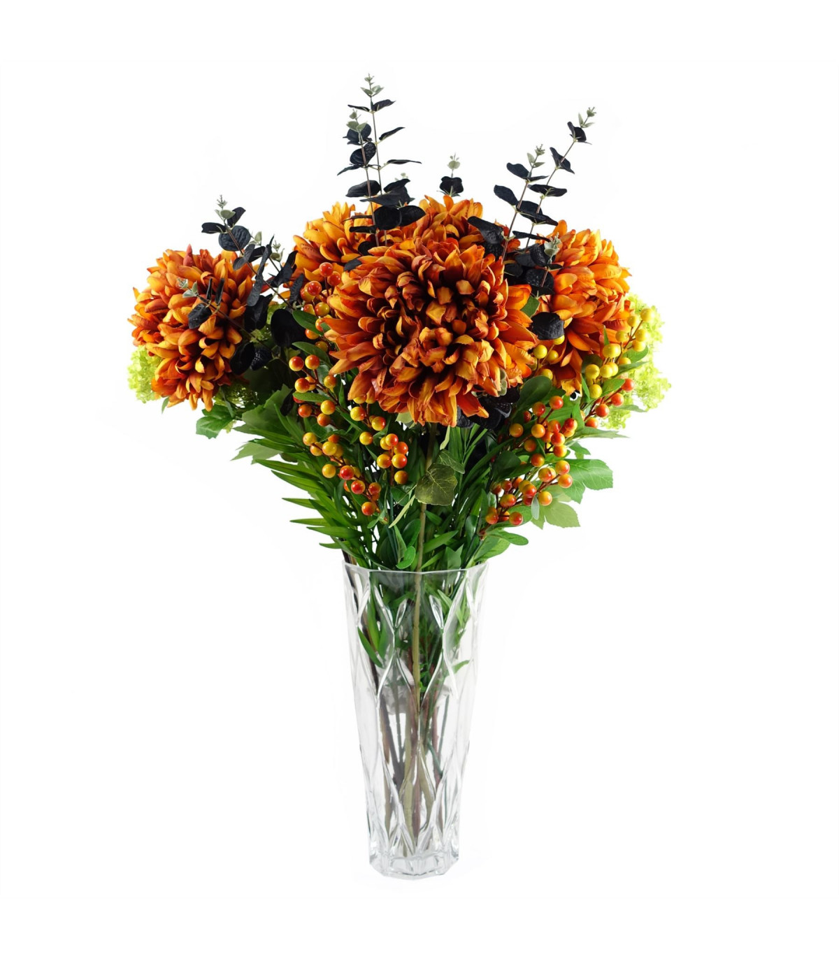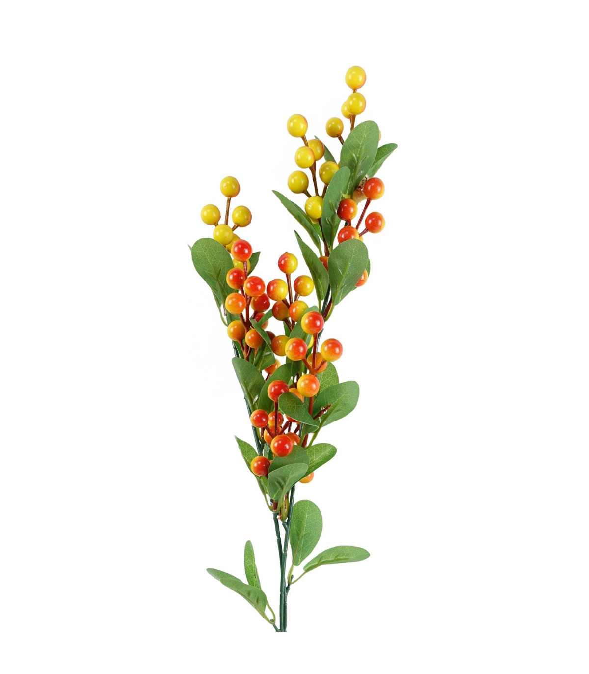Pack of 6 x Orange berry stem with plastic leaves. Can be used to make arrangements with our other artificial flowers or as decorations on their own. Each stem measures 70cm overall height x 10cm x 10cm. These are easy to cut down shorter using a pair of wire cutters if required. Some of our photos show vases to give an idea of size and possibilities for arrangement but no vases or planters are included with these berries.