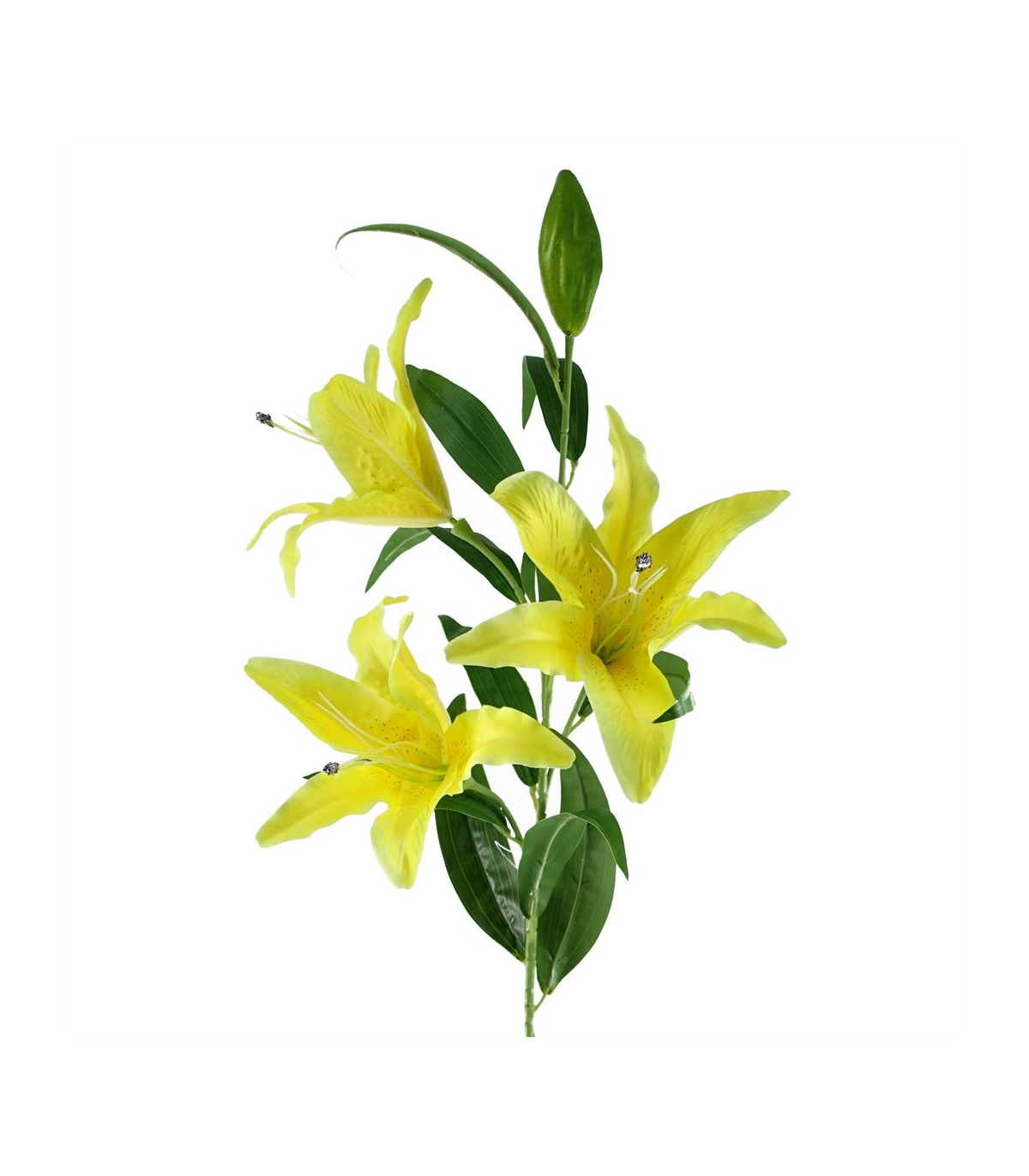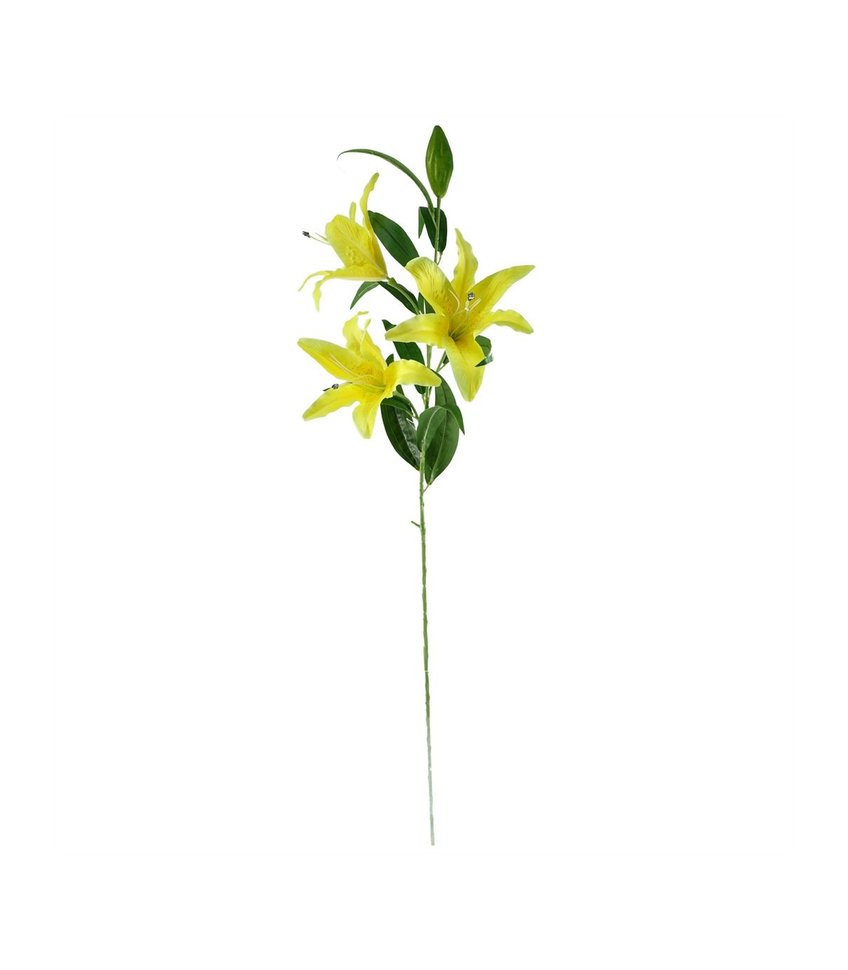 Pack of 6 x Yellow lily artificial flower stems. Can be used to make arrangements with our other artificial flowers or as decorations on their own. Each stem measures 100cm overall height x 22cm wide x 22 deep and has 3 flowers and a bud. Flowers are silk. The stems are wired so these can be shaped and bent to arrange. These are easy to cut down shorter using a pair of wire cutters if required. Some of our photos show vases to give an idea of size and possibilities for arrangement but no vases or planters are included with these flowers.