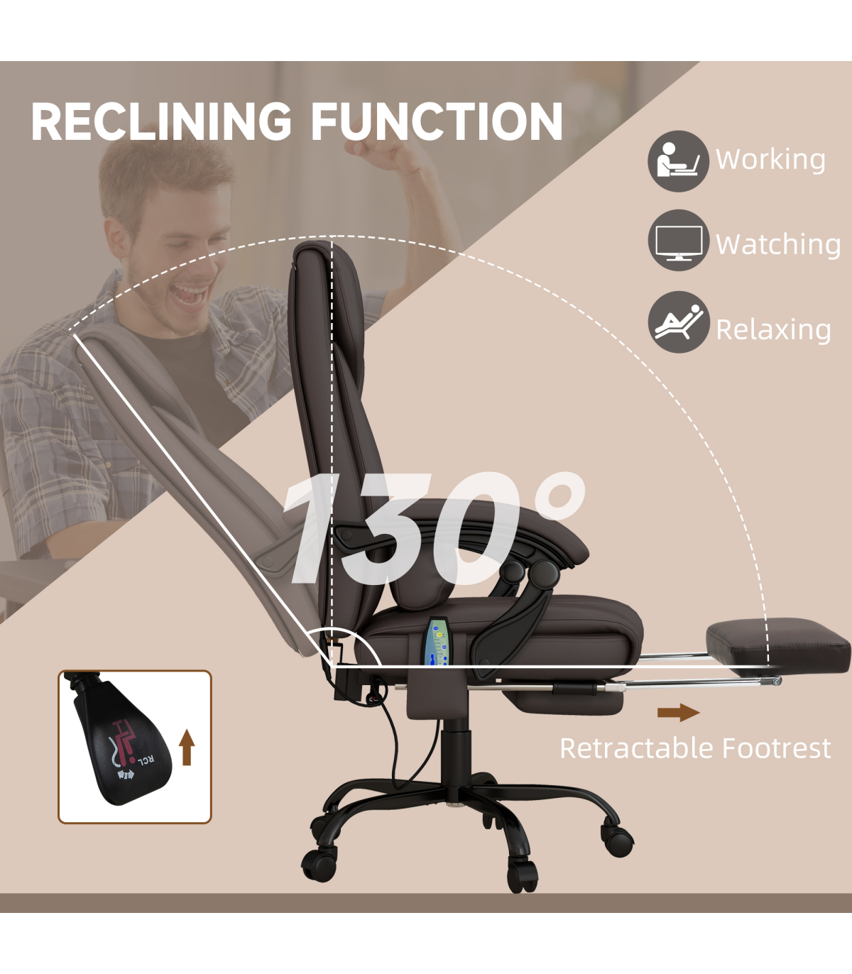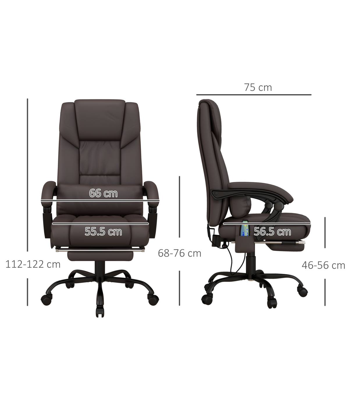 - Height adjustable via the pneumatic rod under the seat - Adjustable backrest to a maximum 130° angle, with manual footrest which slides out underneath seat - Massaging vibration on six different points: two on shoulder, two on lower waist/back and two on thighs - Attached remote for control, with five different function modes - Five castor wheels on base for easy movement whilst seated - Thick sponge padding for comfort, with sleek faux leather upholstery for style - Maximum weight 120kg, assembly required - Powered by electricity, equipped with British Standard plug