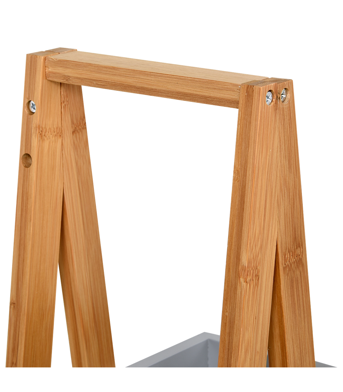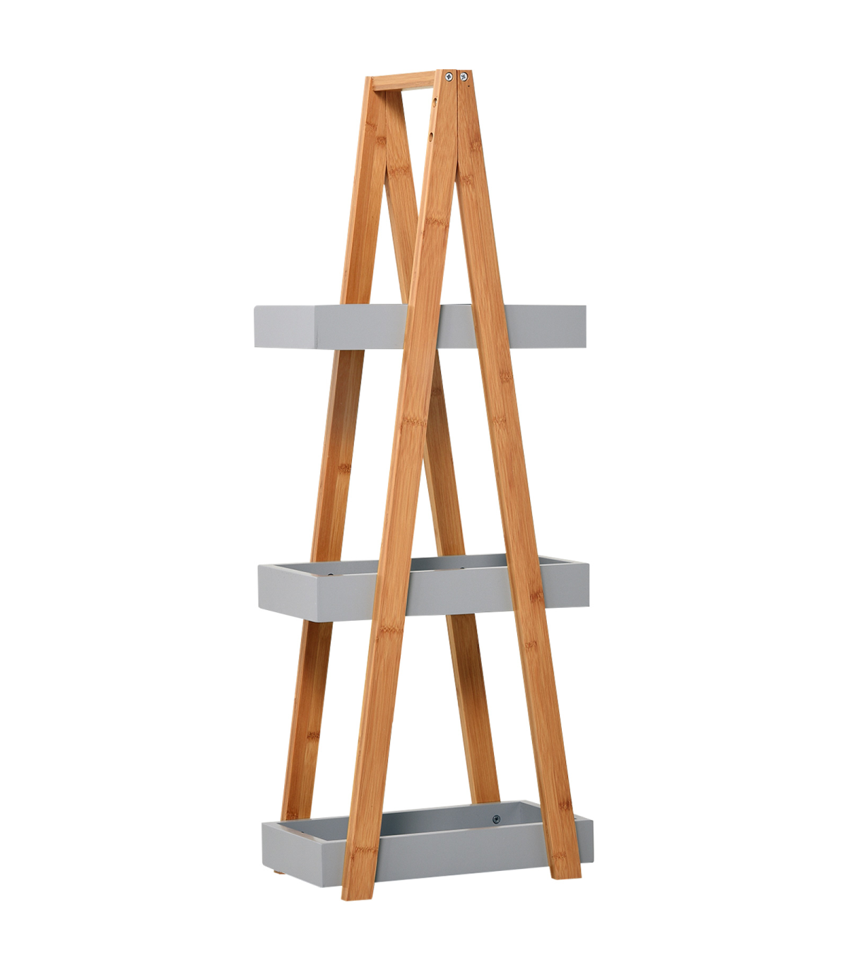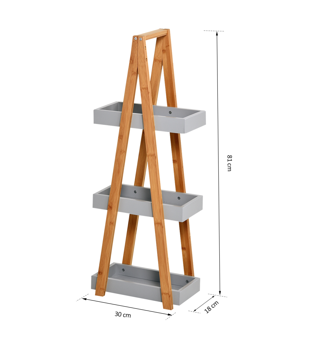 - Three-tier shelving unit: store lots in your bathroom and beyond - Bamboo frame is sturdy and supportive - 'A' shape frame to stand balanced and steady - Compact size, this narrow shelving unit is suitable for all spaces - Top handle to carry easily - Maximum load 5kg per storage tray, assembly required