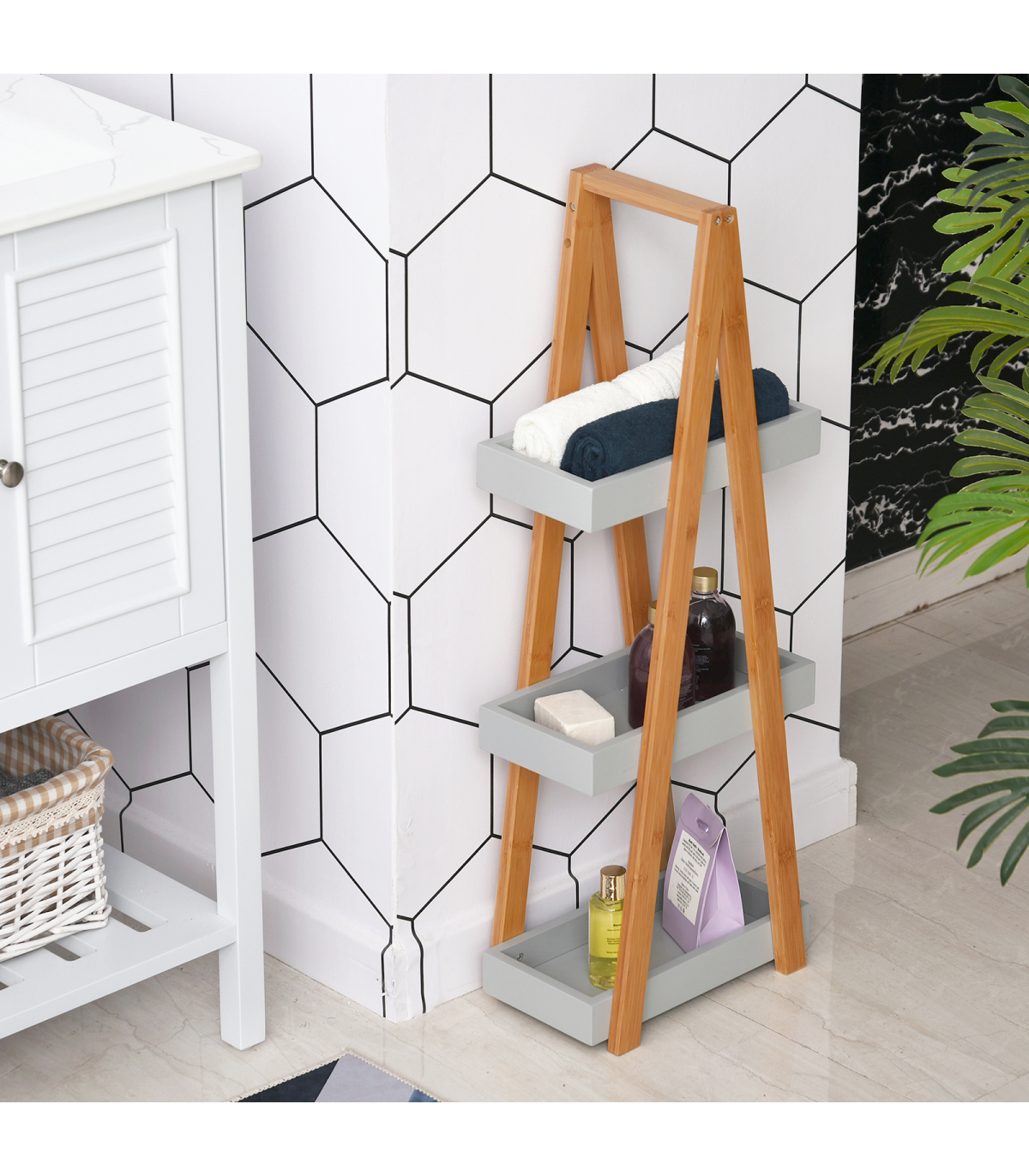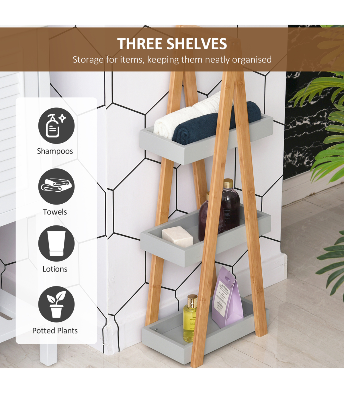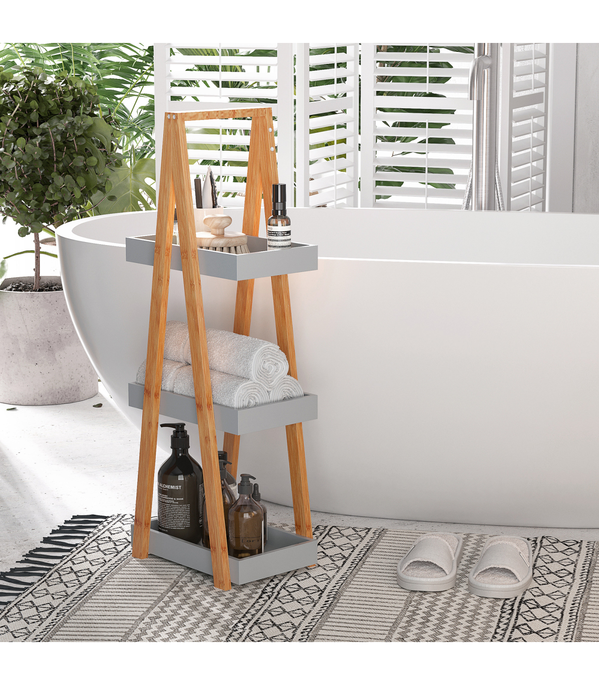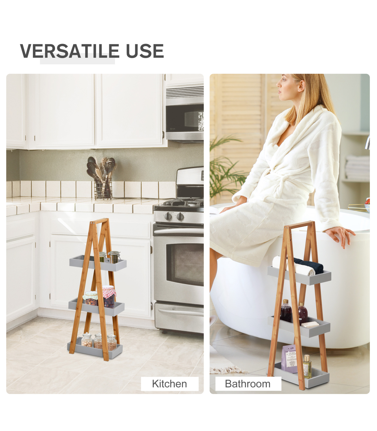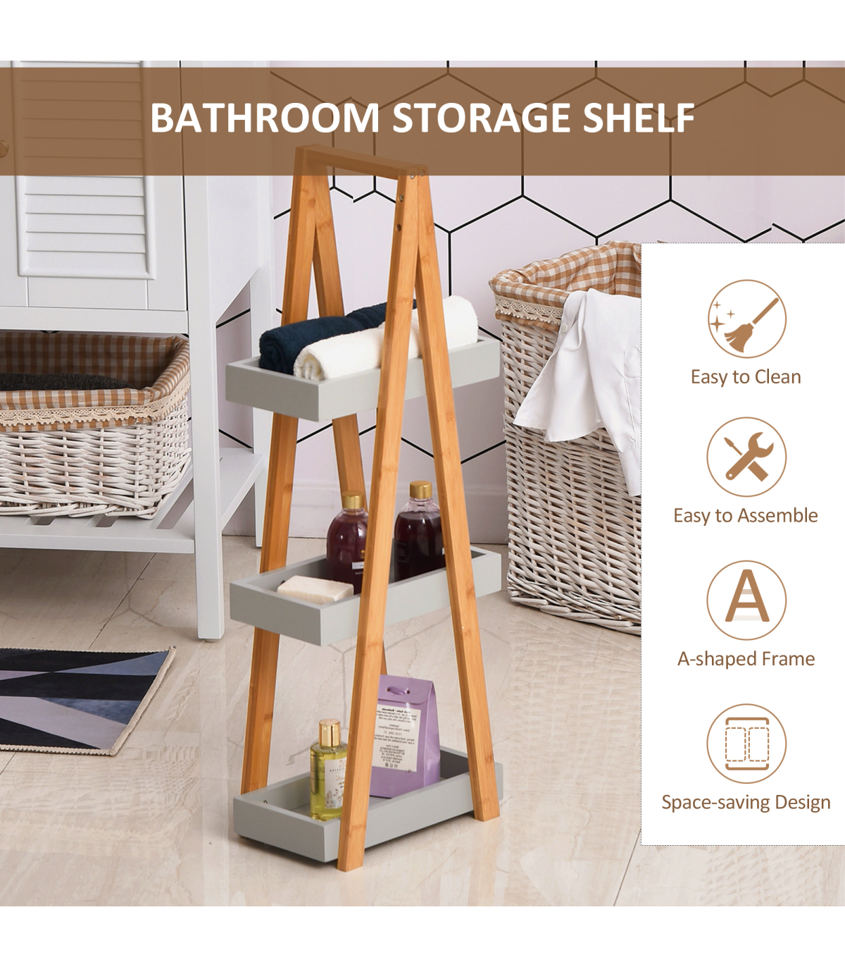 Step up your 'A' storage game: bring this kleankin bathroom shelf into your space. A bamboo frame means a durable structure which is suitable in moisture-filled environments formed into an 'A' shape to help with the overall balance. It is fitted with three tray shelves - making it super easy to store and organise. A flat top panel acts as a handle, so you can carry it around easily.
