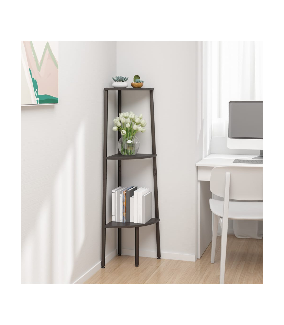 Create an extra storage area in a limited space with this 3-tier corner shelf! Strong steel construction: The storage shelf has a strong steel frame, which ensures sturdiness and stability.Ample storage space: The corner bookcase takes little space while offering ample space to store your books, plants, picture frames and any additional stuff.Wide application: The practical shelf is perfectly suitable for your home and office, including your living room, bathroom, bedroom, balcony, etc. WARNING:To prevent overturning, this product must be used with the wall attachment device provided.Note:Each product comes with an assembly manual in the box for easy assembly.