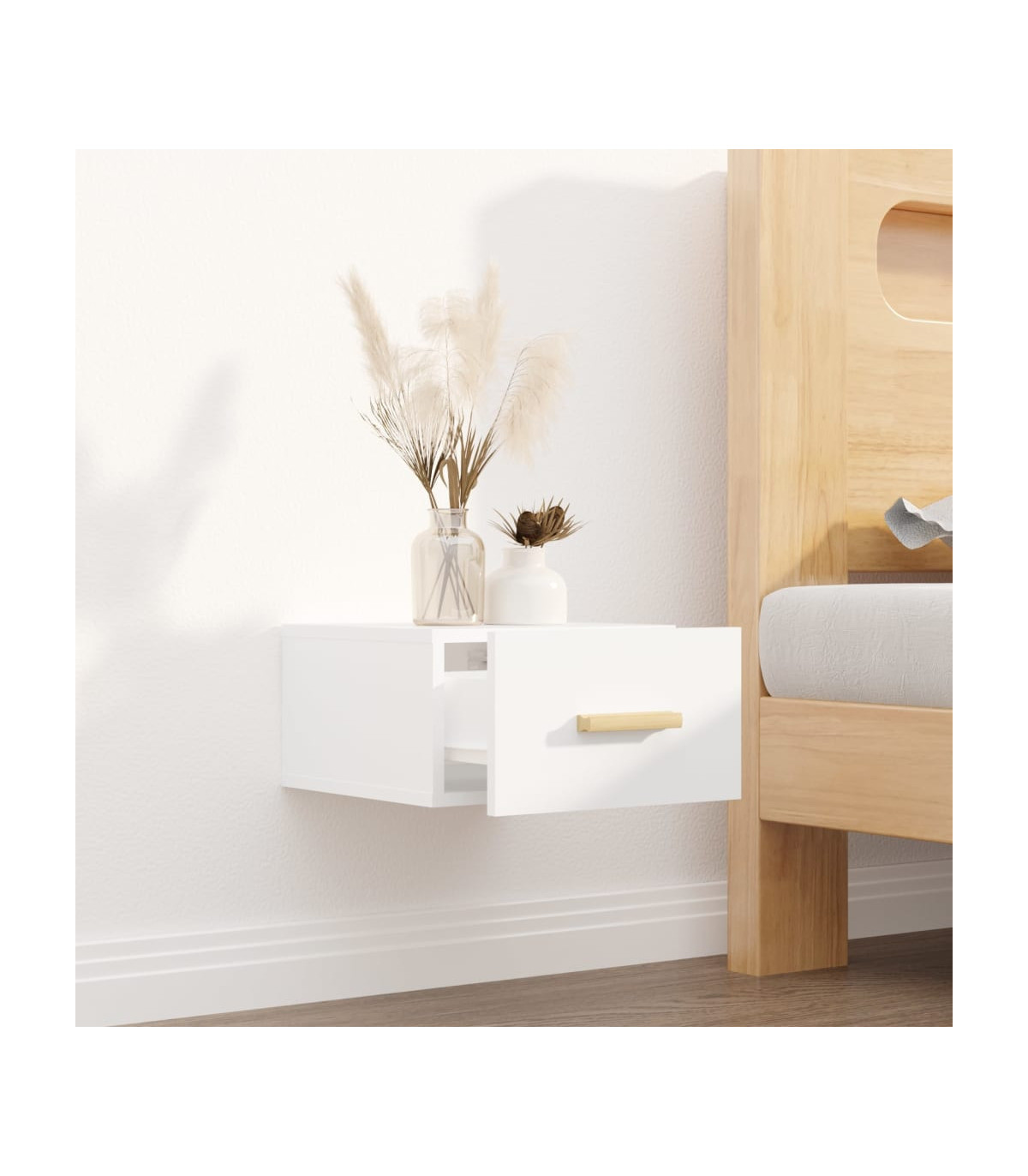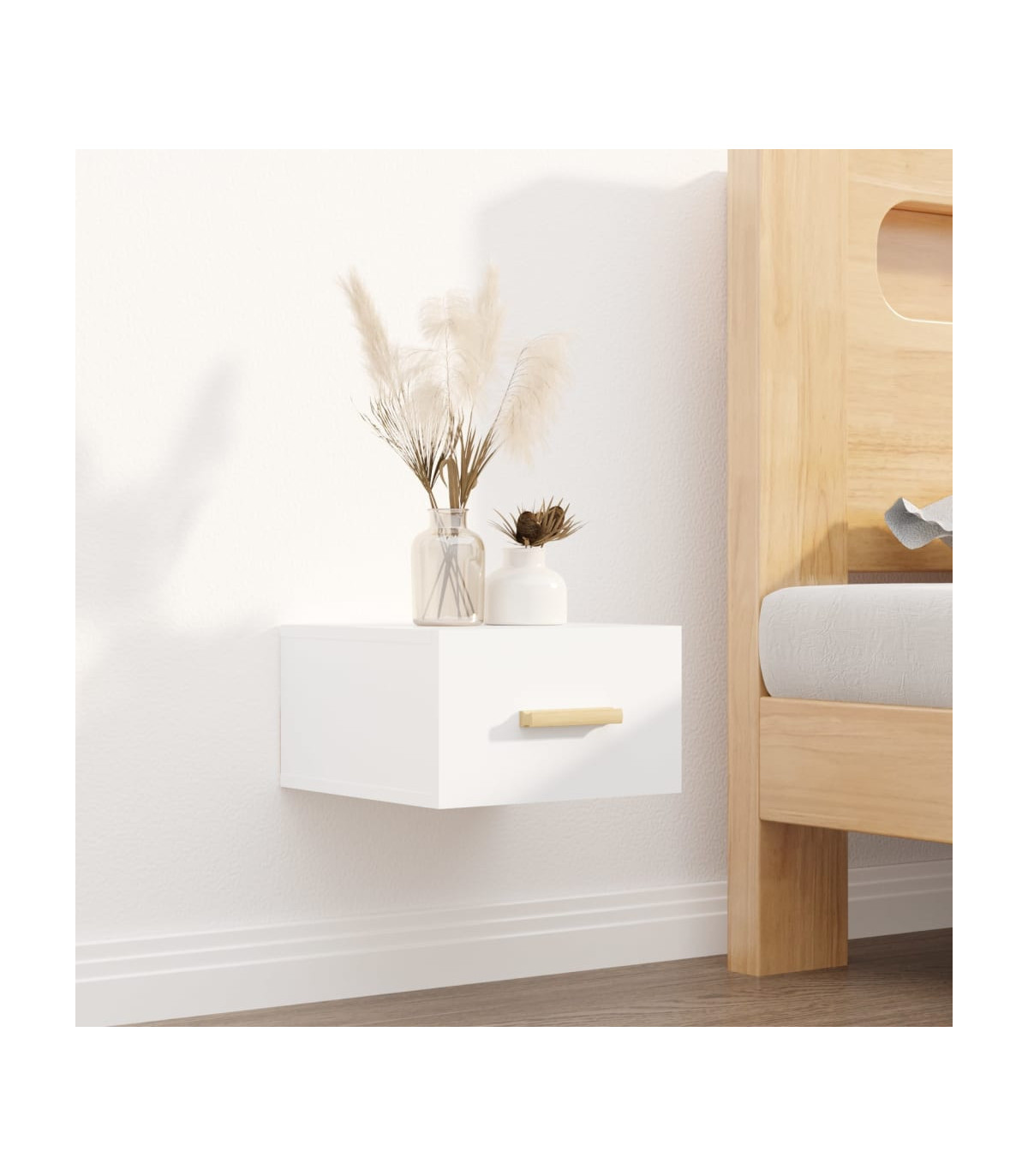 This wall-mounted bedside cabinet set is stunning, making it a good solution to maximise your space. It is also an excellent decoration for your empty walls. Sturdy material: The engineered wood is of exceptional quality with smooth surface and also features strength, stability and resistance to moisture.Wall-mounted design: The floating bedside units are excellent choices to keep items neatly organised in limited living space.Ample storage space: These floating night stands provide storage space to keep your magazines, books, remote controls and other small items within reach. Note:Screw(s) and plug(s) for inside the wall are not included. Seek and use screw(s) and plug(s) suitable for your walls. If you are uncertain, seek professional advice. Read and follow each step of the instruction carefully.Each product comes with an assembly manual in the box for easy assembly.