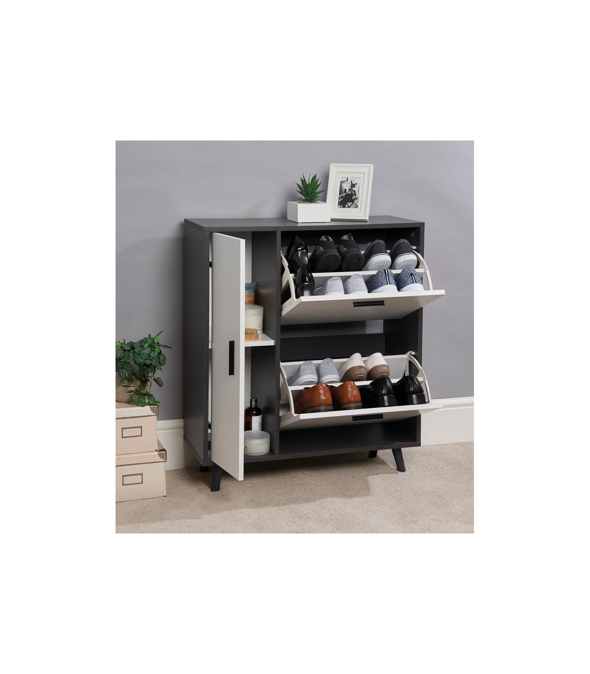 This stylish shoe cabinet will look fantastic in any Bedroom, Living Room, Hallway or indeed any room at home where storage is needed. Keep your shoes looking their best and stored neatly in one place.