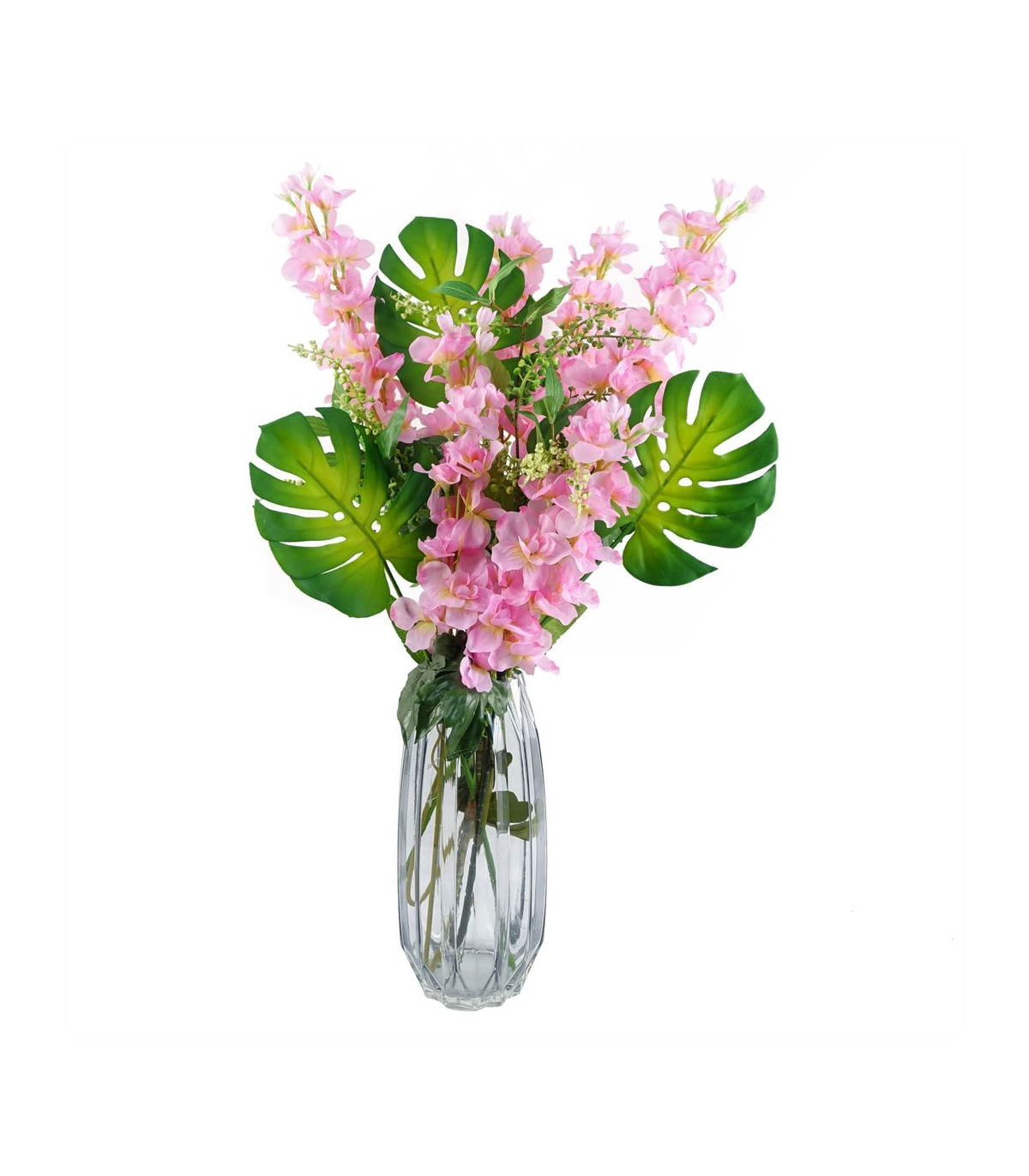 Pack of 6 x Pink Delphinium with silk petals. Can be used to make arrangements with our other artificial flowers or as decorations on their own. Each stem measures 75cm overall height x 10cm wide x 10 deep with an array of flowers and leaves. Flowers are silk. These are easy to cut down shorter using a pair of wire cutters if required. Some of our photos show vases to give an idea of size and possibilities for arrangement but no vases or planters are included with these flowers.