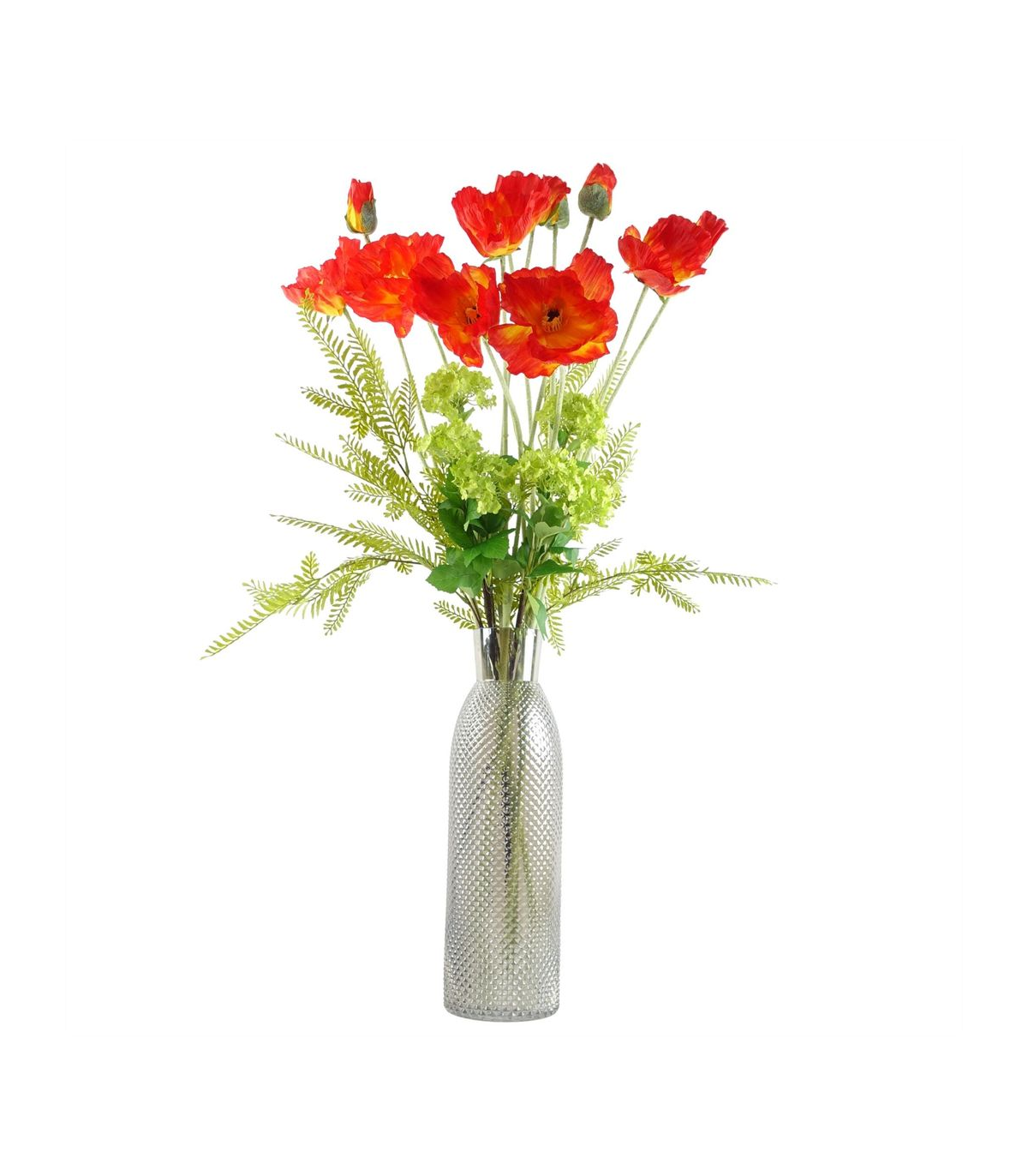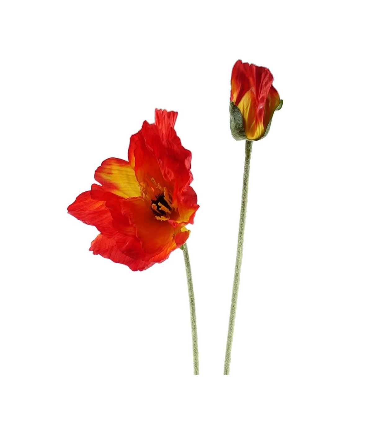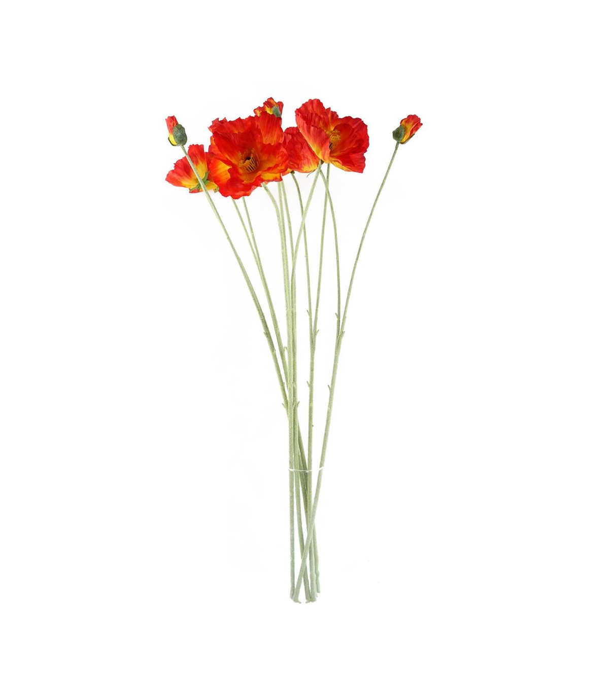 Pack of 6 x Artificial Poppy stem. Can be used to make arrangements with our other artificial flowers or as decorations on their own. Each stem measures 100cm overall height x 10cm wide and has two flowers. Flowers are silk. These are easy to cut down shorter using a pair of wire cutters if required. Some of our photos show vases to give an idea of size and possibilities for arrangement but no vases or planters are included with these flowers.