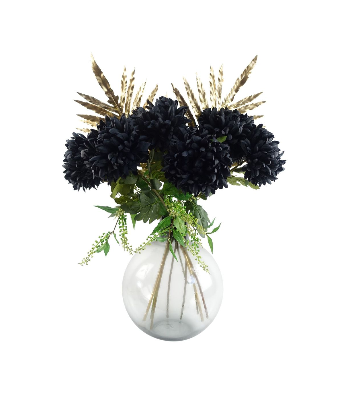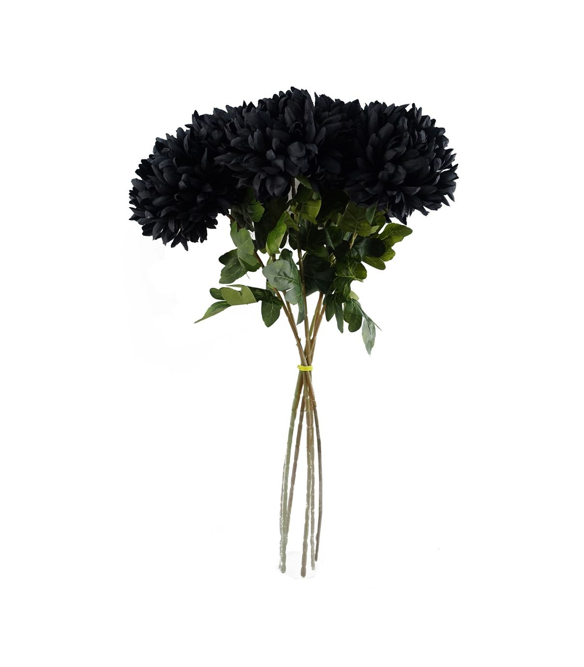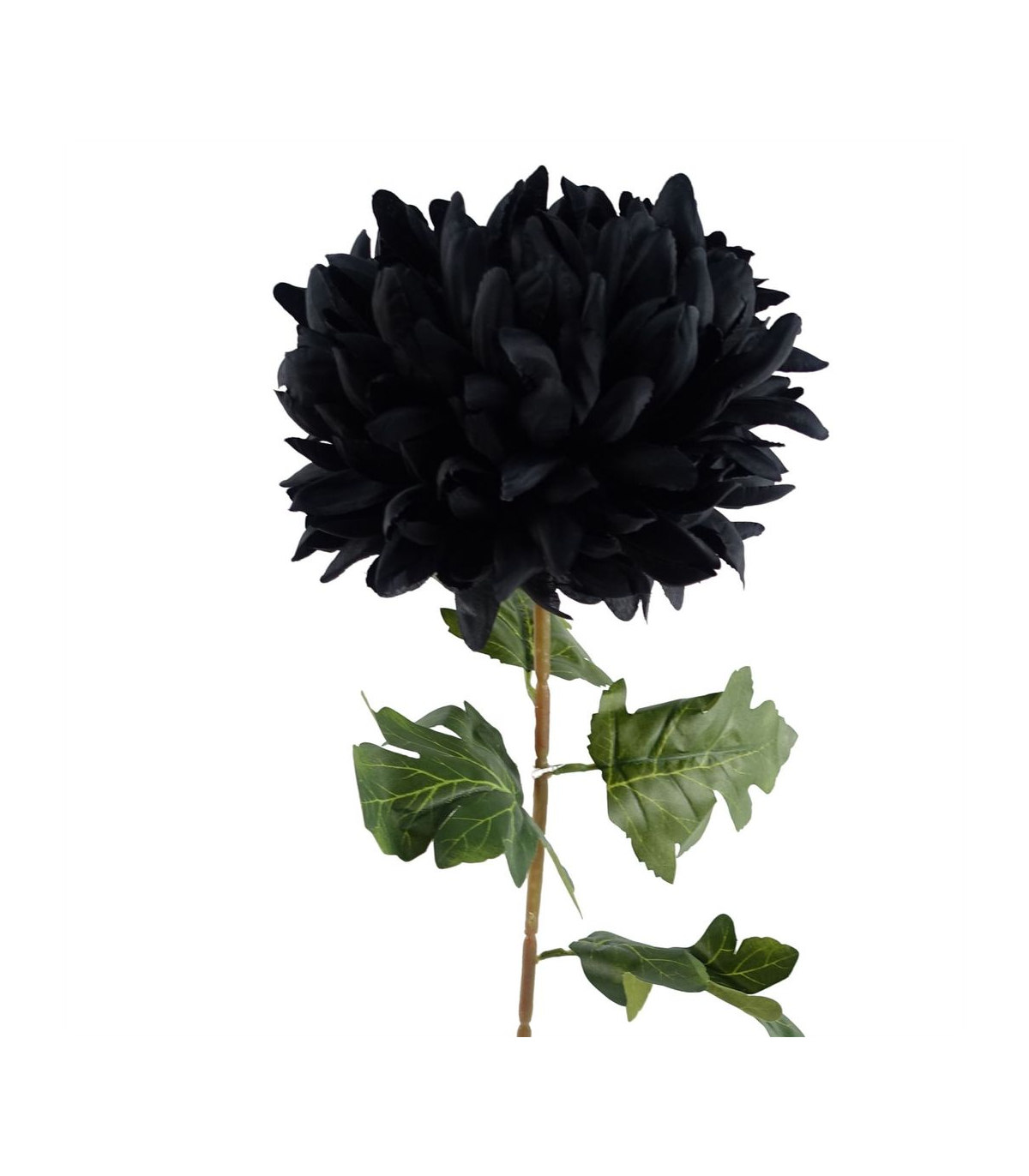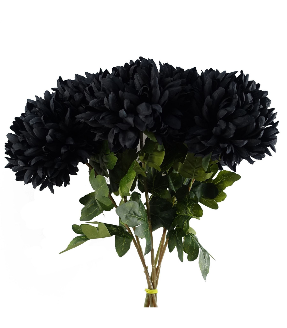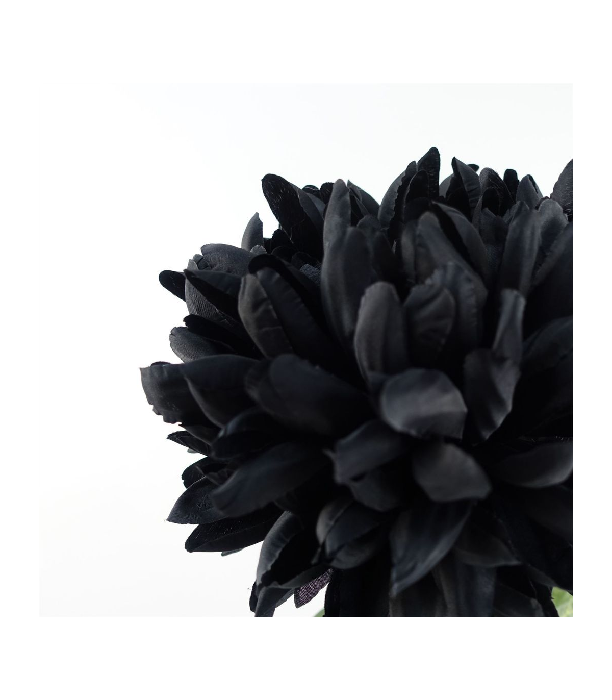 Pack of 6 x Black extra large Reflex Chrystanthemum with silk petals. Can be used to make arrangements with our other artificial flowers or as decorations on their own. Each stem measures 75cm overall height x 20cm wide x 20 deep and has a single large flower head. Flowers are silk. These are easy to cut down shorter using a pair of wire cutters if required. Some of our photos show vases to give an idea of size and possibilities for arrangement but no vases or planters are included with these flowers.