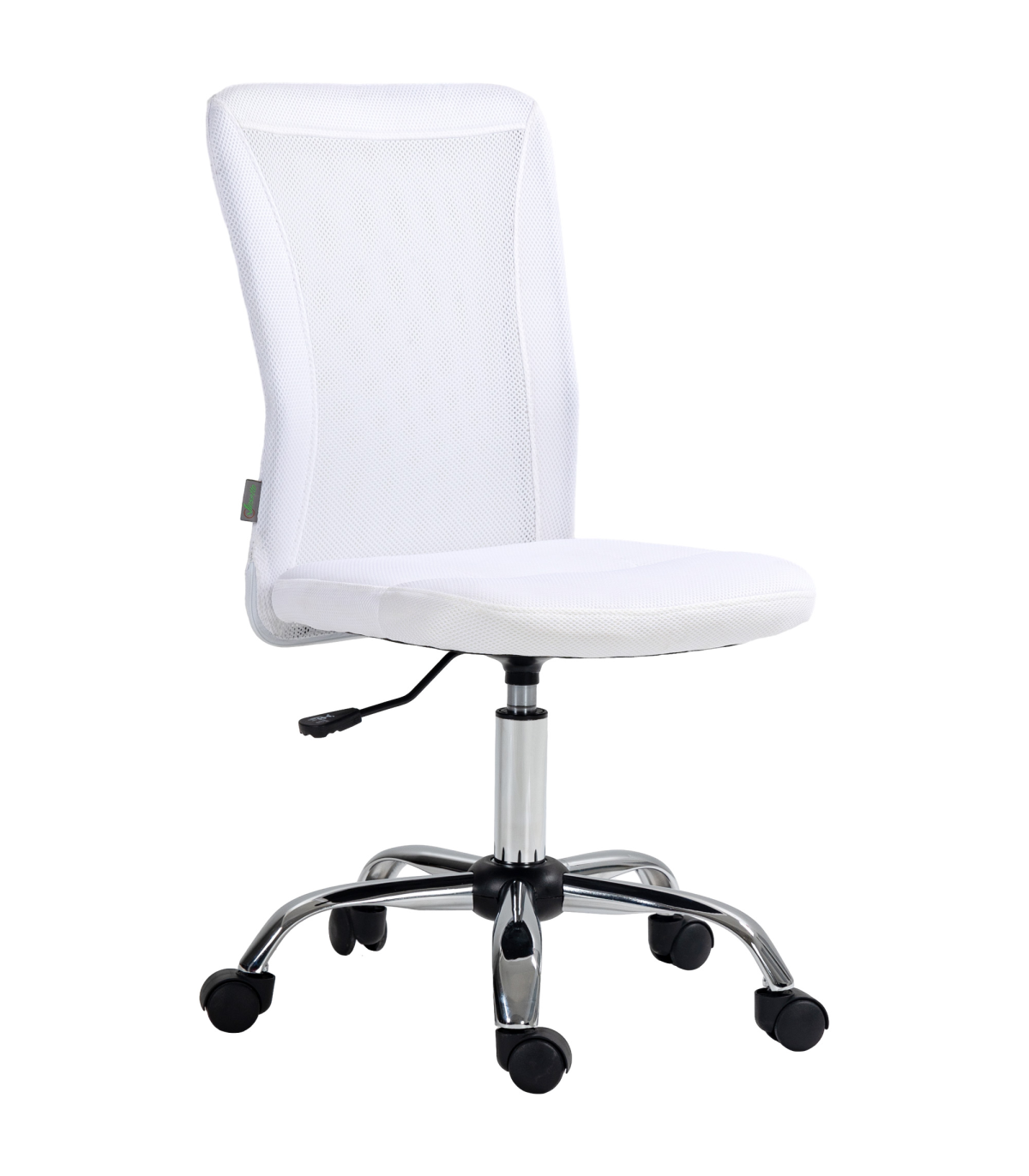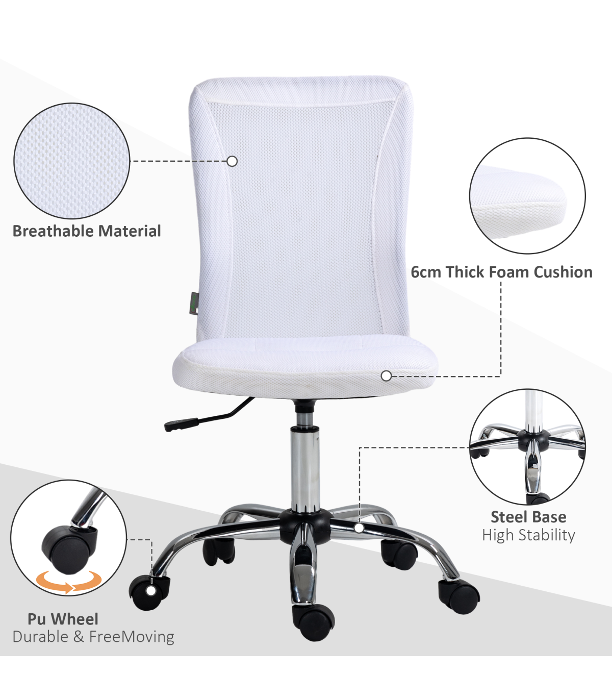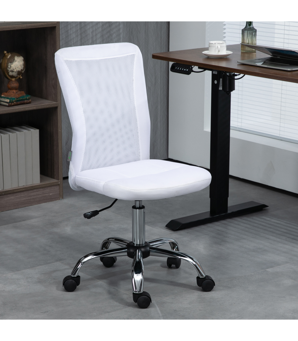 the mesh back is breathable. The slightly curved back offers support as you lean back. A steel base for weighted balance, with five wheels to move around easily. No arms mean this swivel chair fits underneath your desk at any height. A compact design is ideal for small places.