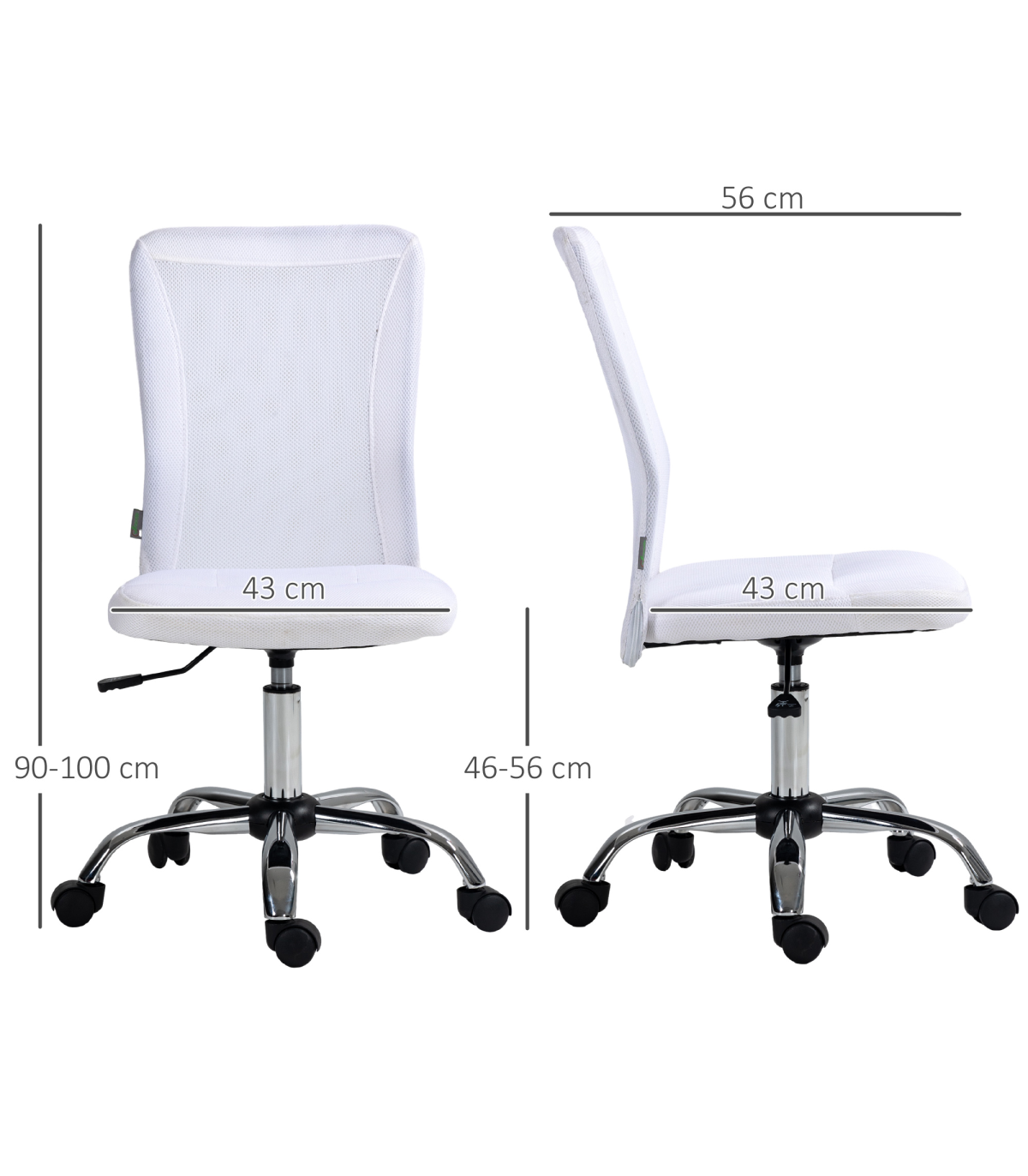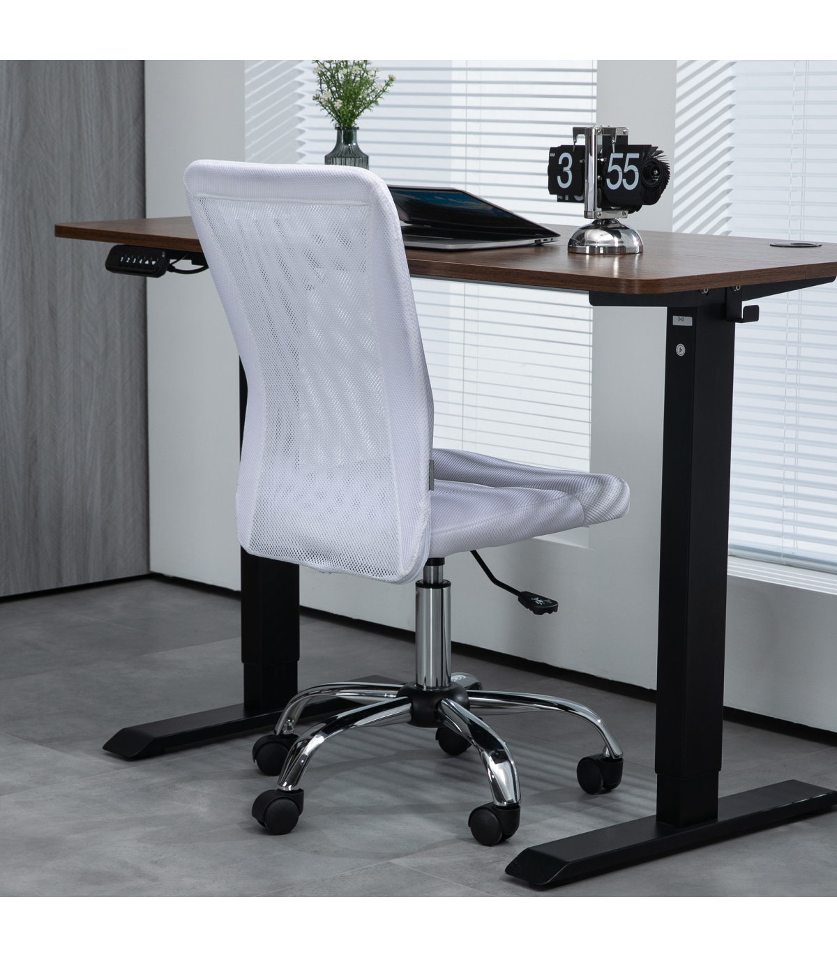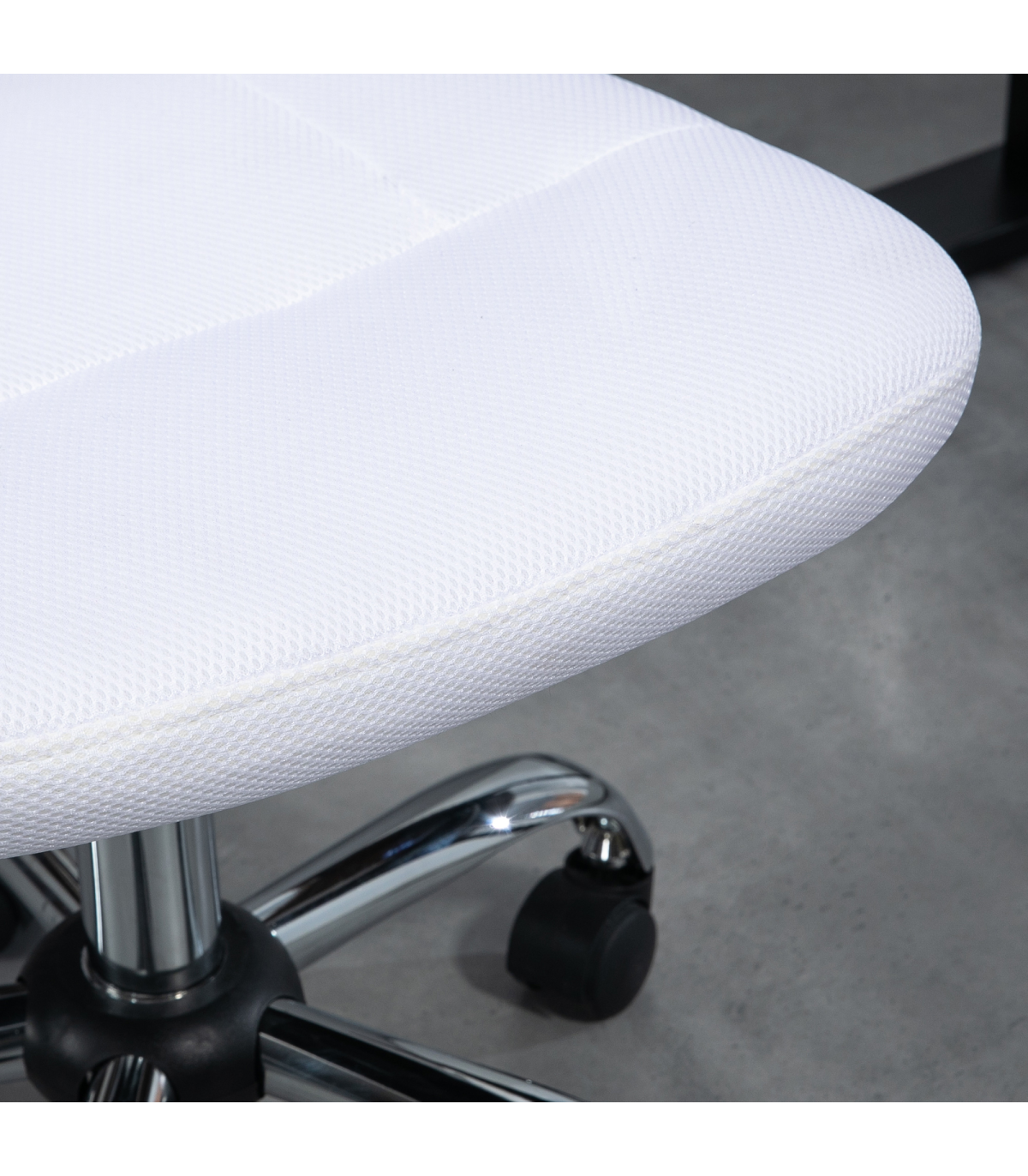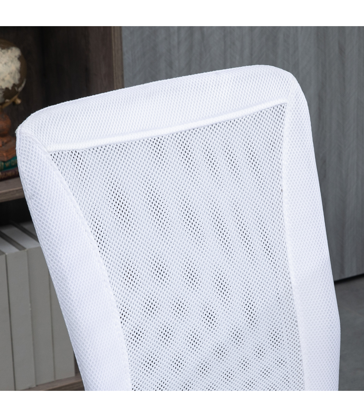 the mesh back is breathable. The slightly curved back offers support as you lean back. A steel base for weighted balance, with five wheels to move around easily. No arms mean this swivel chair fits underneath your desk at any height. A compact design is ideal for small places.