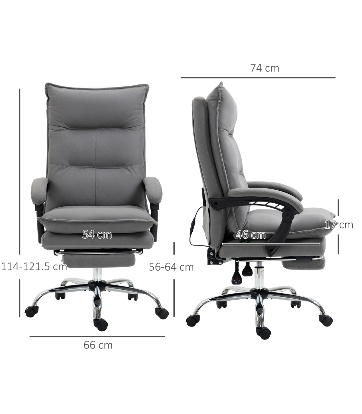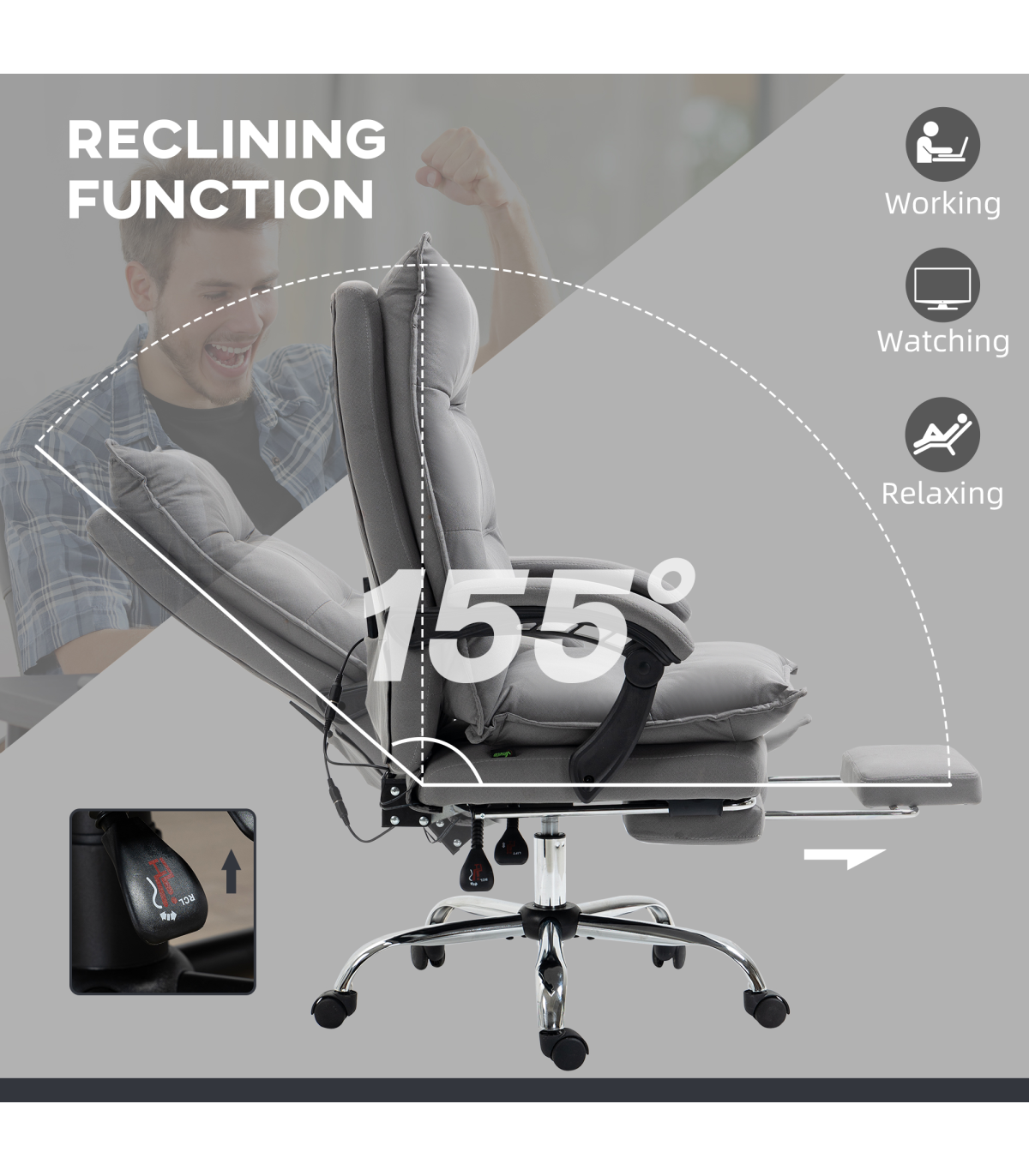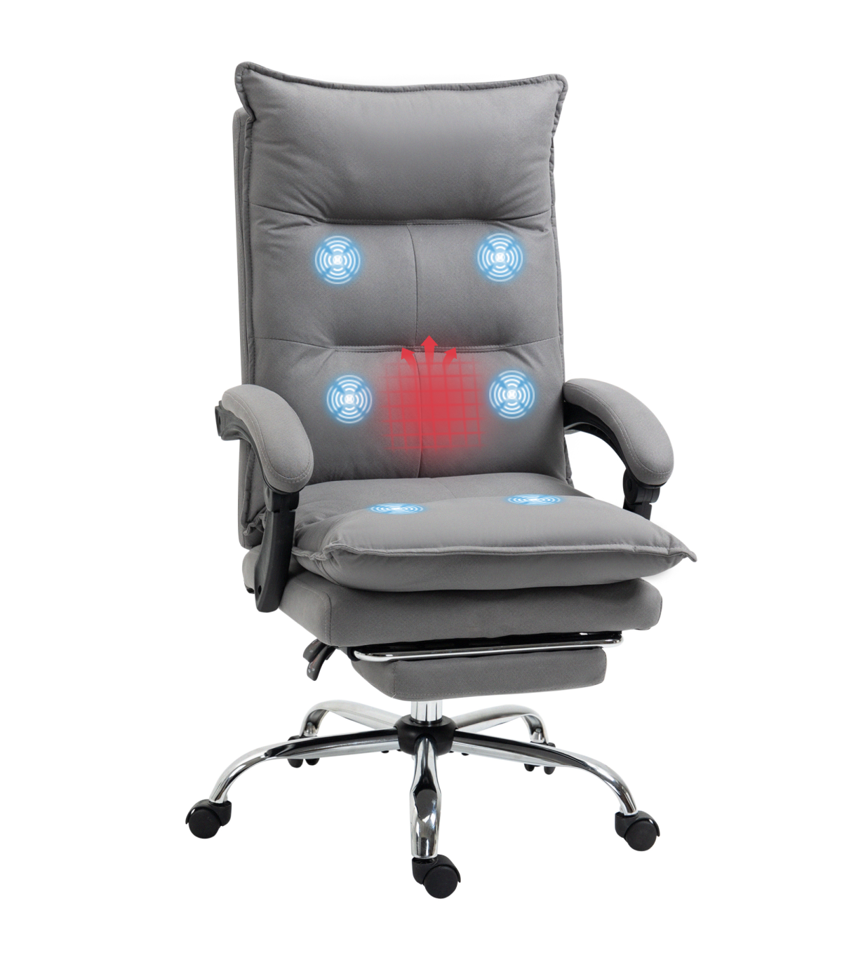 - "Vinsetto Microfibre Vibration Massage Office Chair with Heat, Footrest, Grey" - Description: - Home office chair features six points: five massage modes and one lumbar heat mode - 155° reclining back and manual footrest - Double padded PC chair is super comfortable, with soft microfibre upholstery - 114-121.5cm adjustable seat height: work at a level you want - Five wheels to move chair around easily when seated or empty - Maximum load 120kg, assembly required
