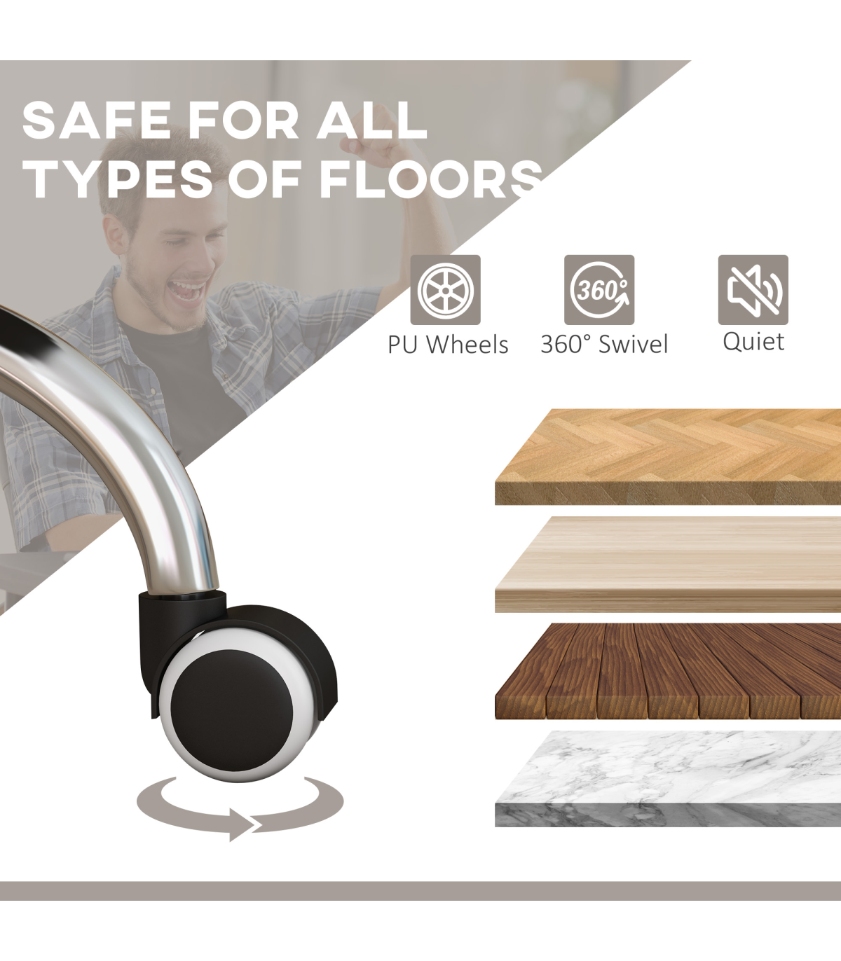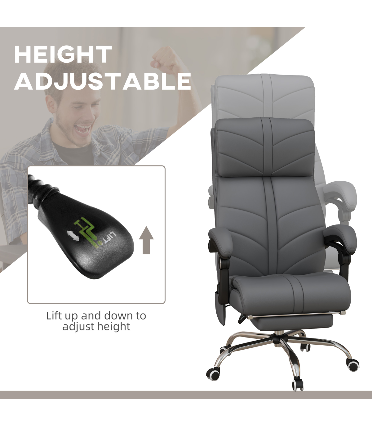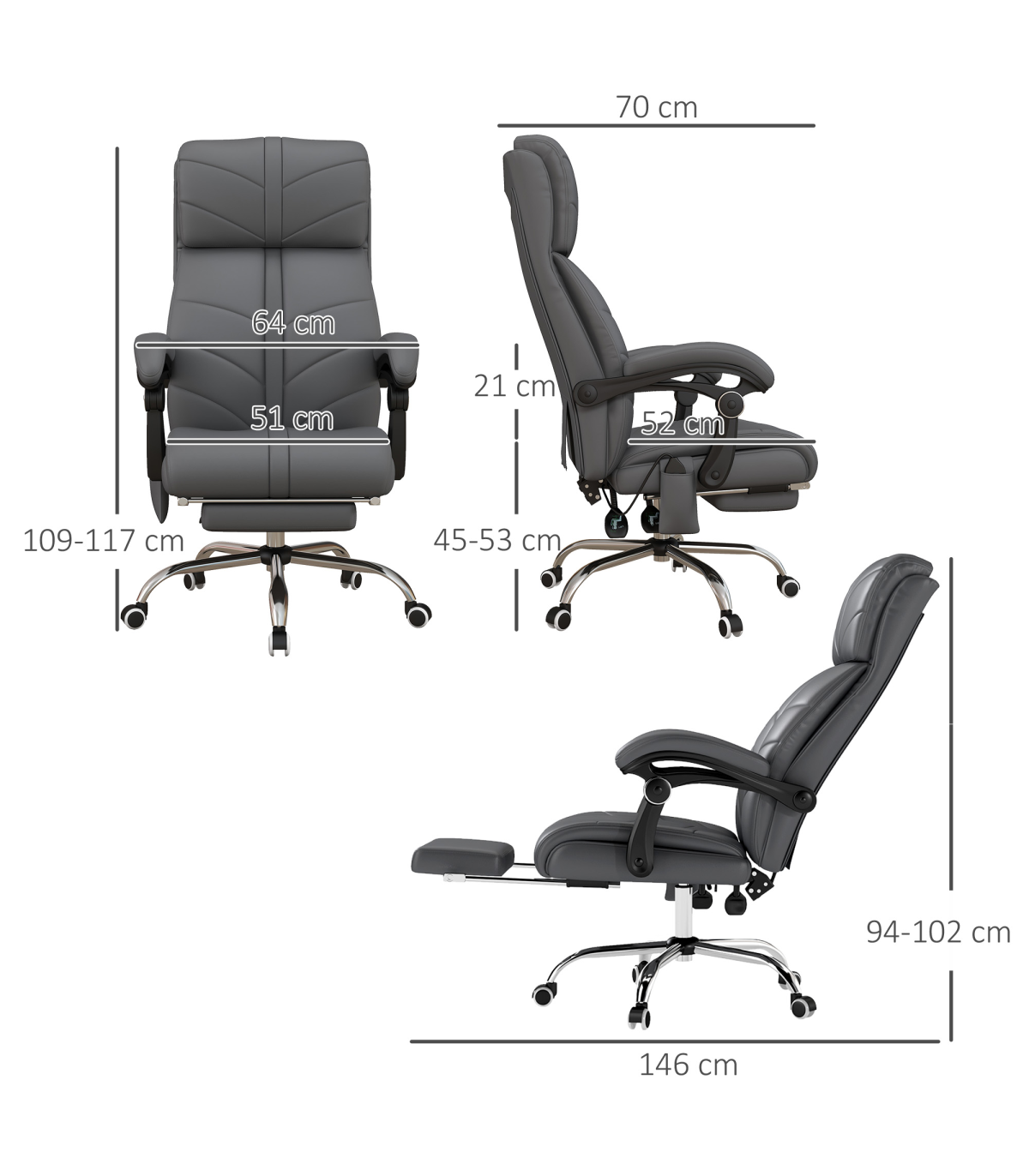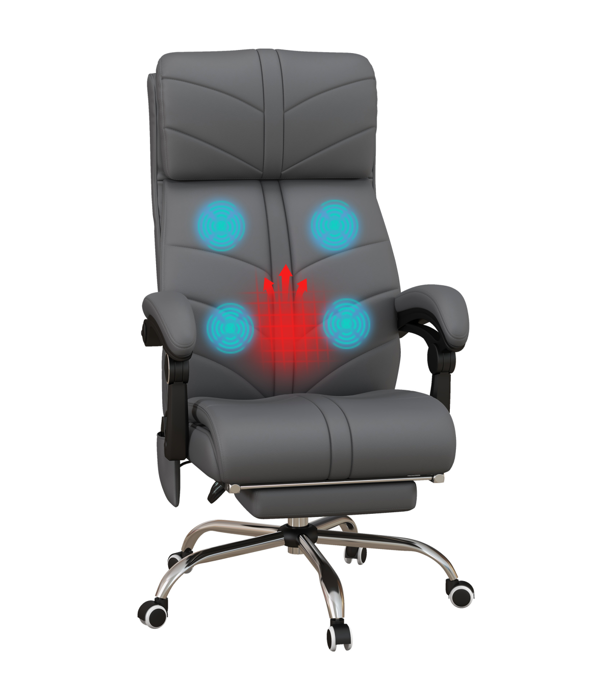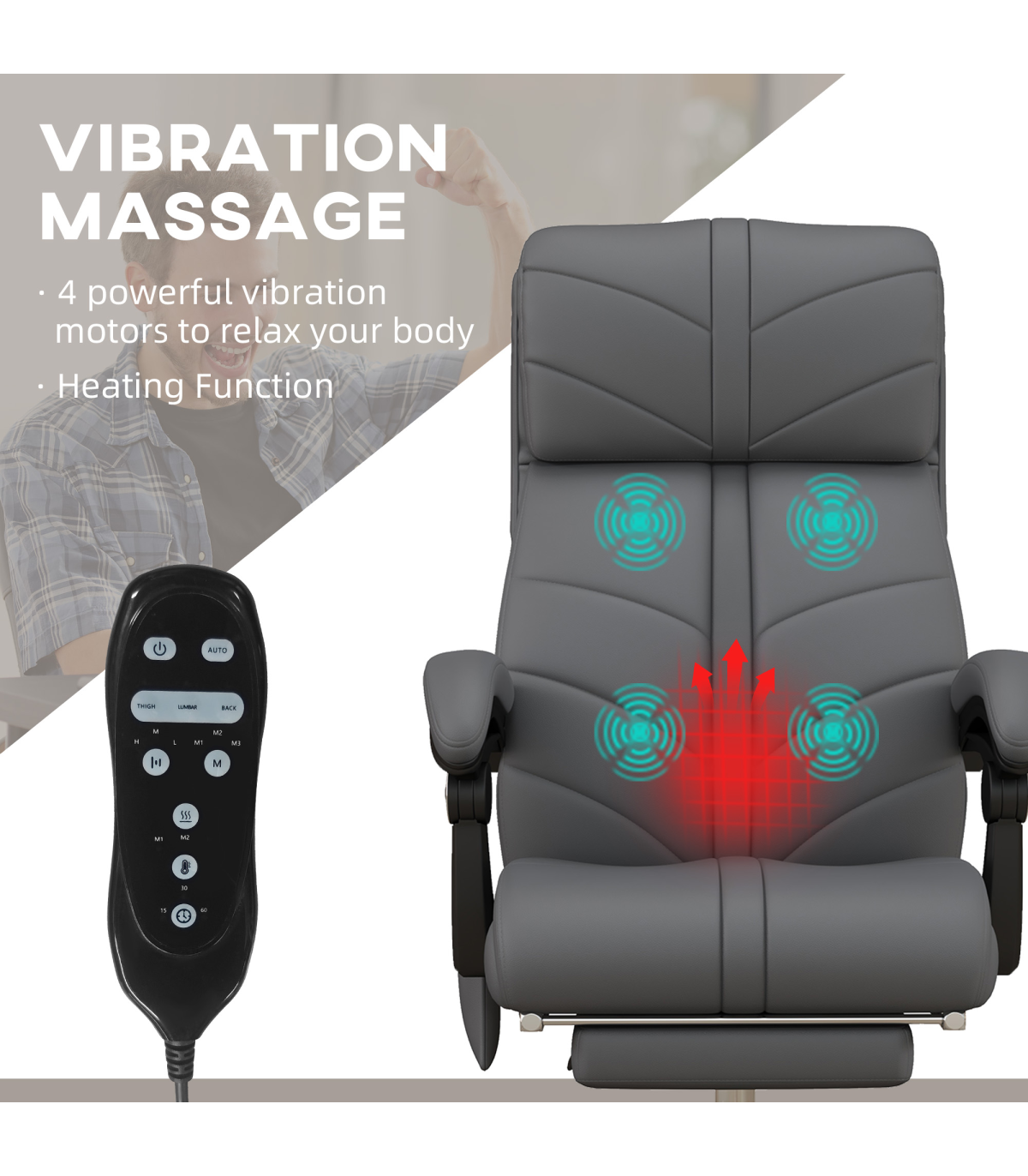 Vinsetto PU Leather Vibration Massage Office Chair with Heat, Footrest, Grey" Description: - Four vibration massage points with three modes and lumbar heating - Controlled by remote - 15min/30min/60min timer - 135° reclining back with footrest - Filled with sponge for comfort - Faux leather upholstery - Steel base for sturdiness - Adjustable seat height (45-53cm) - Five wheels for easy mobility - Maximum load: 120kg - Assembly required