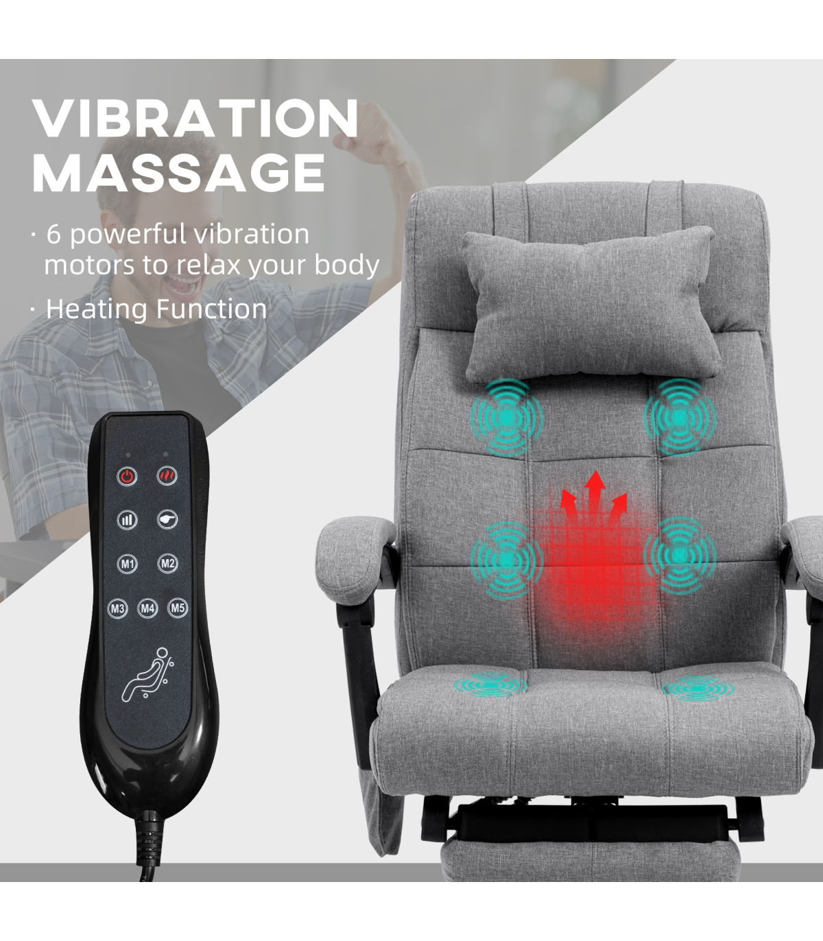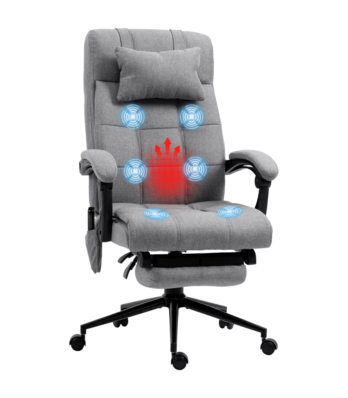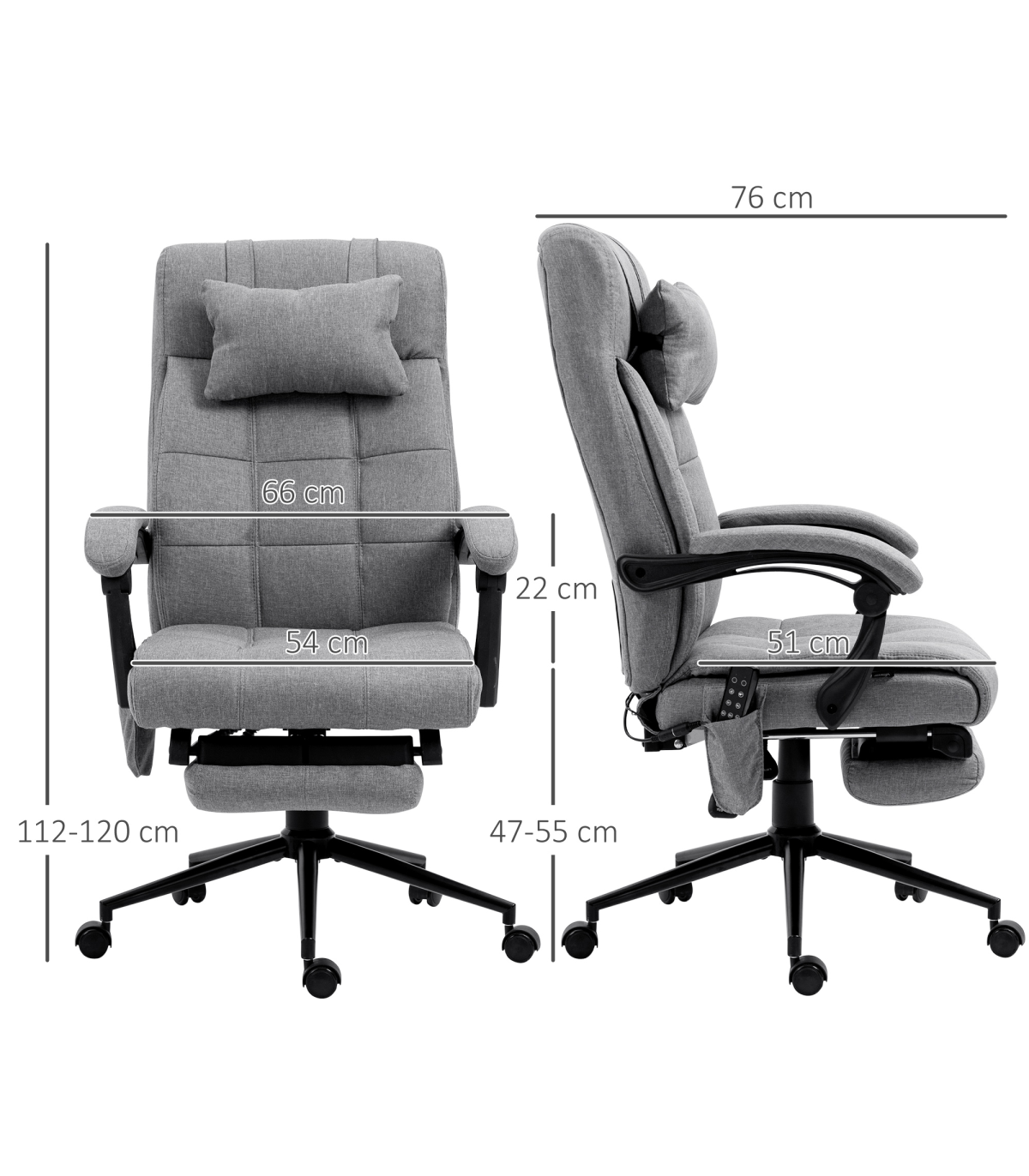 - "Vinsetto Fabric Vibration Massage Office Chair with Heat, Head Pillow, Grey" - Description: - Vinsetto Fabric Vibration Massage Office Chair with Heat, Head Pillow in Grey - Features six points: five massage modes and one lumbar heat mode - 155° reclining back and manual footrest - Padded PC chair for maximum comfort - Includes removable head pillow - Adjustable seat height from 112-120cm - Five wheels for easy movement - Maximum load capacity of 120kg - Assembly required