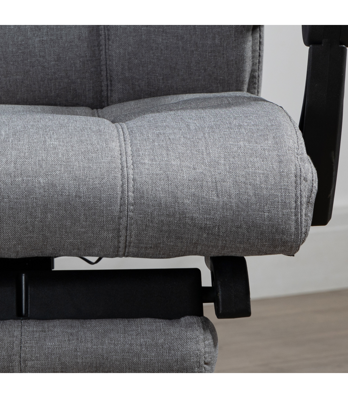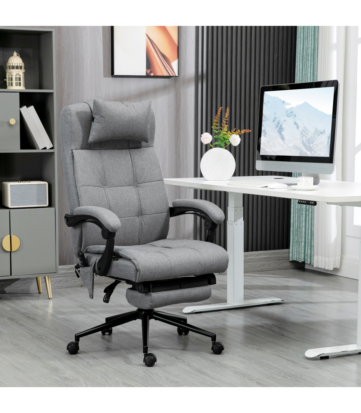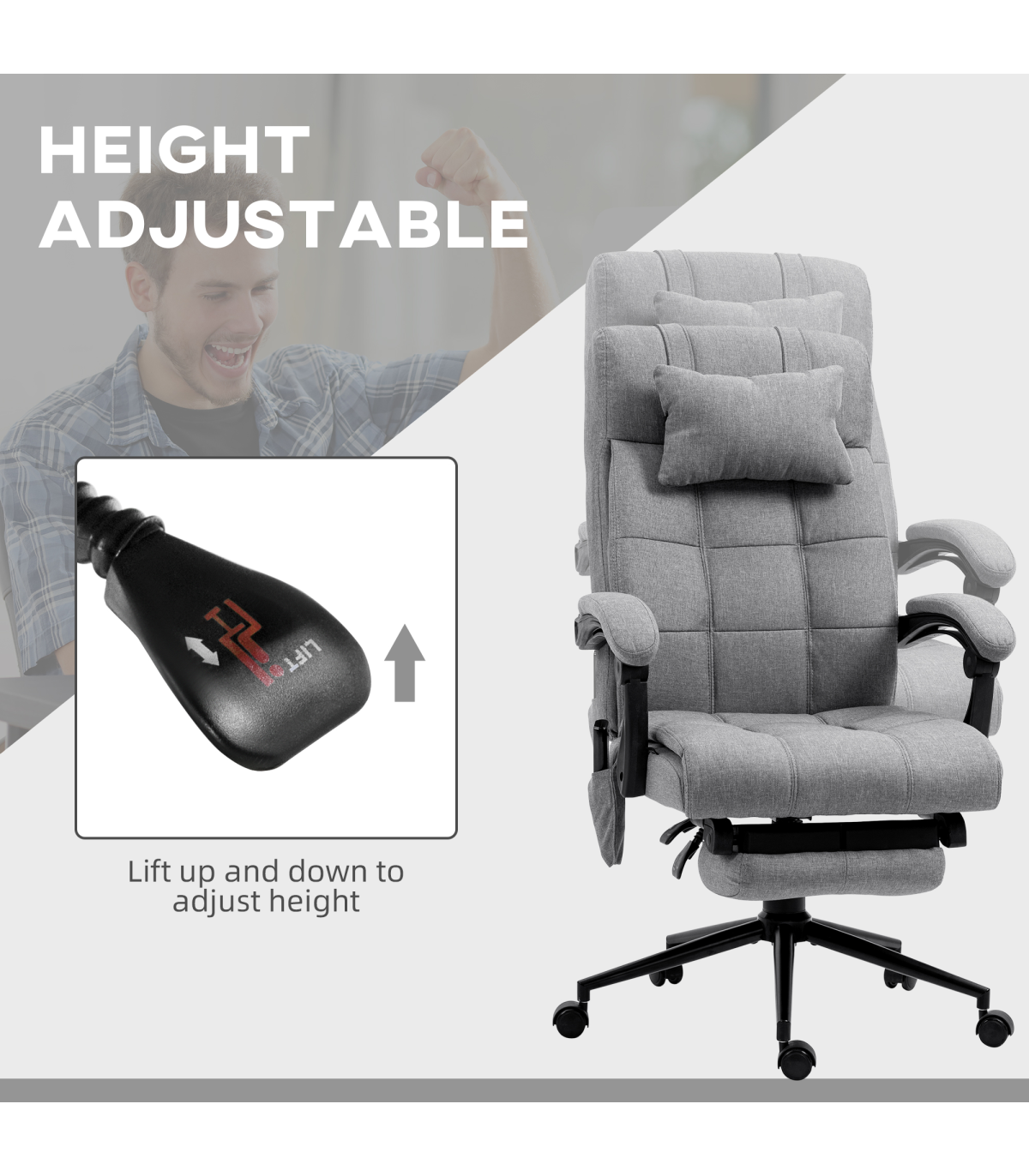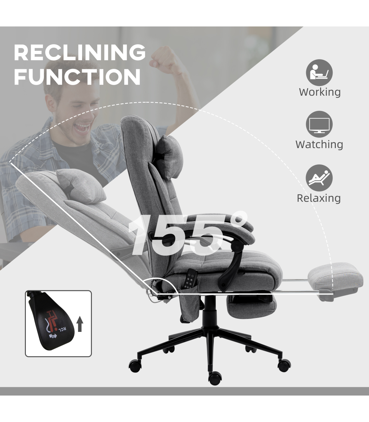- "Vinsetto Fabric Vibration Massage Office Chair with Heat, Head Pillow, Grey" - Description: - Vinsetto Fabric Vibration Massage Office Chair with Heat, Head Pillow in Grey - Features six points: five massage modes and one lumbar heat mode - 155° reclining back and manual footrest - Padded PC chair for maximum comfort - Includes removable head pillow - Adjustable seat height from 112-120cm - Five wheels for easy movement - Maximum load capacity of 120kg - Assembly required