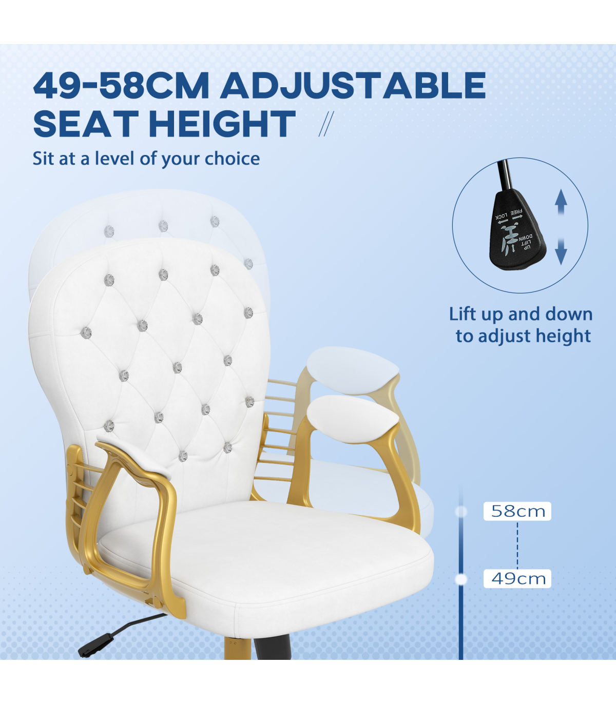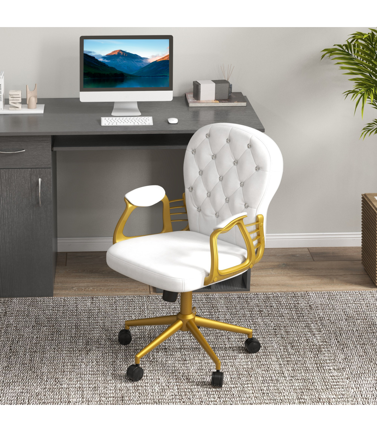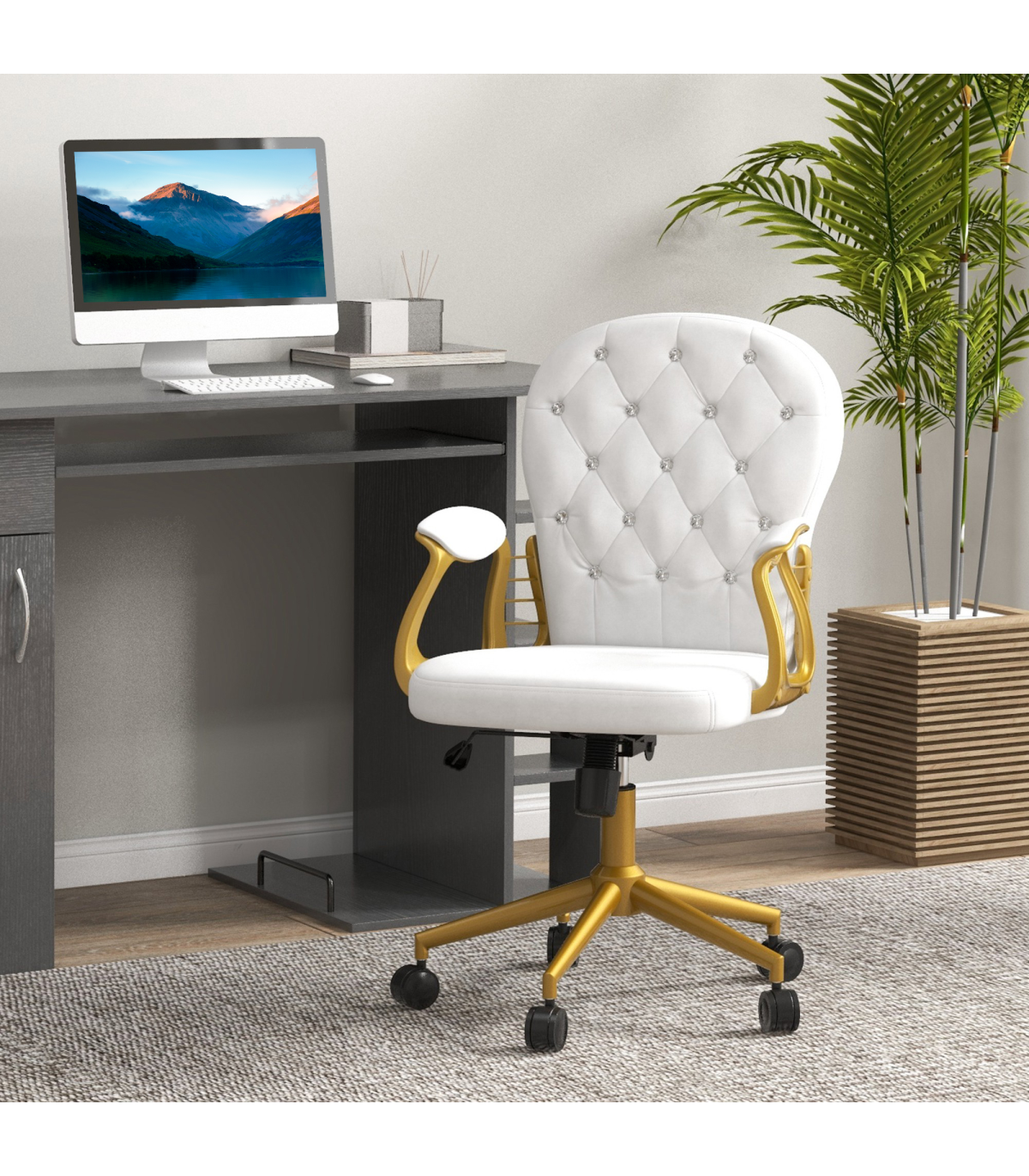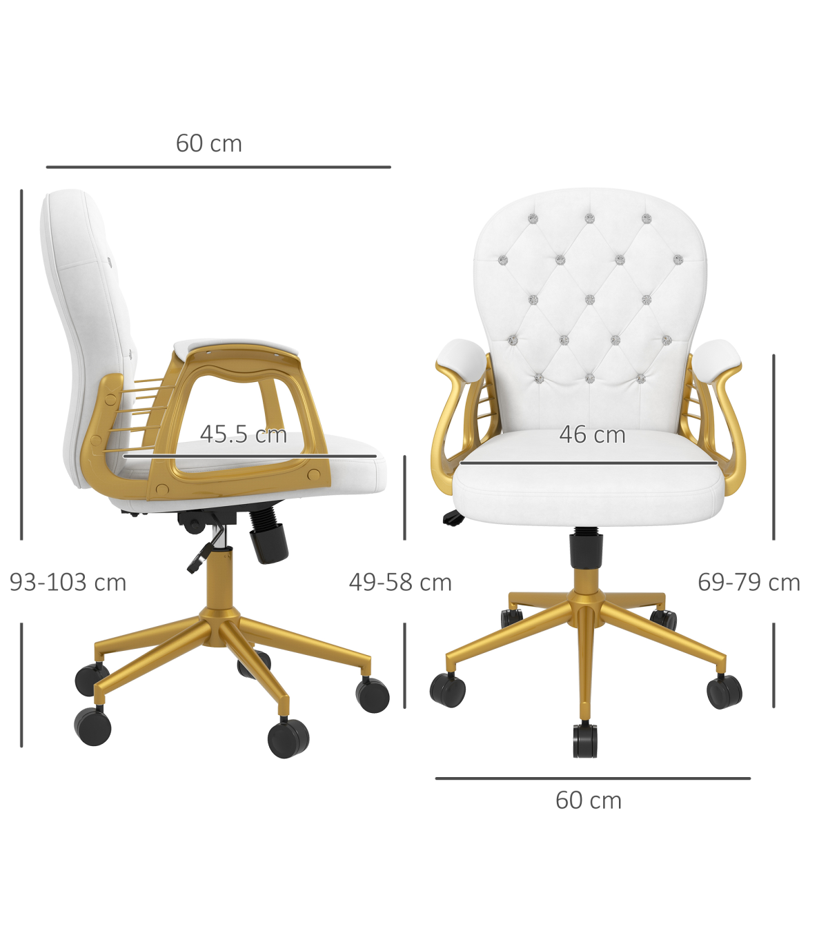 Vinsetto Home Office Chair Button Tufted Desk Chair with Swivel Wheels White Description: - Polished design of velour upholstery with diamante tufting on the back - Frame provides stability and support up to 120kg - Plush all-over padding ensures comfort for hours on end - Ergonomic design of a high and slightly curved back, high-rise armrests and adjustable height and back tilt - 360° swivel base with five castor wheels to move around easily - Assembly required